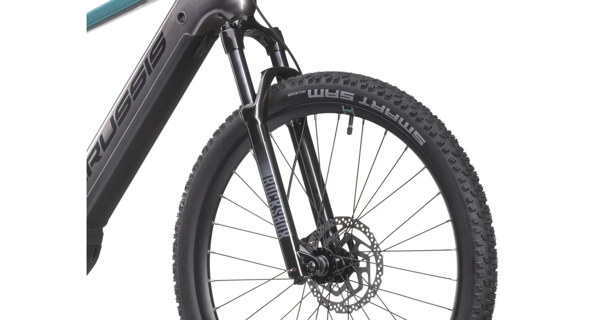 Crussis e-Atland 9.10 je vybaveno odpruženou vidlicí se vzduchovým tlumením ROCKSHOX FS Judy Silver TK Solo Air 27,5" se zdvihem 100 mm, která je skvěle přizpůsobivá váze cyklisty.