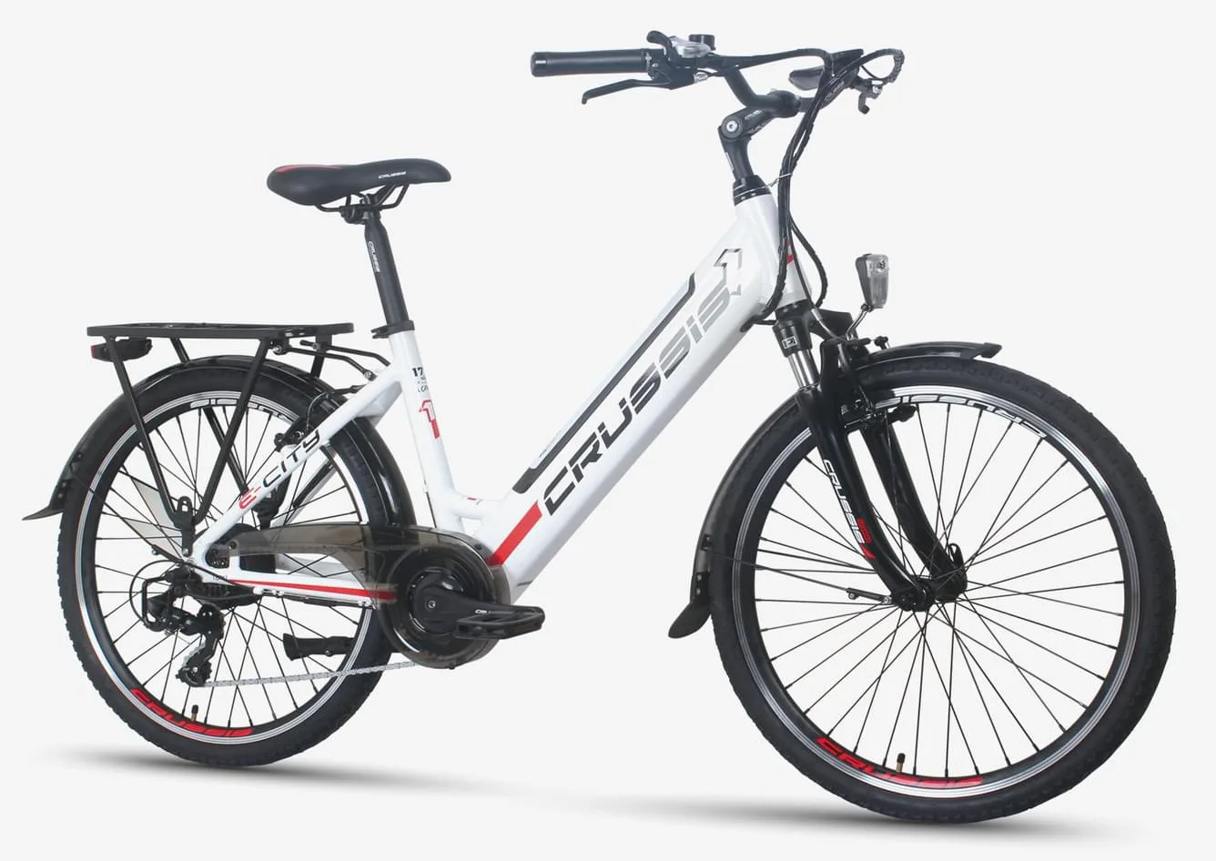 Městská elektrokola Crussis jsou vybavena předním a zadním blatníkem. Součástí e-biku je také kromě předního a zadního osvětlení rovněž zadní nosič, který je možné dovybavit brašnami nebo košíkem.