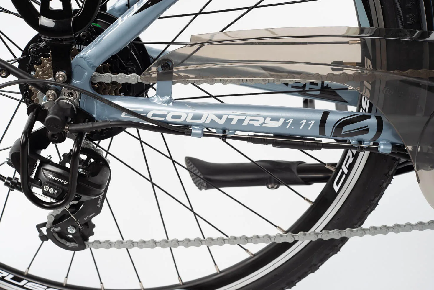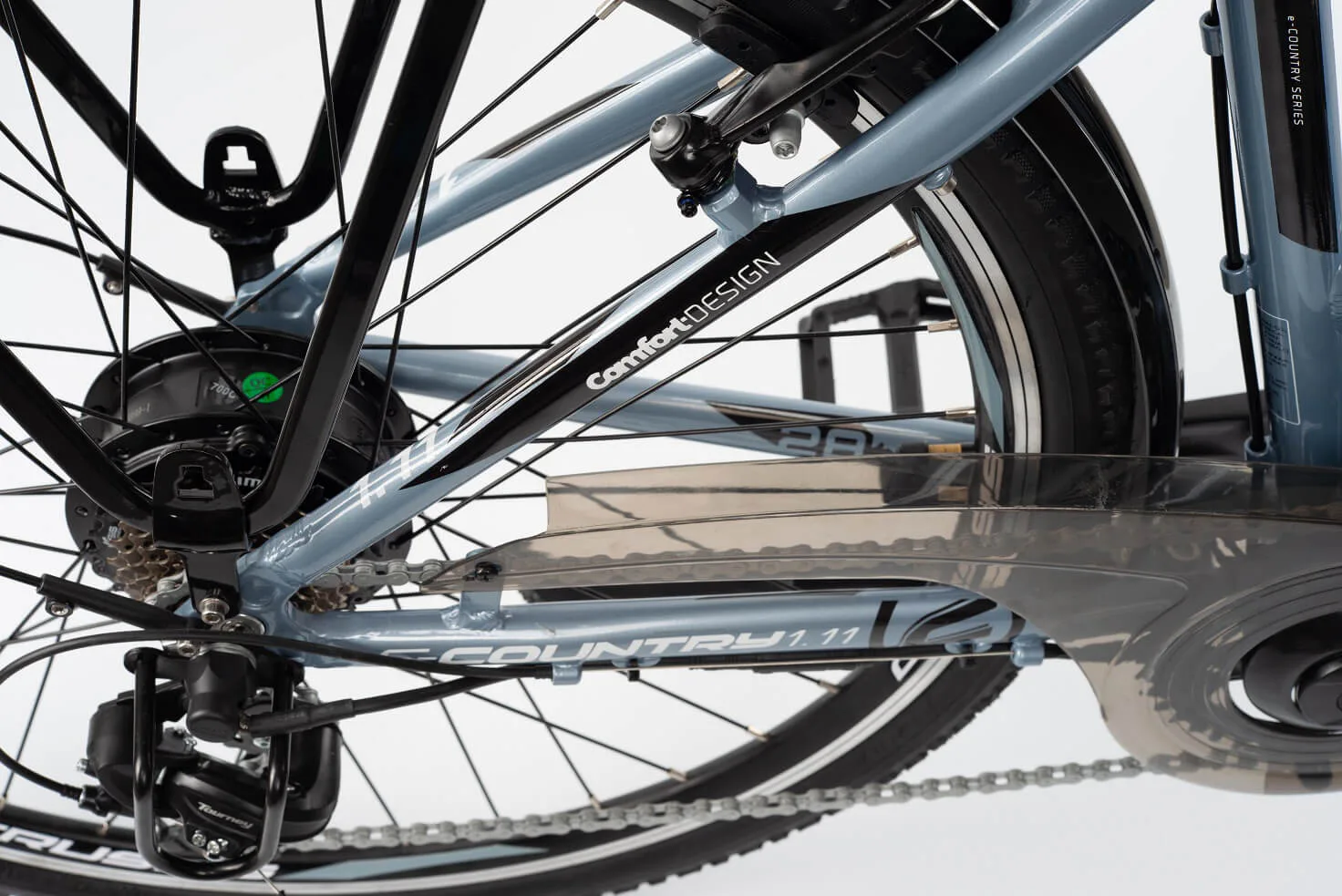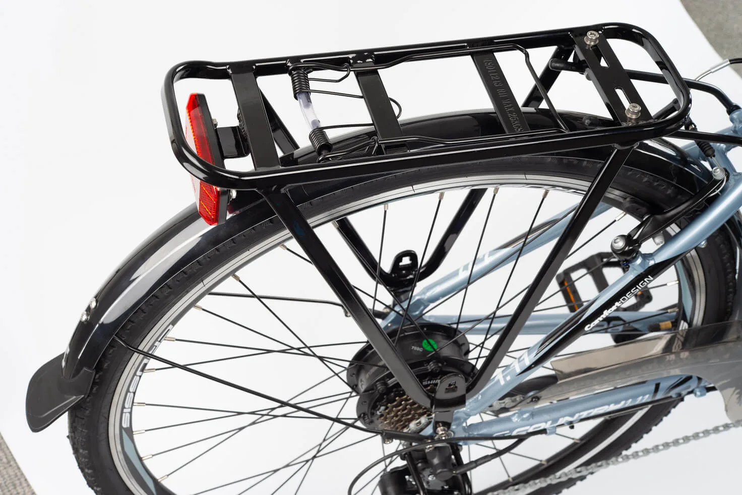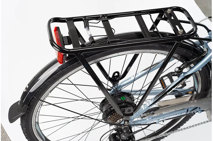 Městské kolo e-Country 1.11 je vybaveno předním i zadním blatníkem. Součástí je zadní nosič, který lze vybavit brašnou nebo košíkem.