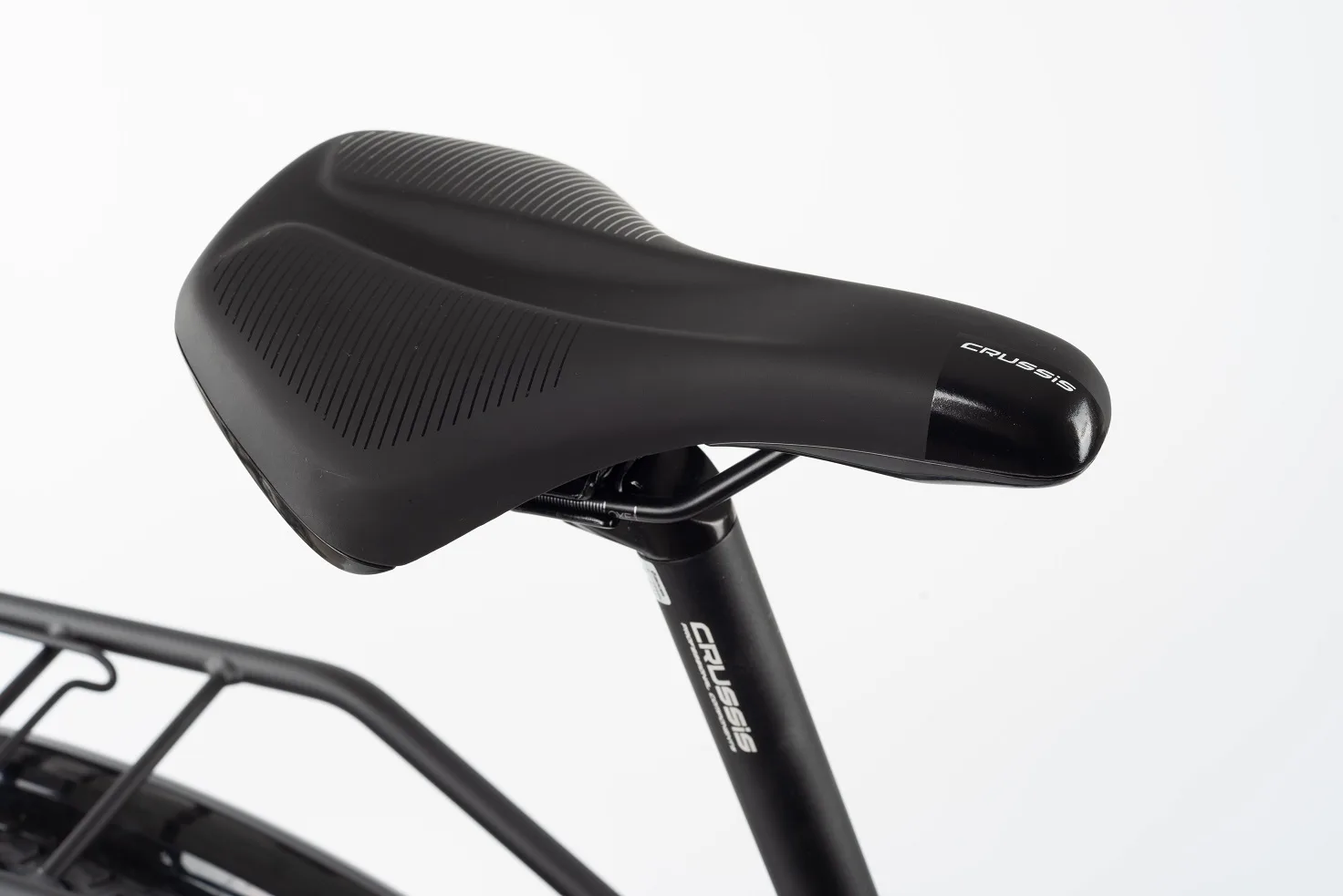 CRUSSIS e-Savela 7.7 je vybaveno odpruženou vidlicí s pružinovým tlumením SUNTOUR NEX HLO DS 700c se zdvihem 63 mm, která je skvěle přizpůsobivá váze cyklisty.