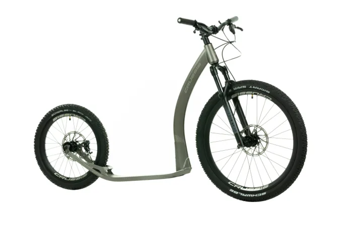 Unikátní hliníkový rám koloběžek Crussis ONE CROSS byl vyvinut tak, aby se zadní vidlicí tvořil jeden celek. To eliminuje únavové lomy v místech, kde je vidlice ke stupátku obvykle přivařena. Kónický tvar hlavové trubky spolu s trojúhelníkovým profilem krku zvyšuje pevnost rámu.
