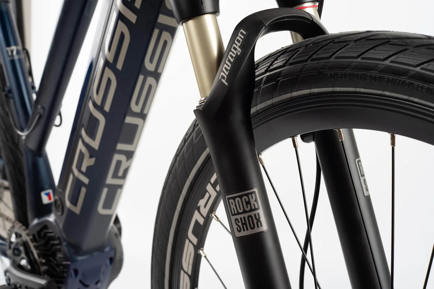 Crussis ONE-Cross lady 9.7 je vybaveno odpruženou vidlicí s pružinovým tlumením ROCKSHOX FS Paragon Gold RL R Solo Air 700c se zdvihem 65 mm, která se skvěle přizpůsobí váze cyklisty. Jednoduchým systémem si změníte tlak vzduchu ve vidlici a e-bike plně přizpůsobíte vaší váze a stylu jízdy.