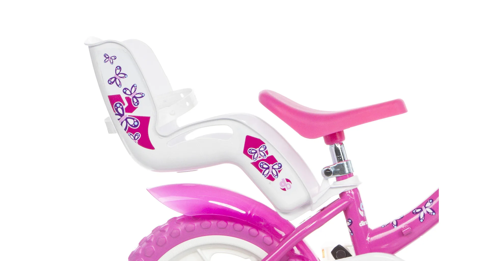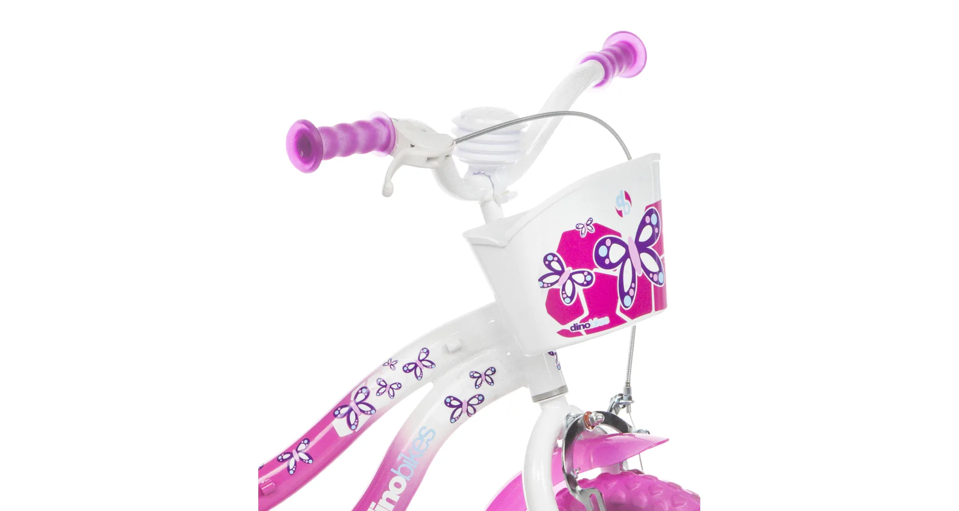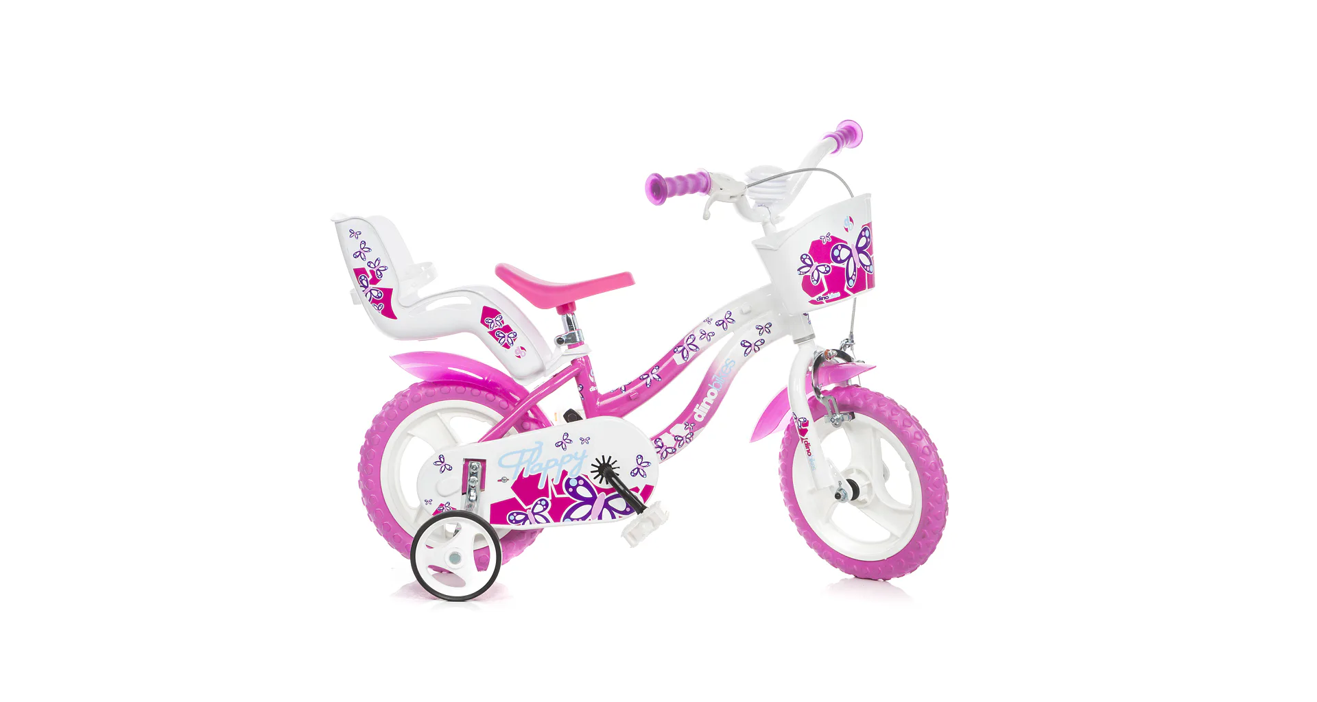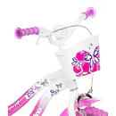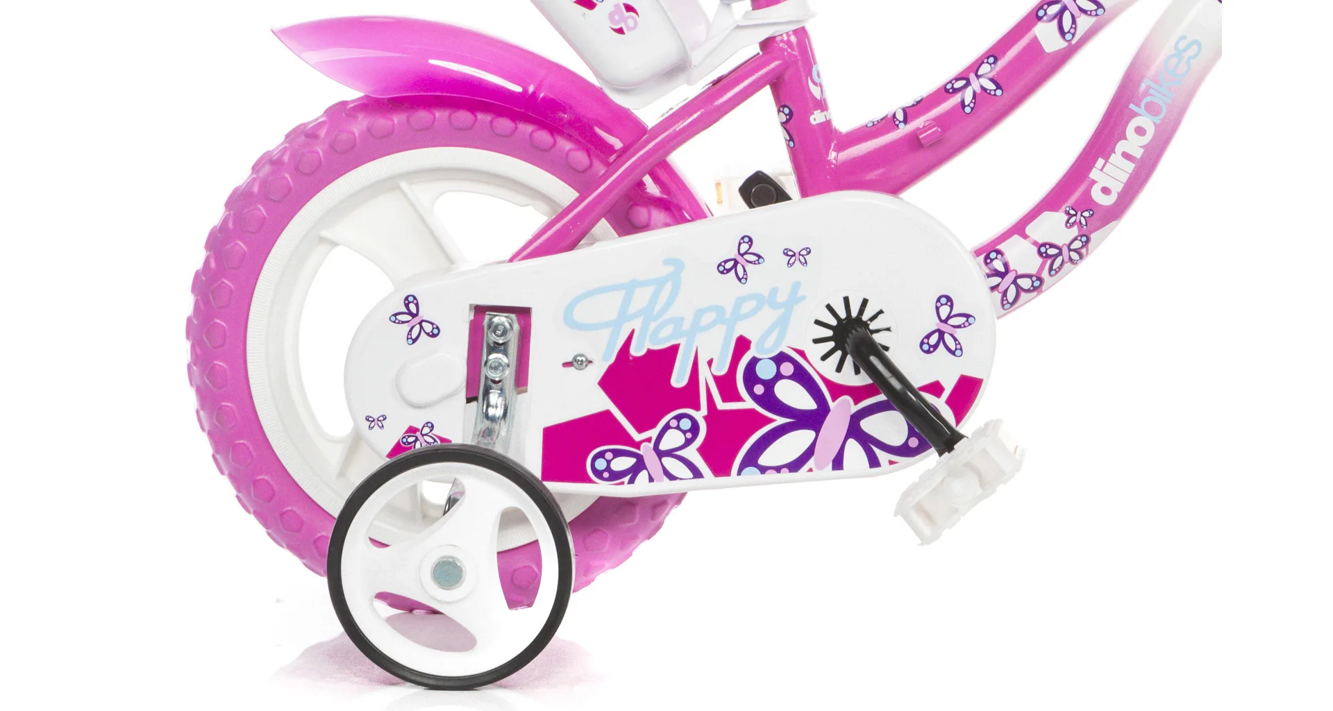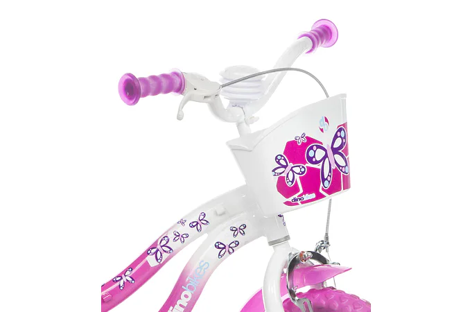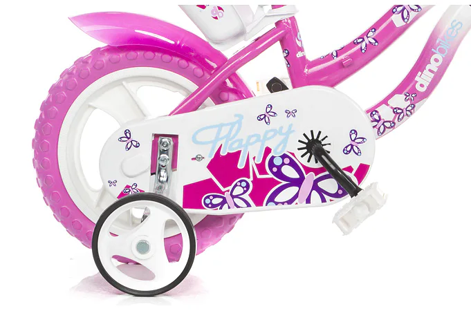 Detský bicykel Dino Bikes s potlačou FLAPPY sa vyznačuje prepracovaným dizajnom dávajúcim bicyklu efektný vzhľad v bielo-ružovej variante.