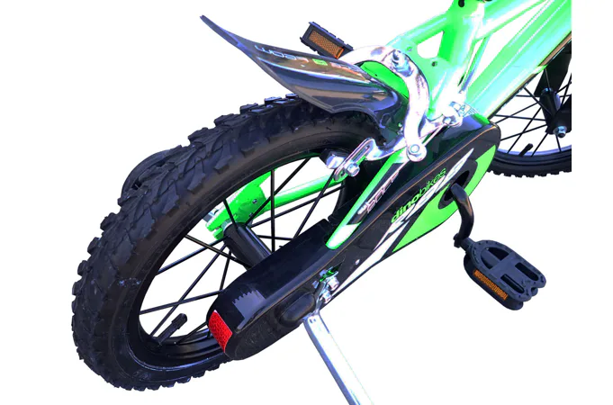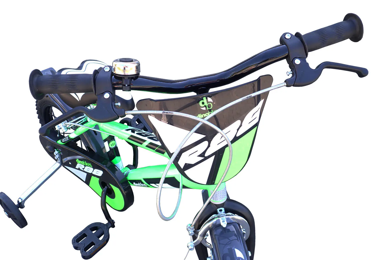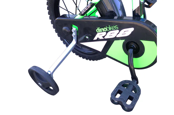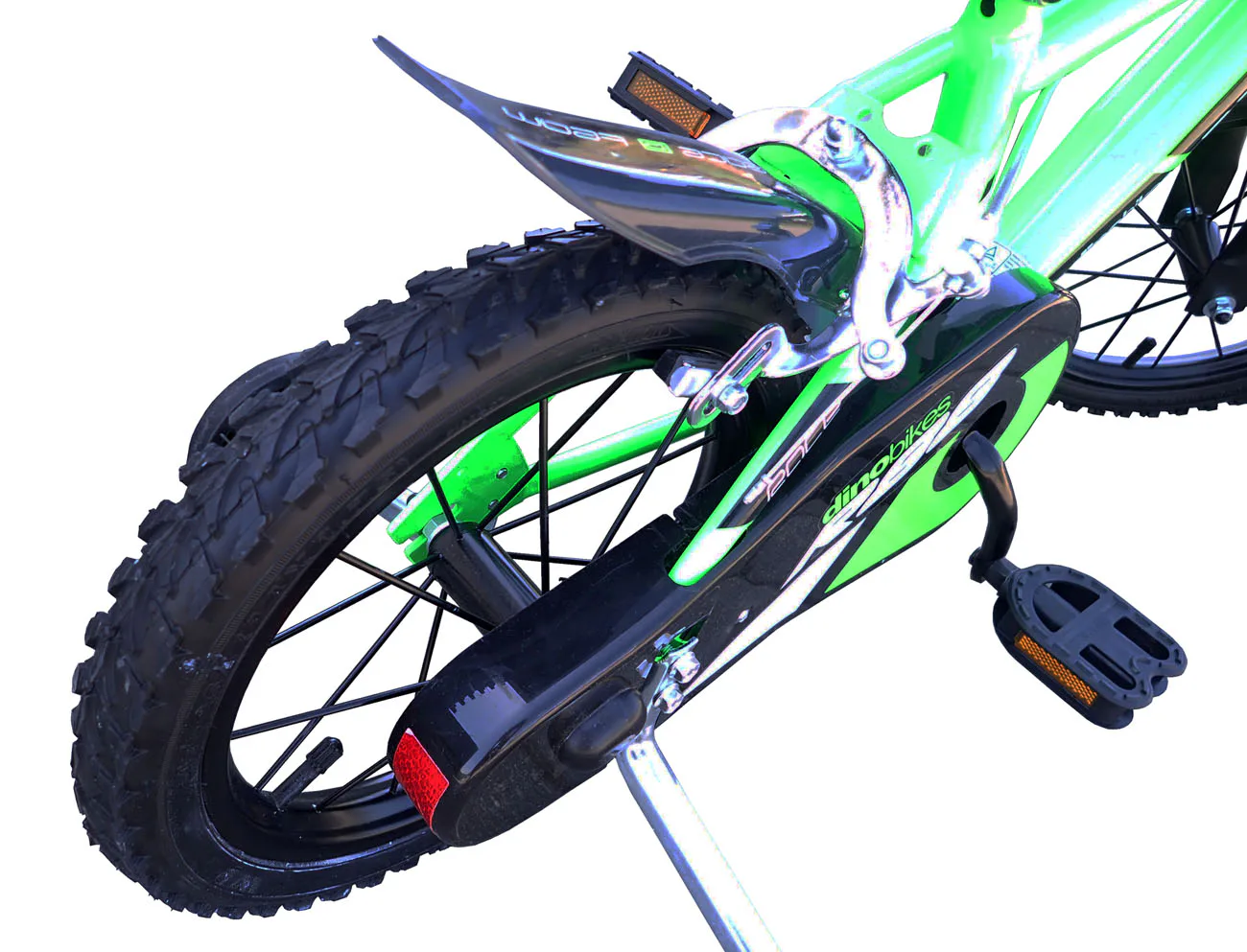 Detský bicykel Dino Bikes 414U má plastové ráfiky 14" (palcov = 36,5 cm), nafukovacie plášte, voľnobeh a je vybavený prednou aj zadnou čeľusťovou brzdou.