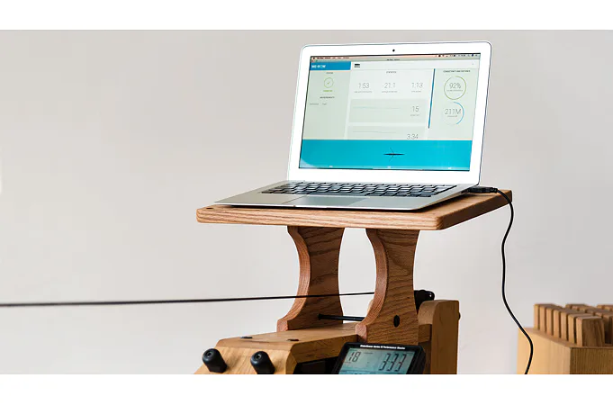 Drevený držiak na notebook k trenažéru WaterRower. Držiak na bezpečnostnú hranu, ktorá zabraňuje skĺznutiu notebooku. K dispozícii je polstrovaný slot pre tablety. K dispozícii z dreva rôznych druhov (jaseň, orech, čerešňa, dub a v prevedení "Club" a "Shadow")