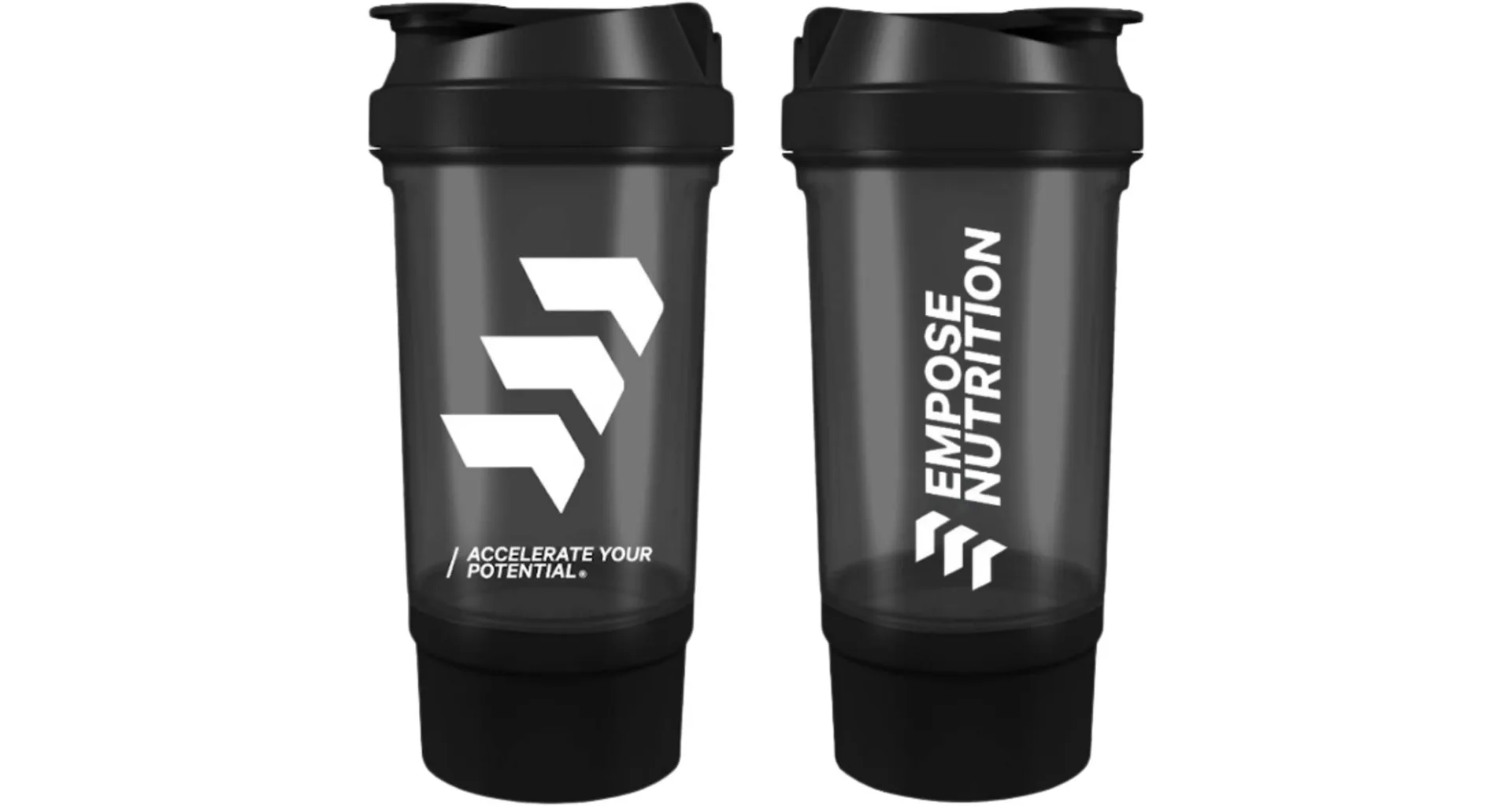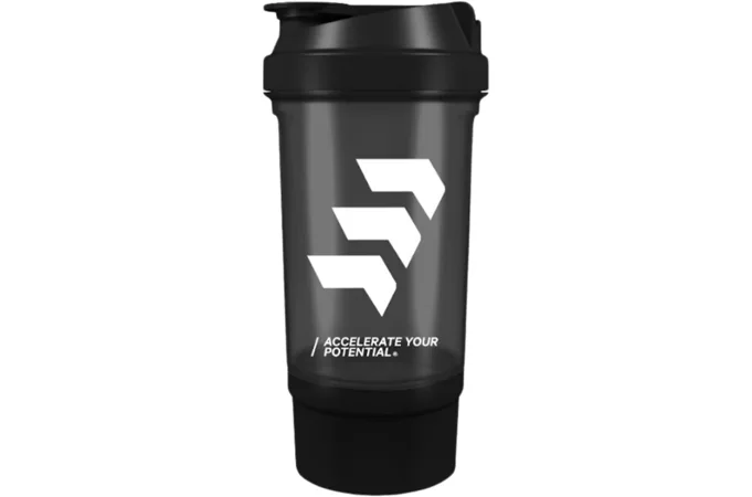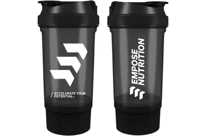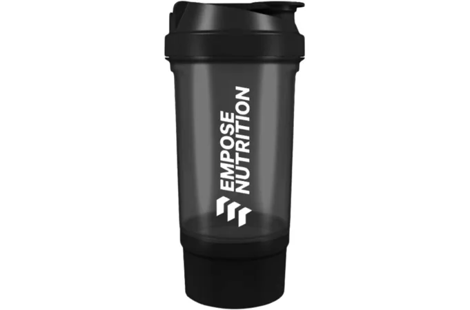 EMPOSE Shake Beker je praktický dvojdielny šejker na prípravu koktailov so zaklapávacím uzáverom. Objem šejkra je 500 ml s priestorom na práškové doplnky výživy (150 ml). Spodná časť slúži na prášok, tablety a kapsule, vrchná na prípravu nápoja. Mriežka zabezpečuje kvalitné premiešanie koktailu.