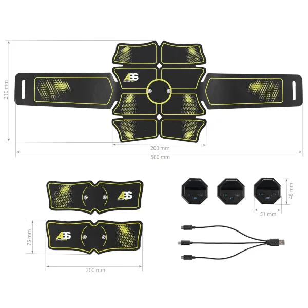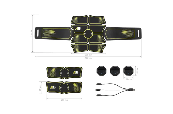Riadiaca jednotka je vybavená LCD displejom, ktorý zobrazuje aktuálny režim stimulácie a jeho intenzitu. Pod displejom sa nachádzajú 3 tlačidlá pre zmenu režimu stimulácie a pre úpravu jej intenzity. Jednotka umožňuje nastaviť celkom 10 režimov stimulácie a 20 úrovní intenzity. Vstavaná batéria sa dobíja pomocou microUSB kábla (súčasťou dodávky) z bežne dostupnej nabíjačky. Veľká elektróda na stimuláciu brušných svalov má rozmery 58 x 21 centimetrov a tvorí ju 10 stimulačných plôch s gélovým vankúšikom. Malé elektródy majú rozmer 20 x 7,5 centimetra a tvoria ich 2 stimulačné plochy s gélovým vankúšikom.