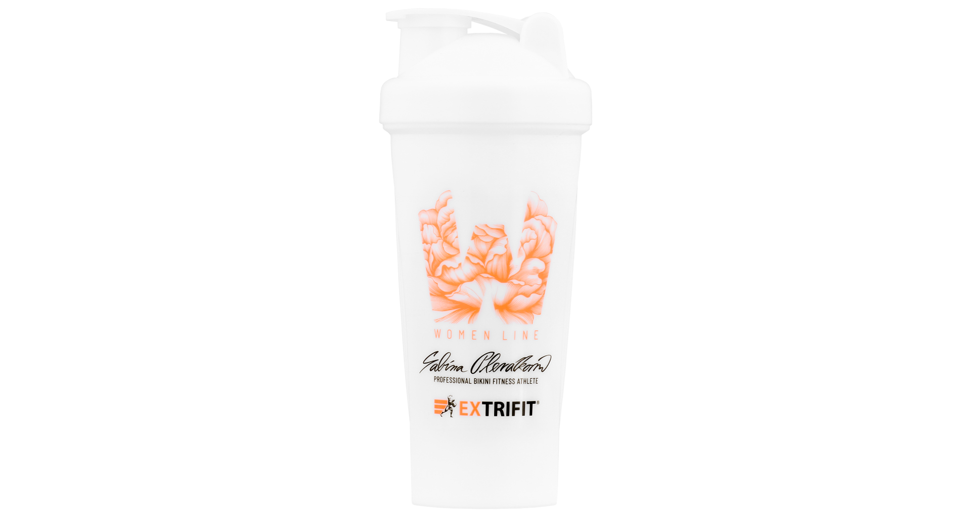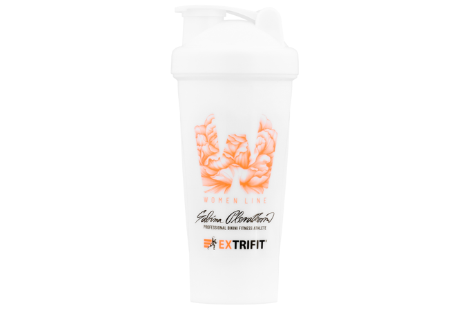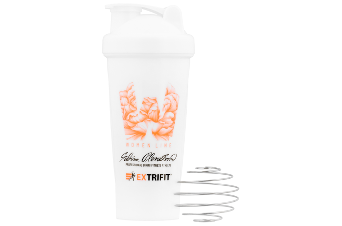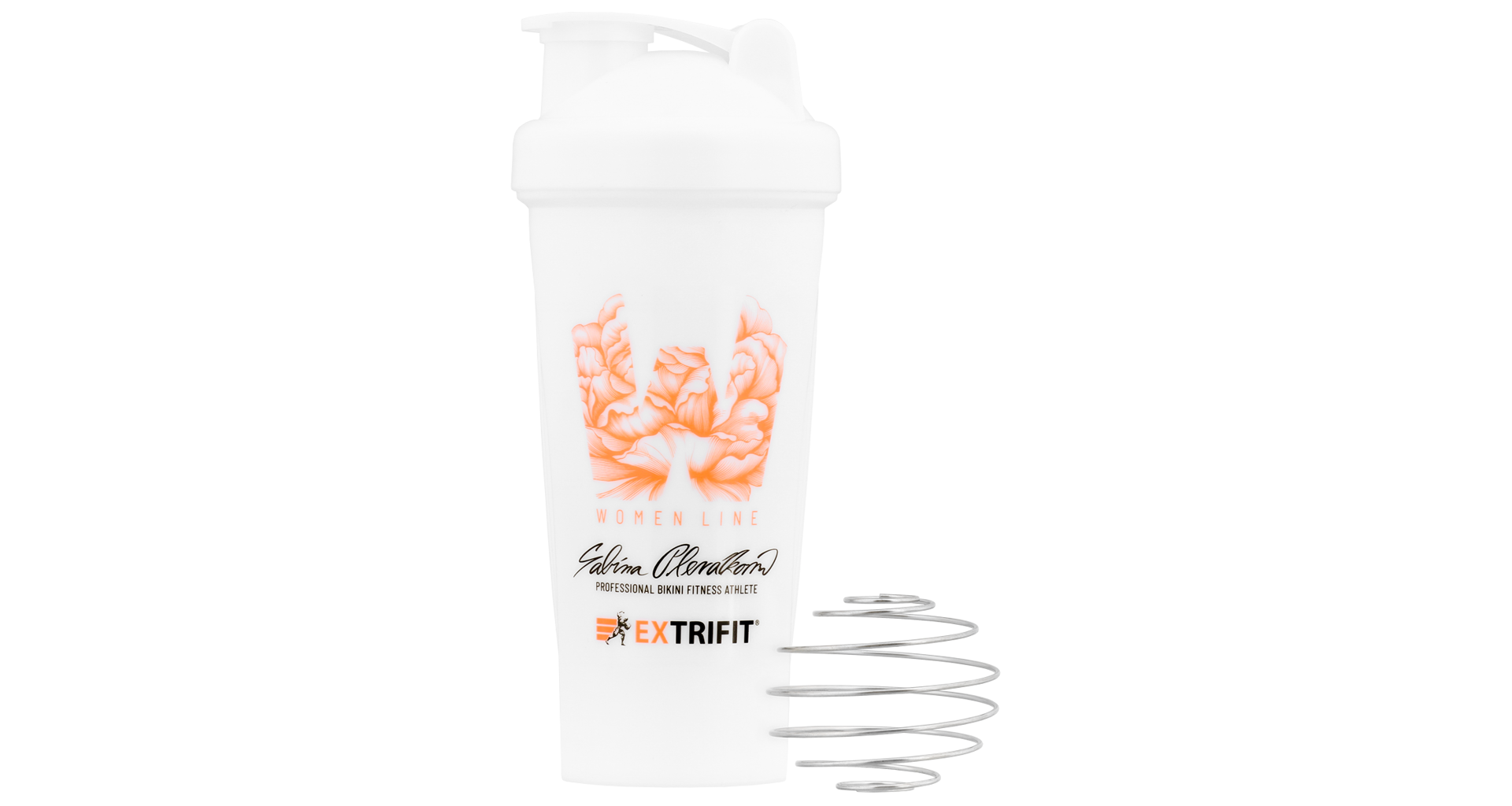 EXTRIFIT Shaker Women Line bielej farby s objemom 600 ml, štíhly, smerom ku dnu sa zužuje. Uzáver šejkra je skrutkovací, malé viečko je zaklapávacie. Po stranách sú protišmykové tvarované časti, takže sa šejker dobre drží. Vzadu nájdete rysky v ml/oz na odmeranie a priehľad pre vizuálnu kontrolu náplne, vpredu je znak Women Line, logo Extrifit a podpis Sabiny Plevákovej. Šejker obsahuje pružinovú guľôčku na lepšie rozmiešanie nápoja. Obsah cez kvalitne vyriešené skrutkovanie nepreteká. Náplň šejkra je vidieť cez spriesvitnený bok s mernou stupnicou. Objem šejkra zobrazený na poslednej ryske je 600 ml. Nádoba matná, jemne transparentná, bok priehľadný. Uzáver a malé viečko farby bielej. Na prednej strane lesklý znak Women Line, logo Extrifit a podpis Sabiny Plevákovej.