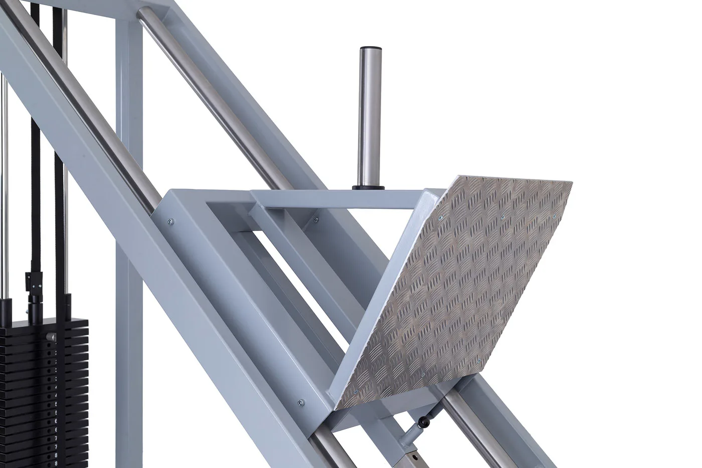 Najväčšou výhodou tohto leg pressu je pásový prevod záťaže a kombinácia záťažových blokov a kotúčov (Vyobrazené kotúče nie sú súčasťou dodávky).
