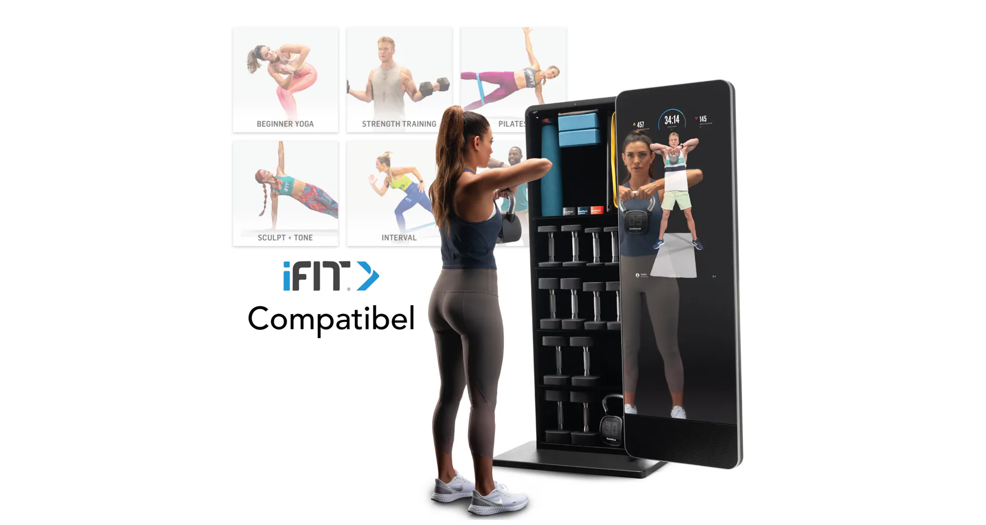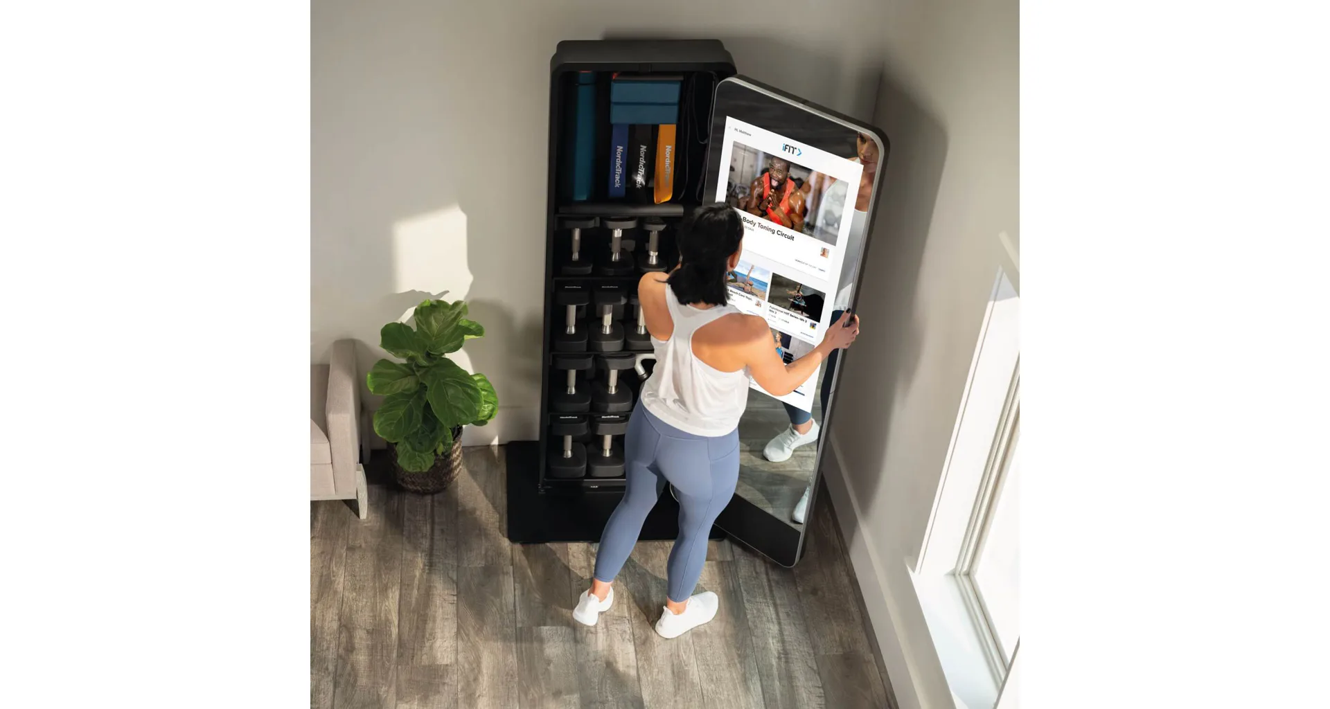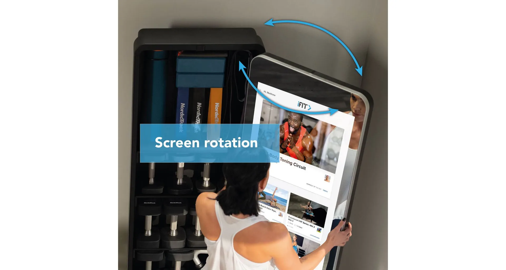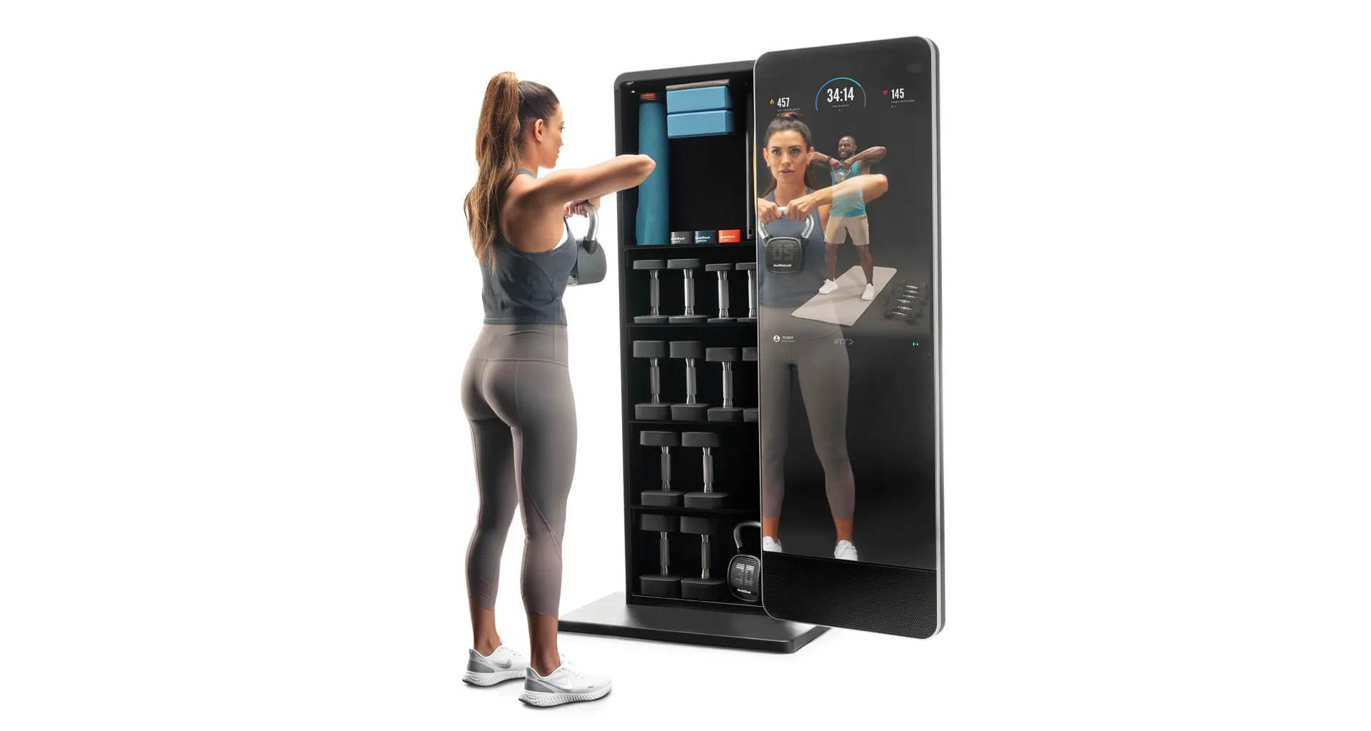 Valut má 32" dotykový displej s přístupem k široké škále iFit tréninků, aby vaše cvičení bylo efektivnější a zábavnější. Celé zrcadlo je otočné o 180° a za ním je prostor s policemi, kam můžete úhledně uložit všechny cvičební pomůcky a šetříte tak váš obytný prostor.