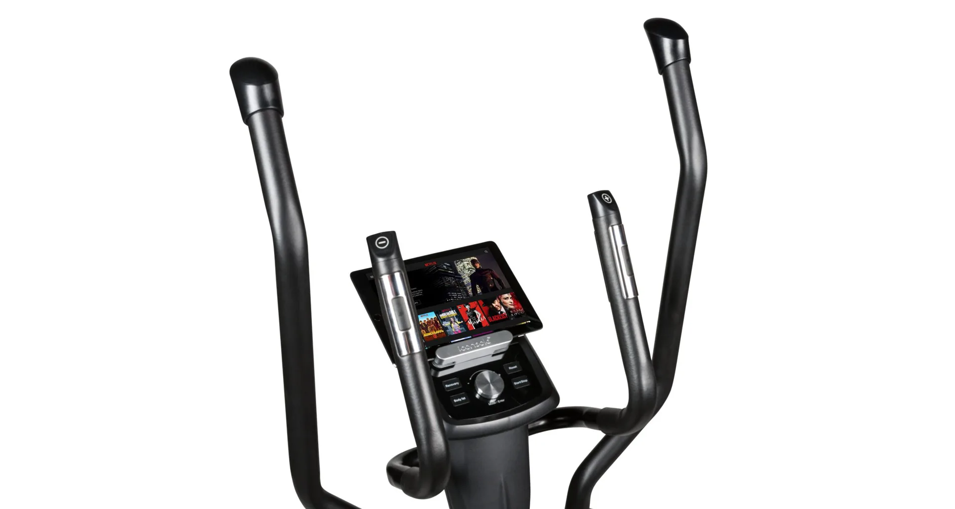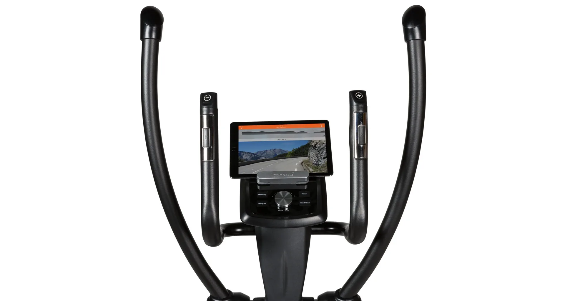 Informace potřebné v průběhu cvičení můžete sledovat na přehledném počítači s bohatou nabídkou programů. Dále trenažér disponuje transportními kolečky, vyrovnávači nerovnosti a držákem na lahev.