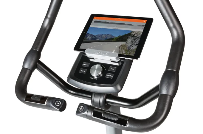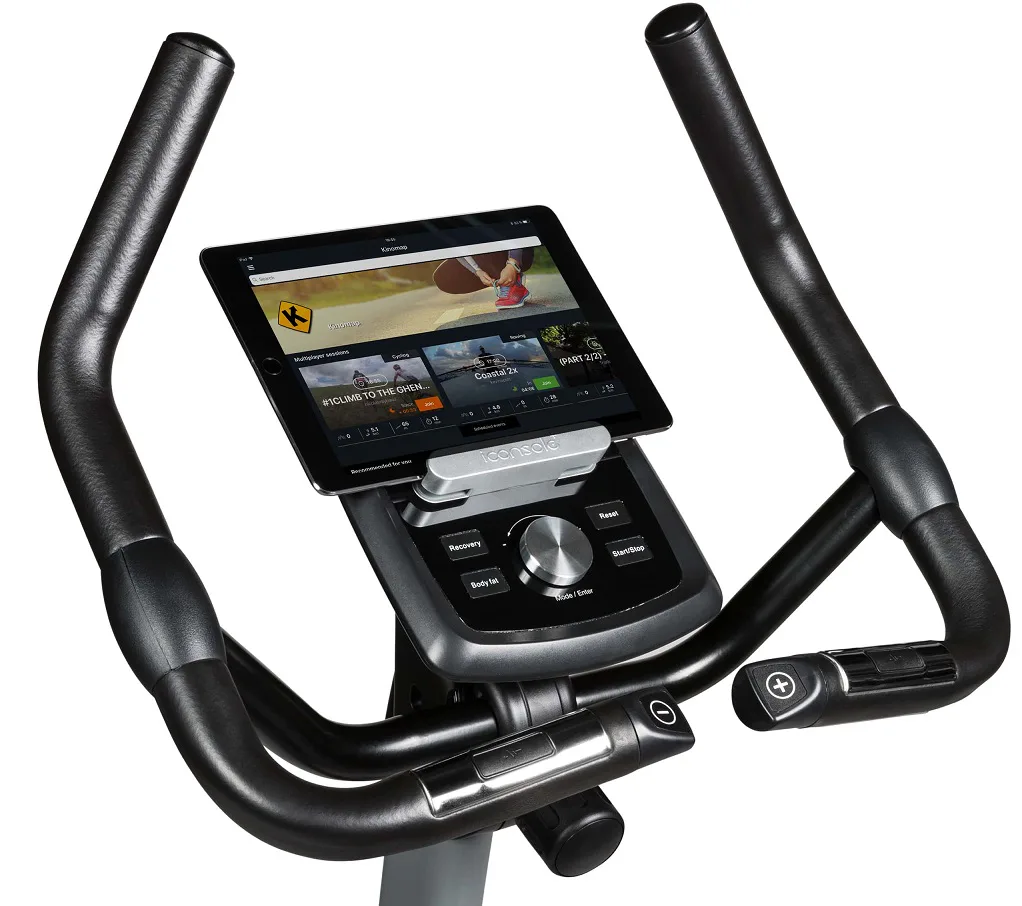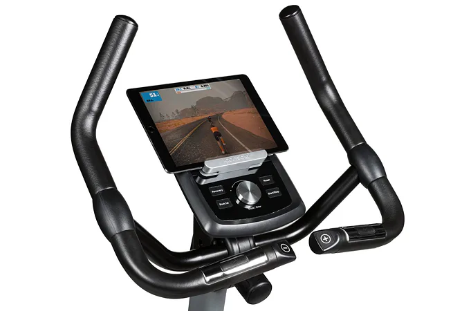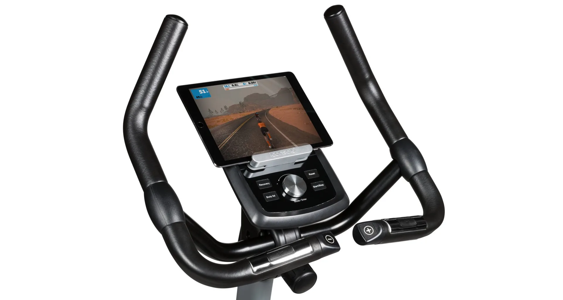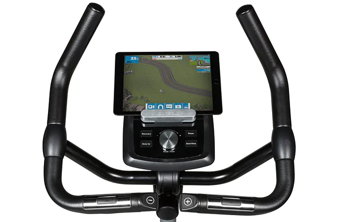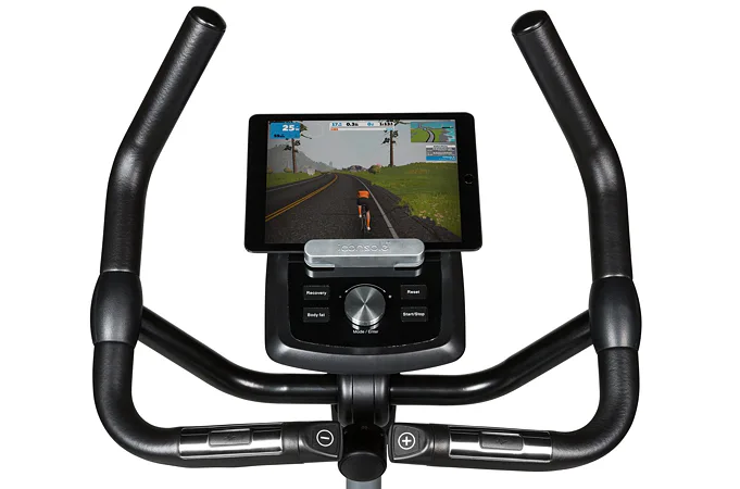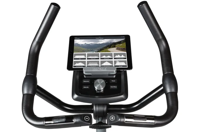 Součástí výbavy Flow Fitness DHT2500i je počítač s držákem na tablet/smartphone a bluetooth přijímačem, transportní kolečka, vyrovnávače nerovnosti, držák na lahev a věšák na ručník.