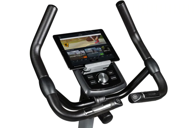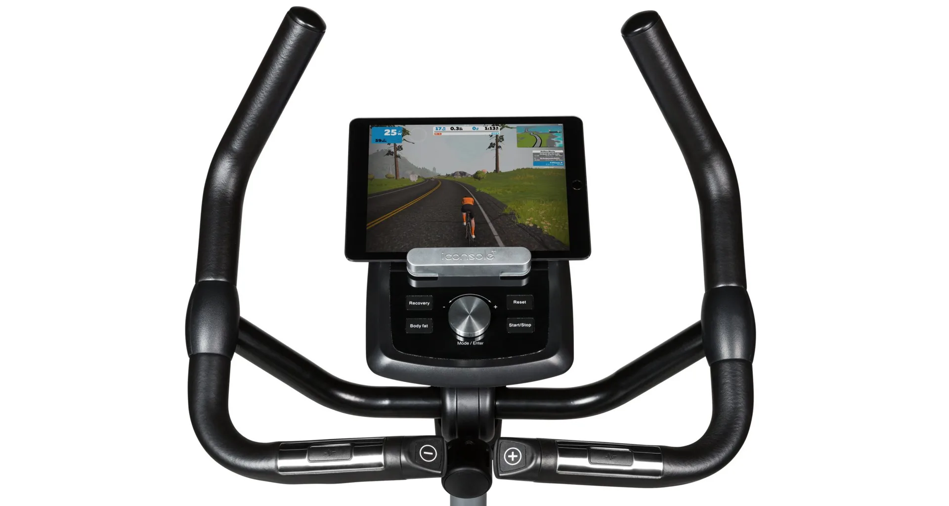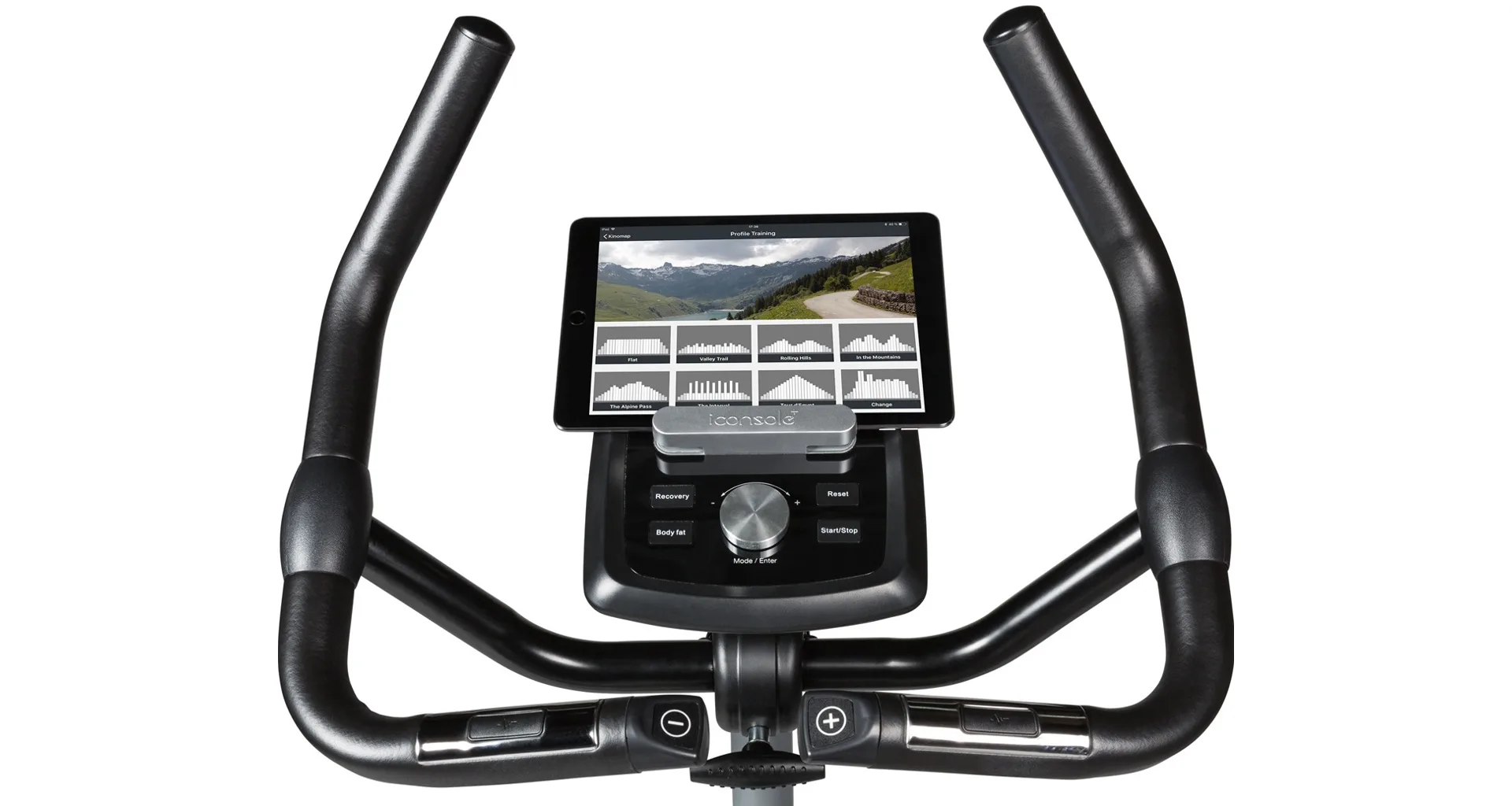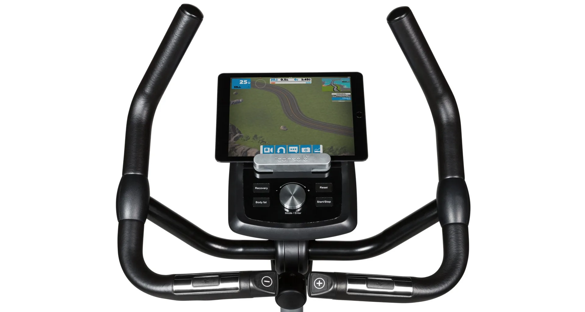 Součástí výbavy Flow Fitness DHT2500i je počítač s držákem na tablet/smartphone a bluetooth přijímačem, transportní kolečka, vyrovnávače nerovnosti, držák na lahev a věšák na ručník.