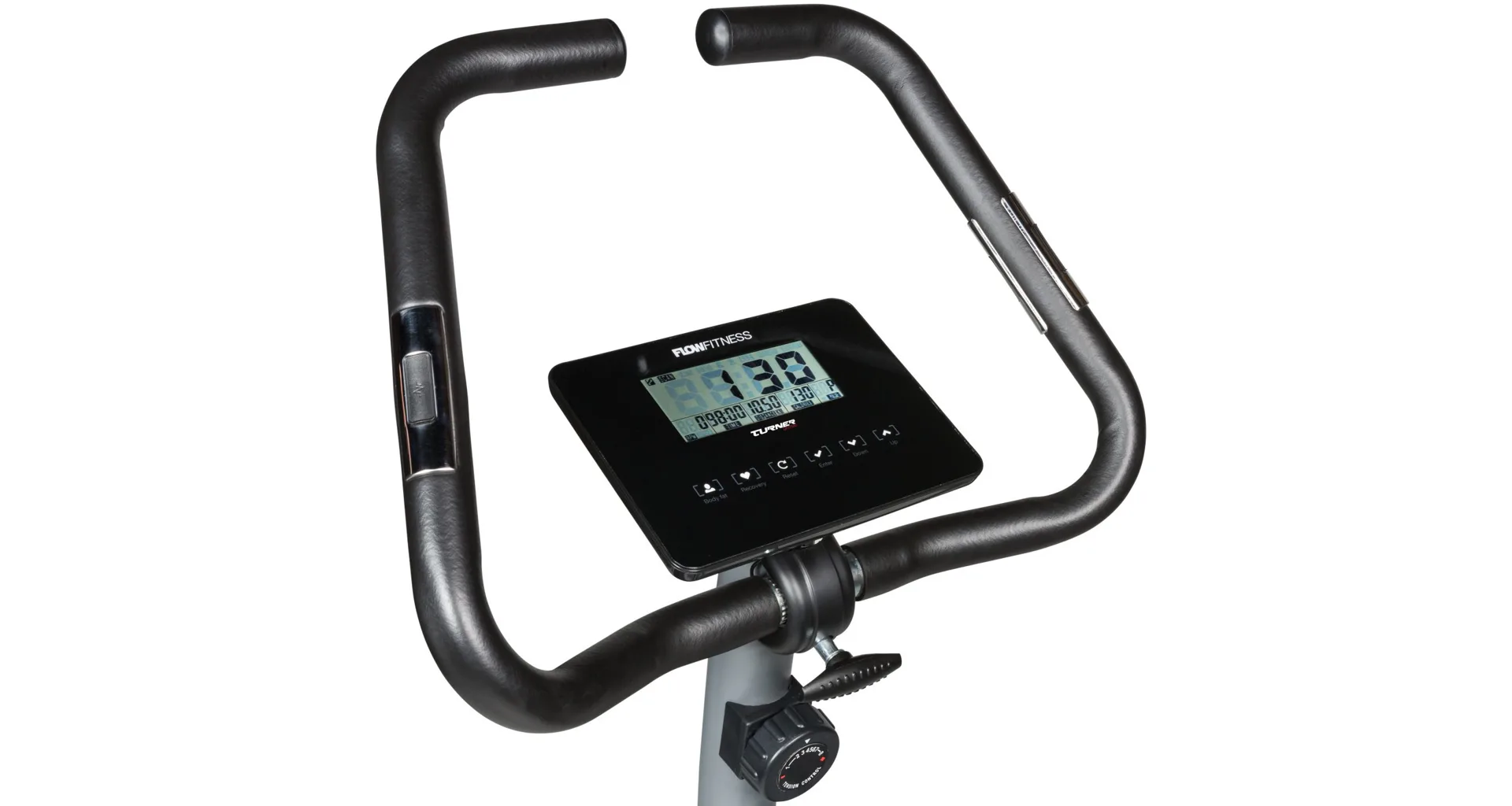 Součástí výbavy Flow Fitness DHT500 je počítač, senzory pro měření tepové frekvence, transportní kolečka, vyrovnávače nerovnosti, držák na lahev a věšák na ručník.