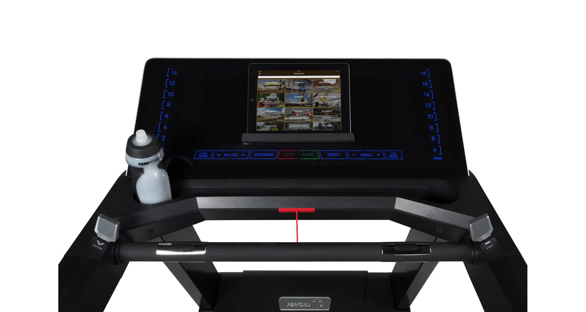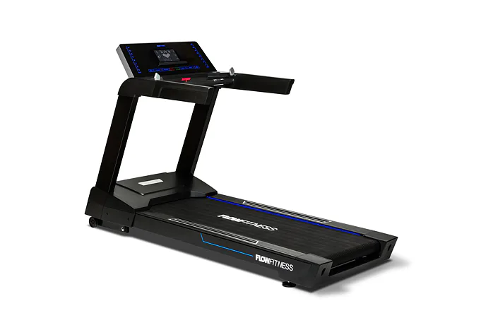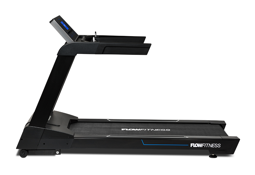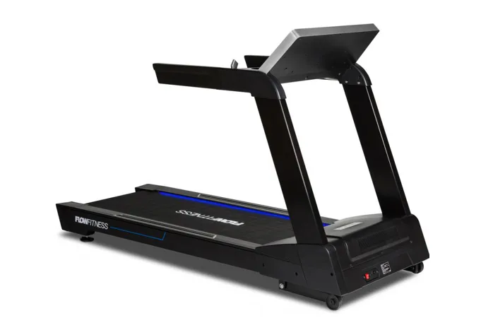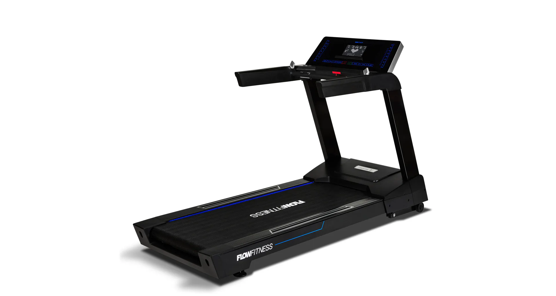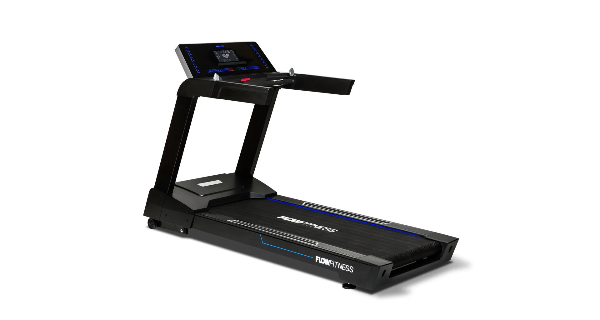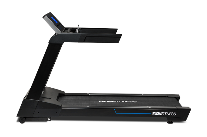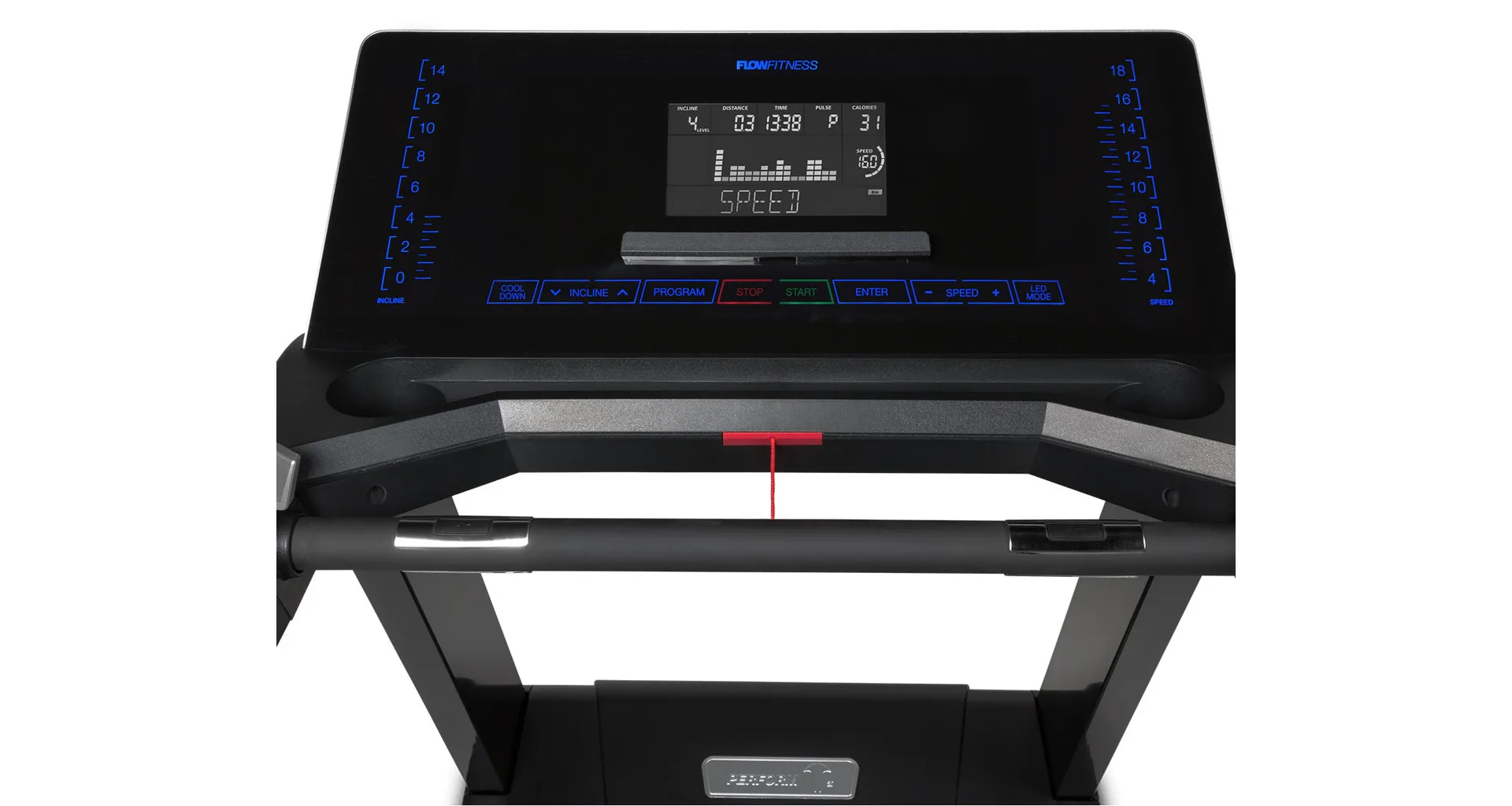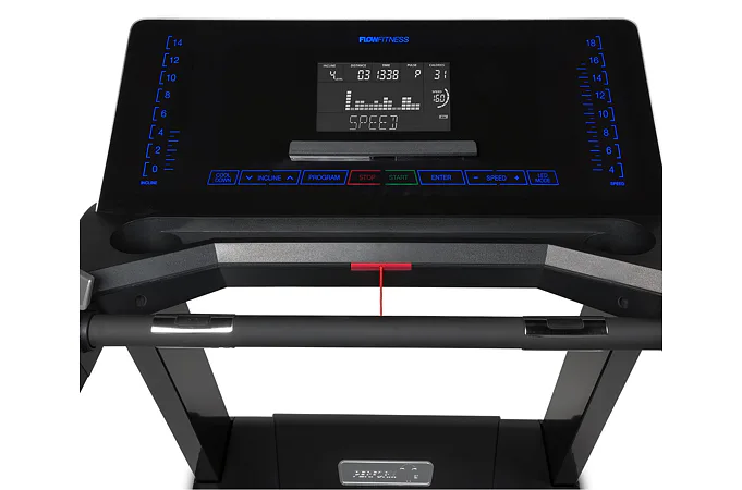 Běžecký pás Flow Fitness T3i disponuje snadno ovladatelným počítačem, dvěma držáky na lahev, senzory pro měření tepové frekvence a transportními kolečky.
