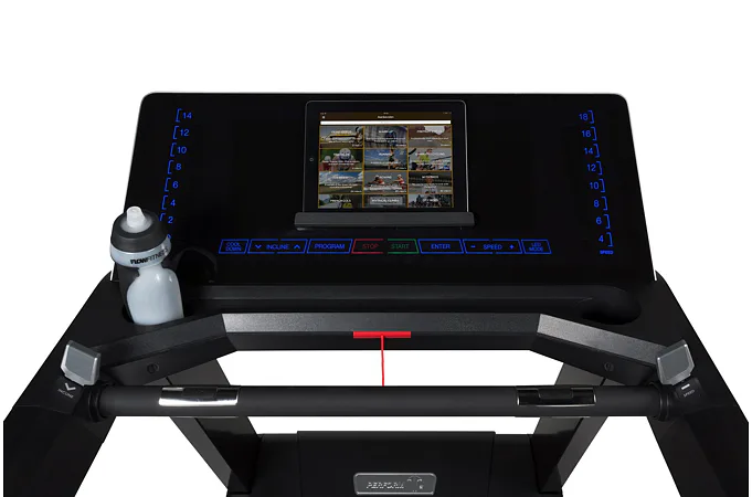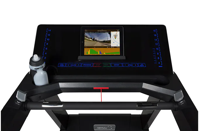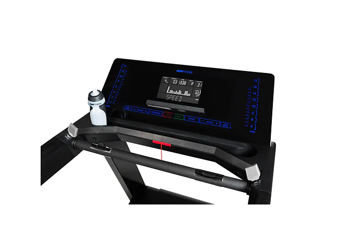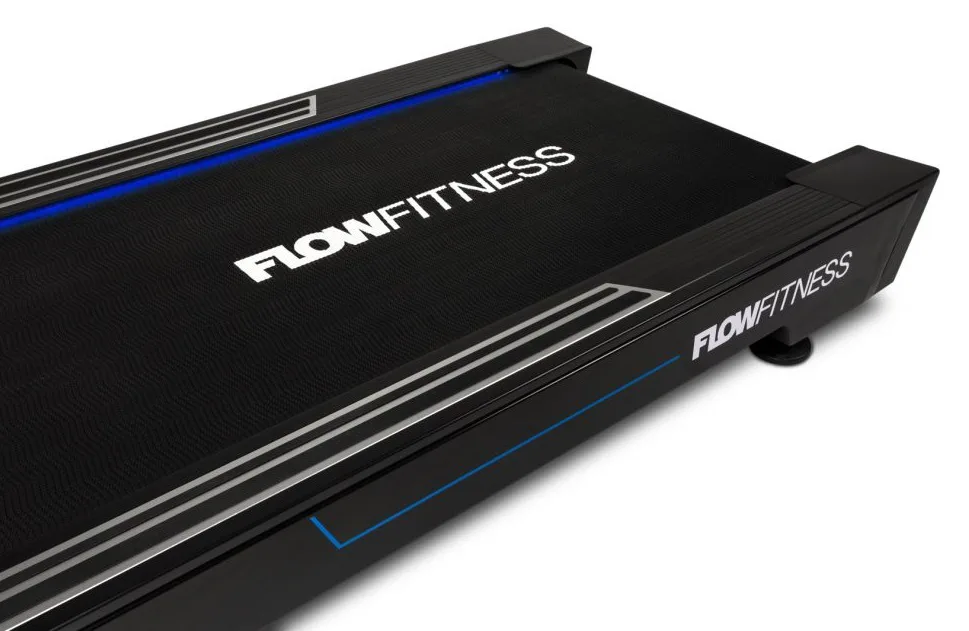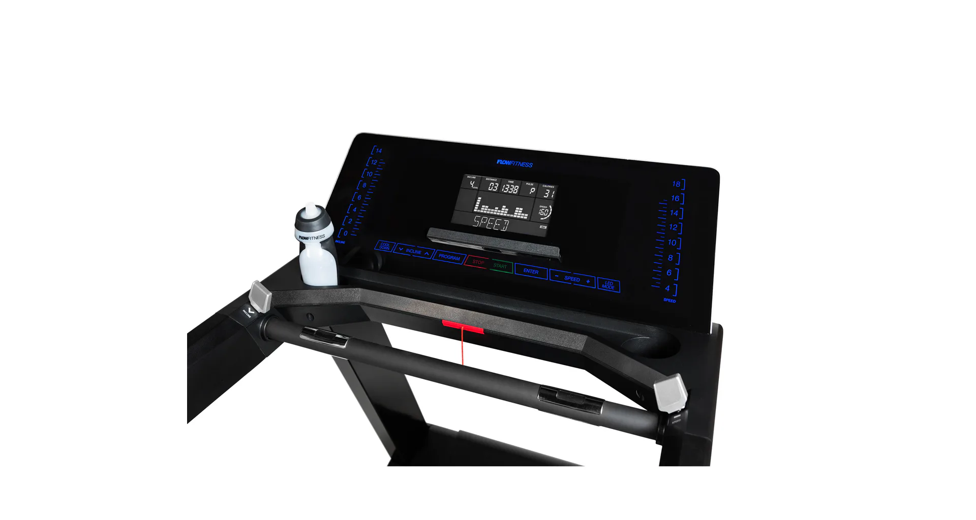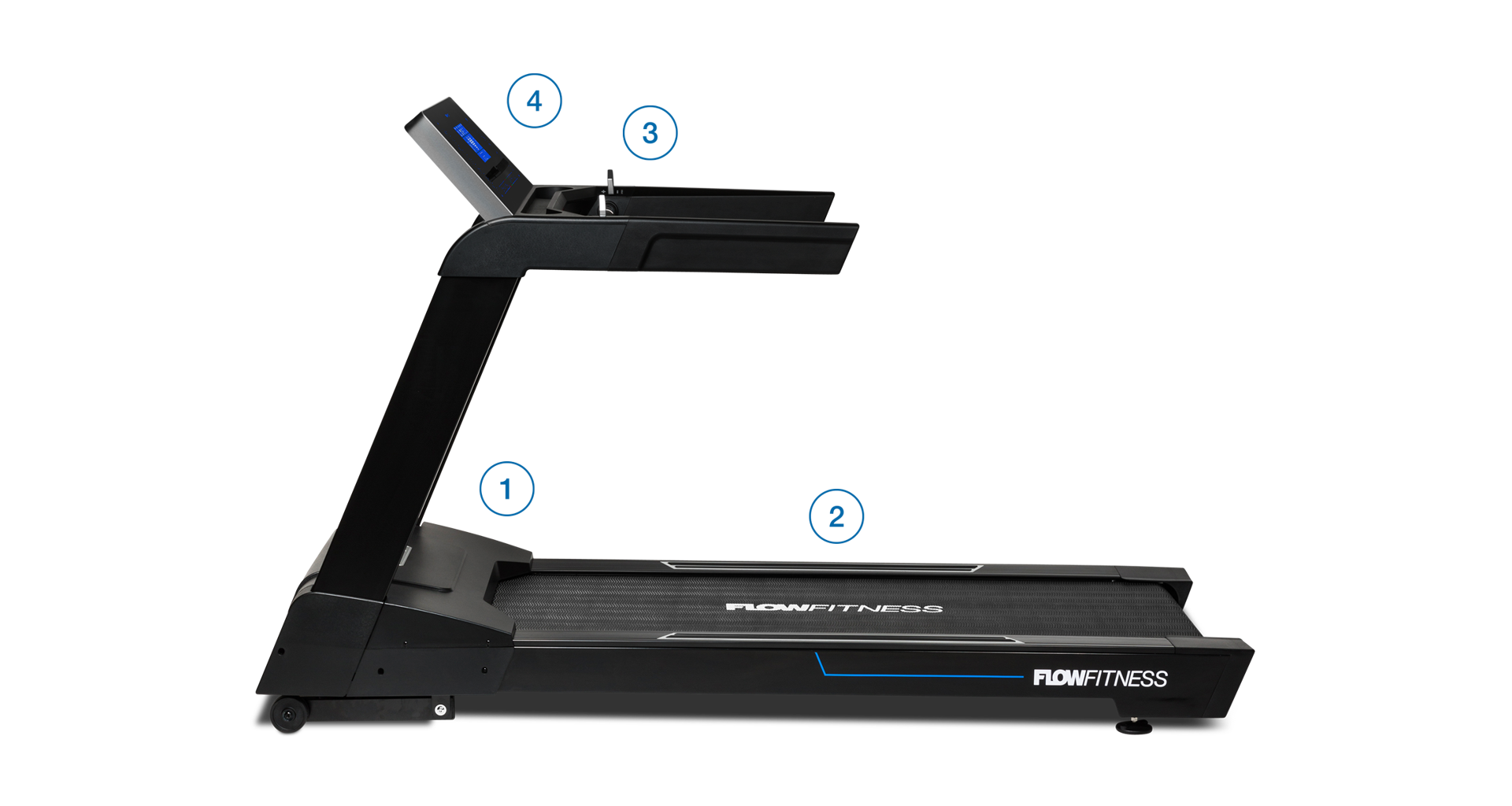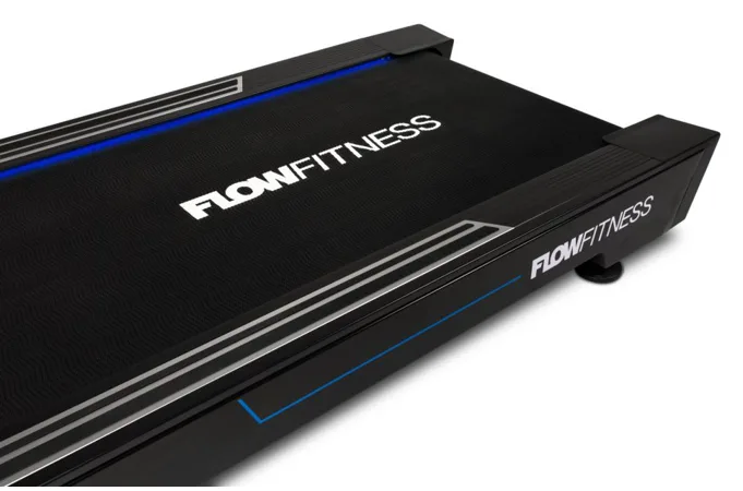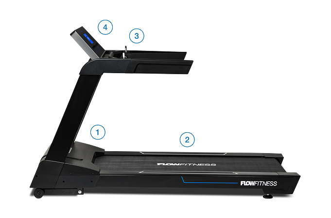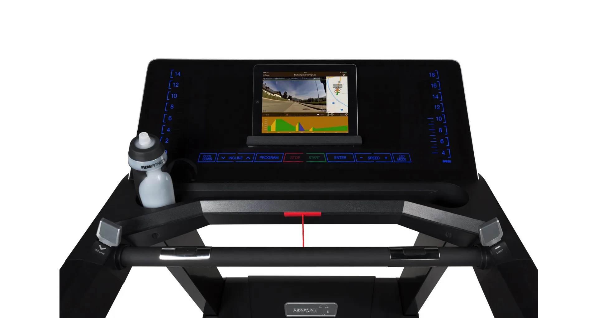 Běžecký pás Flow Fitness T3i disponuje snadno ovladatelným počítačem, dvěma držáky na lahev, senzory pro měření tepové frekvence a transportními kolečky.