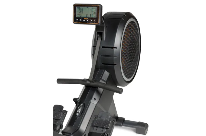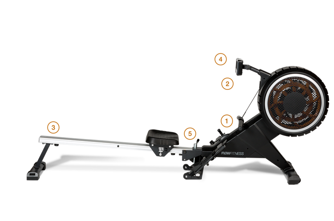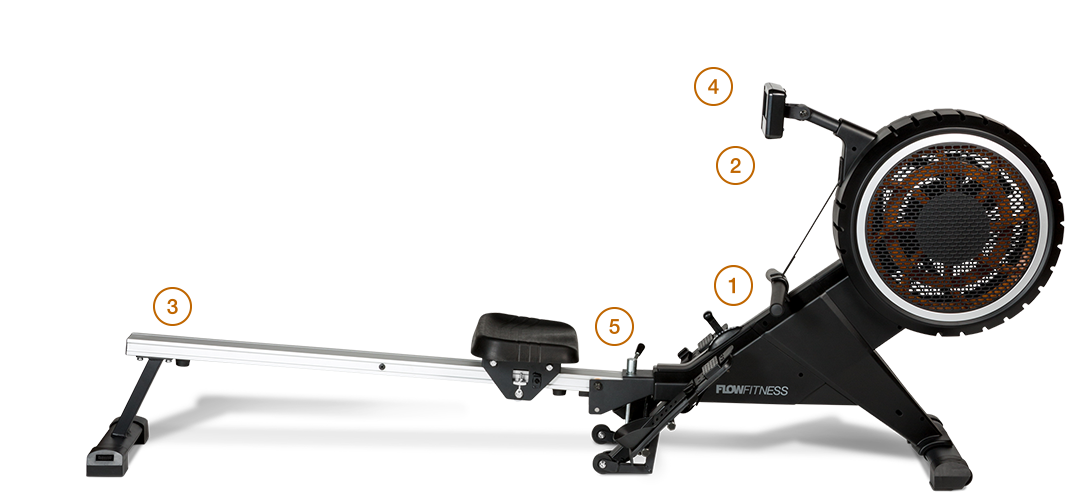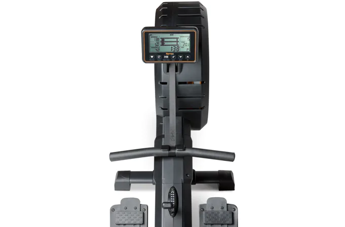 Veslovací trenažér Flow Fitness Yarra M disponuje přehledným počítačem, transportními kolečky, vyrovnávači nerovnosti a možností složení.