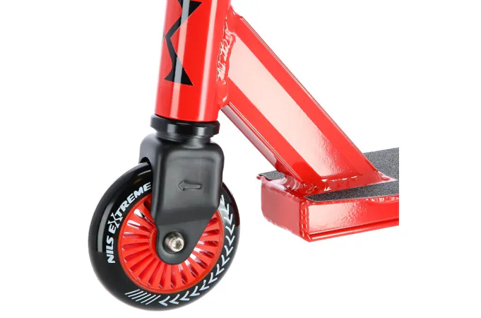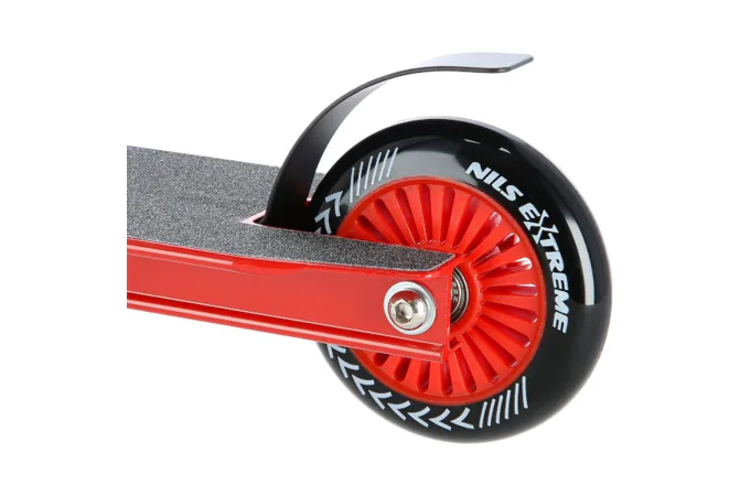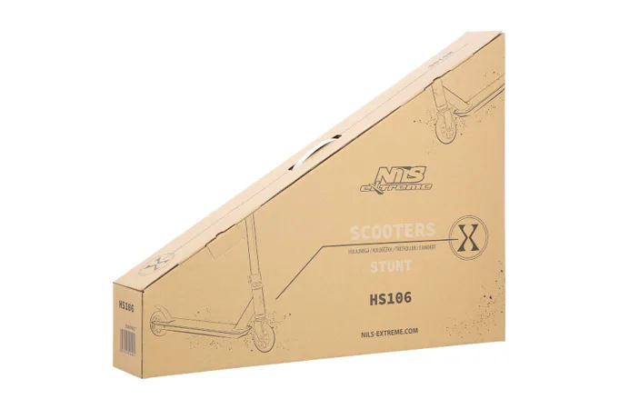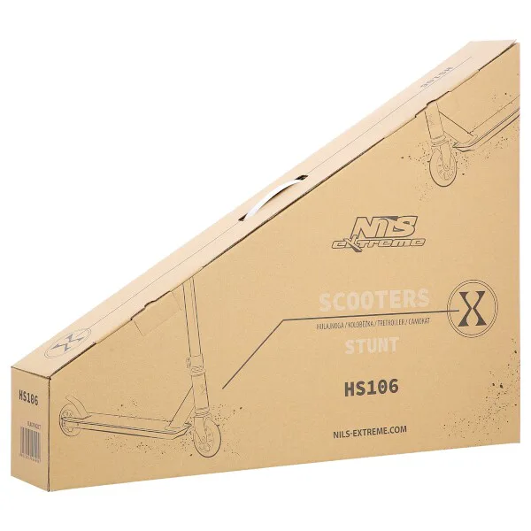 NILS Extreme HS106 je freestyle kolobežka s nosnosťou 100 kg a je tak vhodná ako pre deti, tak aj pre dospelých. Konštrukcia je vyrobená zo silnej a trvanlivej ocele, platforma je z hliníka. Model HS106 je vhodný na asfalt a dlažbu. Kolieska o rozmere 100 x 24 mm sú osadené ložiskami ABEC 7, bezpečnosť zaručuje zadná prítlačná (blatník) brzda - takzvaný Flexi fender. NILS Extreme HS106 je vďaka malým, rýchlym kolieskam, robustná, pevná konštrukcia a riadidlám pretáčajúcim sa o 360 ° určená na vykonávanie trikov.
