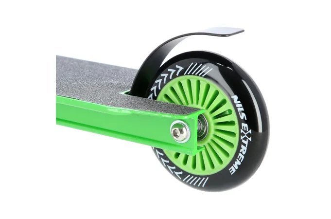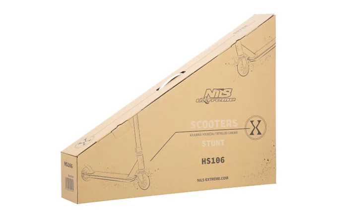 NILS Extreme HS106 je freestyle kolobežka s nosnosťou 100 kg a je tak vhodná ako pre deti, tak aj pre dospelých. Konštrukcia je vyrobená zo silnej a trvanlivej ocele, platforma je z hliníka. Model HS106 je vhodný na asfalt a dlažbu. Kolieska o rozmere 100 x 24 mm sú osadené ložiskami ABEC 7, bezpečnosť zaručuje zadná prítlačná (blatník) brzda - takzvaný Flexi fender. NILS Extreme HS106 je vďaka malým, rýchlym kolieskam, robustná, pevná konštrukcia a riadidlám pretáčajúcim sa o 360 ° určená na vykonávanie trikov.