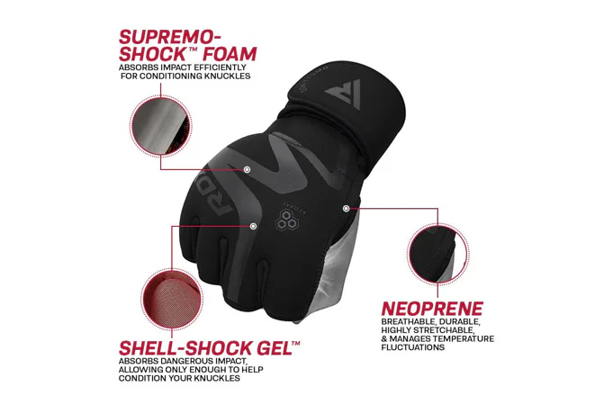 Elegantné a štýlové vnútorné rukavice z neoprénu RDX T15 Noir Series sú ideálne pre rôzne typy kontaktných športov. Sú skvelou alternatívou ku klasickým bandážom rúk. Rukavice ochránia vaše ruky pred nárazmi pri tréningu a pomáhajú predchádzať zraneniu rúk.