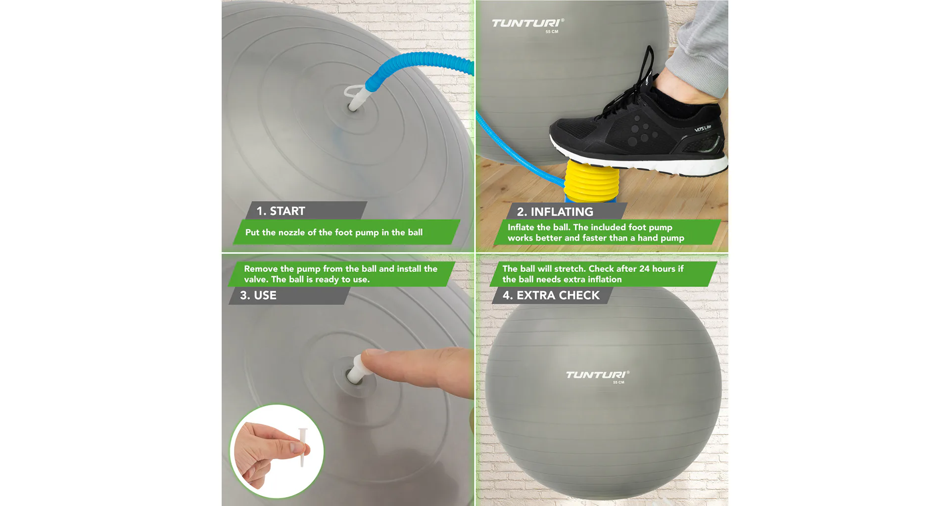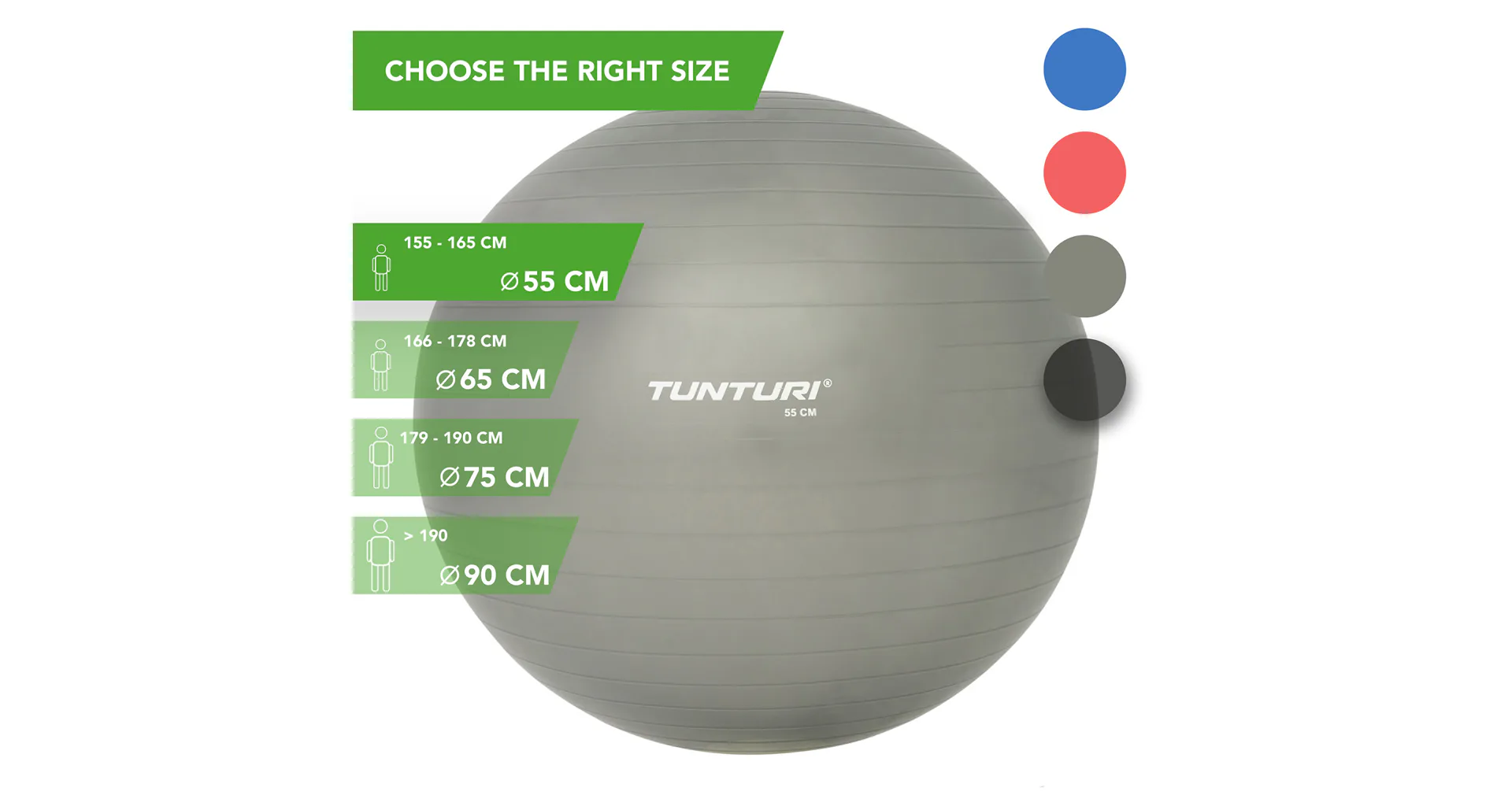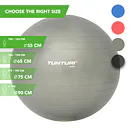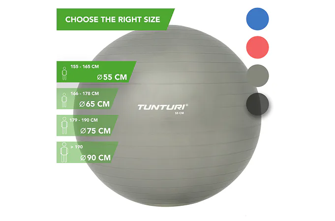 Séria gymnastických lôpt TUNTURI je vyrábaná v niekoľkých veľkostiach a farbách. Súčasťou balenia je vždy ručná pumpa na ľahké nafúknutie lopty. Gymnastické lopty TUNTURI sa vyznačujú vysokou nosnosťou 300 kg, tvarovou stálosťou, kvalitným a príjemným materiálom.