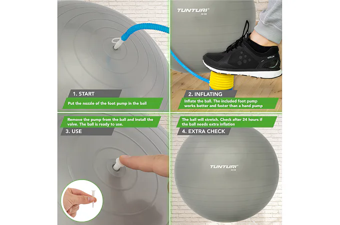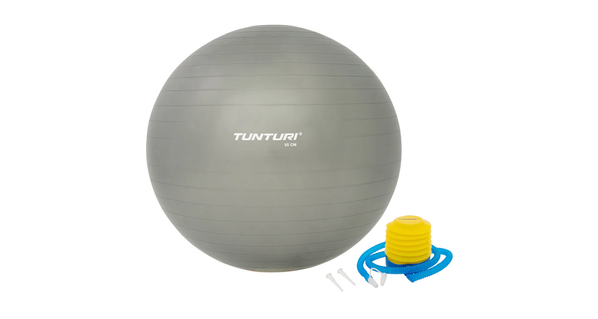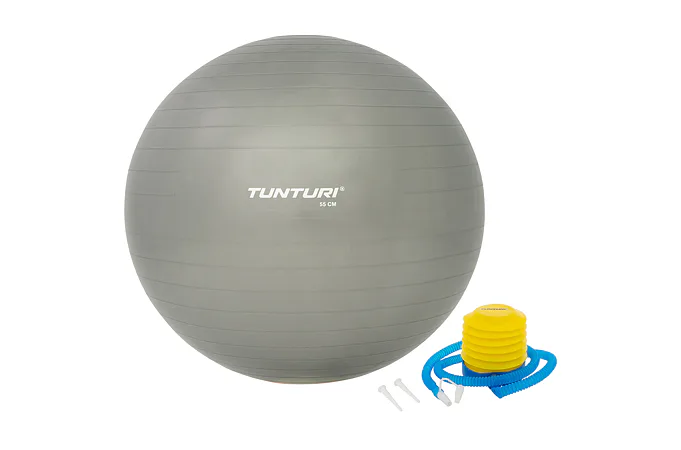 TUNTURI gymnastická lopta strieborná s pumpičkou - pomôcka pre šetrné precvičenie celého tela, slúži na precvičovanie stability, správneho držania tela a k relaxácii. Tonizuje svalstvo celého tela a zvyšuje fyzickú kondíciu. Je ideálny na prevenciu a minimalizáciu bolesti dolnej časti chrbta.