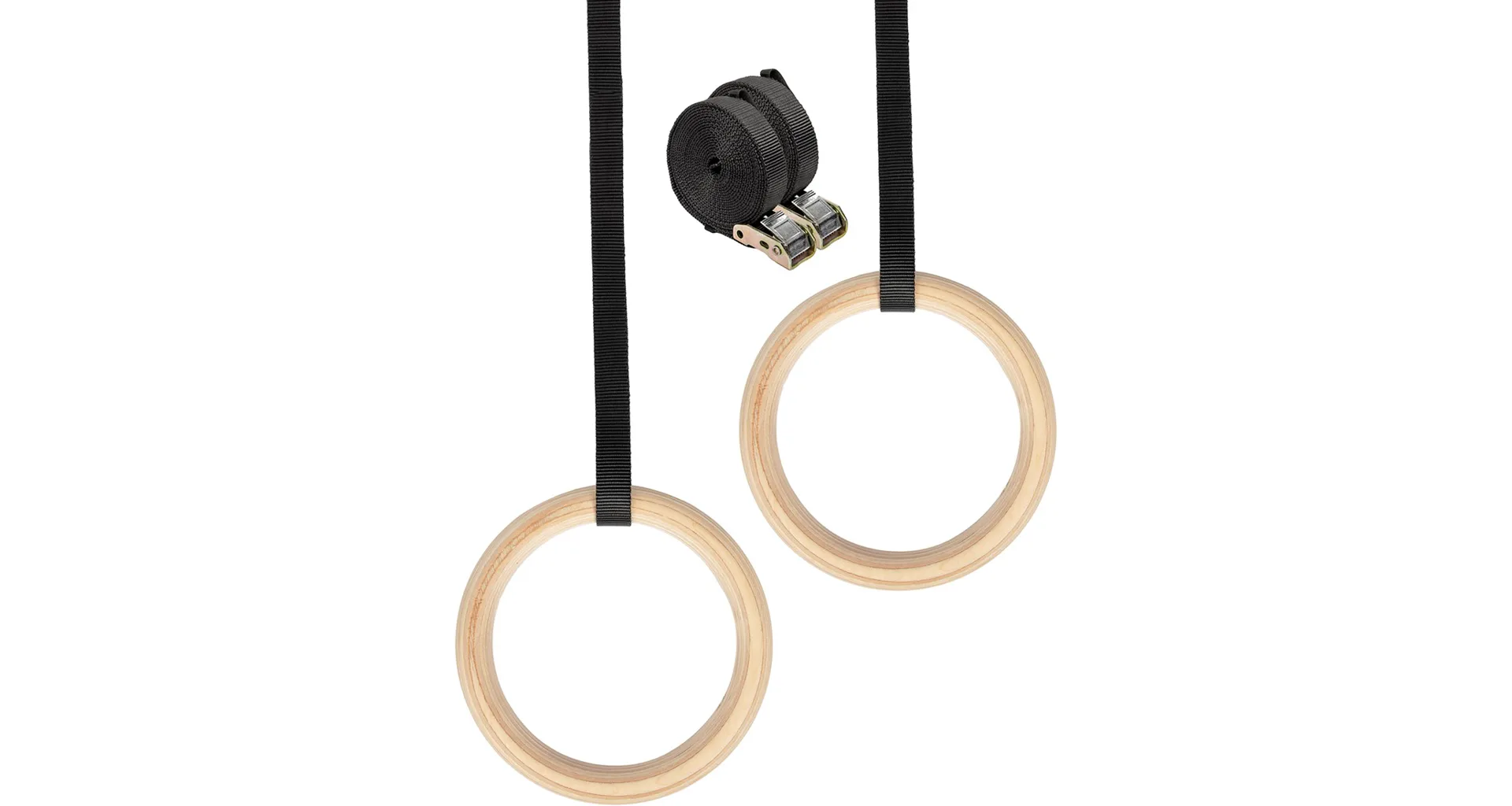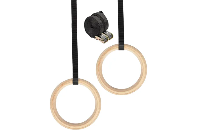Gymnastické kruhy VIRTUFIT Wooden Gym Rings sú dodávané s nastaviteľnými popruhmi s dĺžkou 460 cm a šírkou 2,6 cm. Vďaka popruhom môžete kruhy ľahko pripevniť k hrazde alebo k posilňovacej klietke. Je tiež možné ich namontovať na strop alebo ich použiť vonku. Vďaka jednoduchému, ale pevnému závesnému systému môžete kruhy ľahko odopnúť a zrolovať ich na uloženie do tašky.