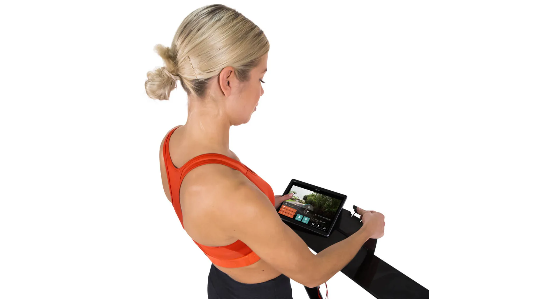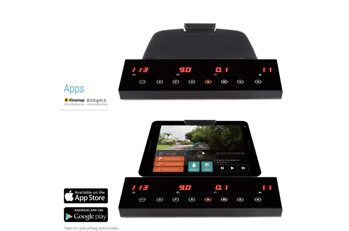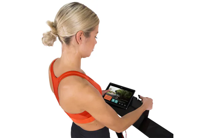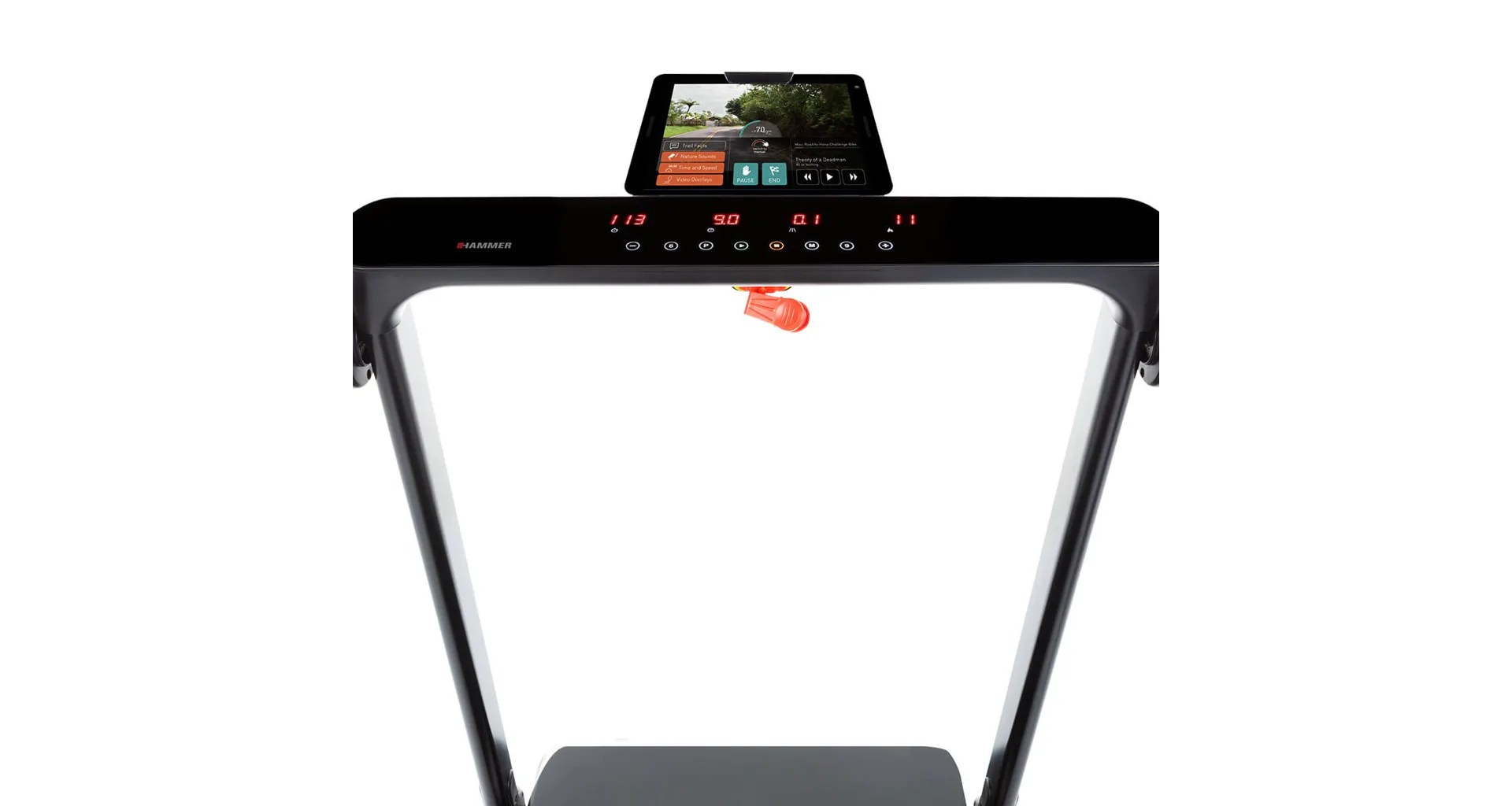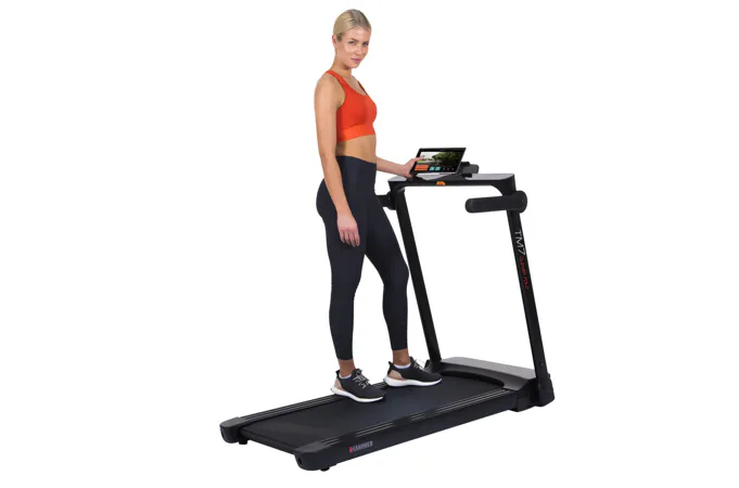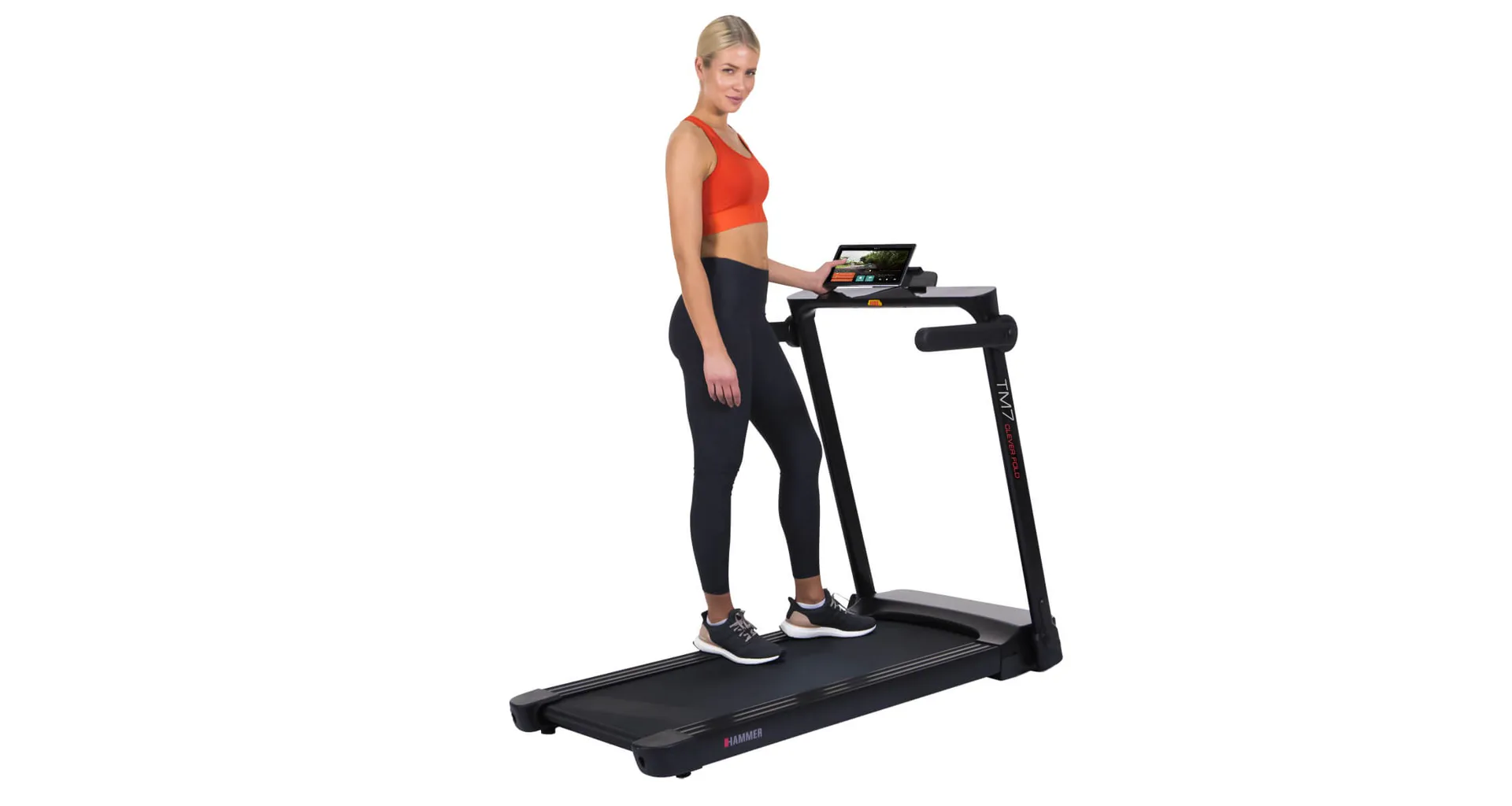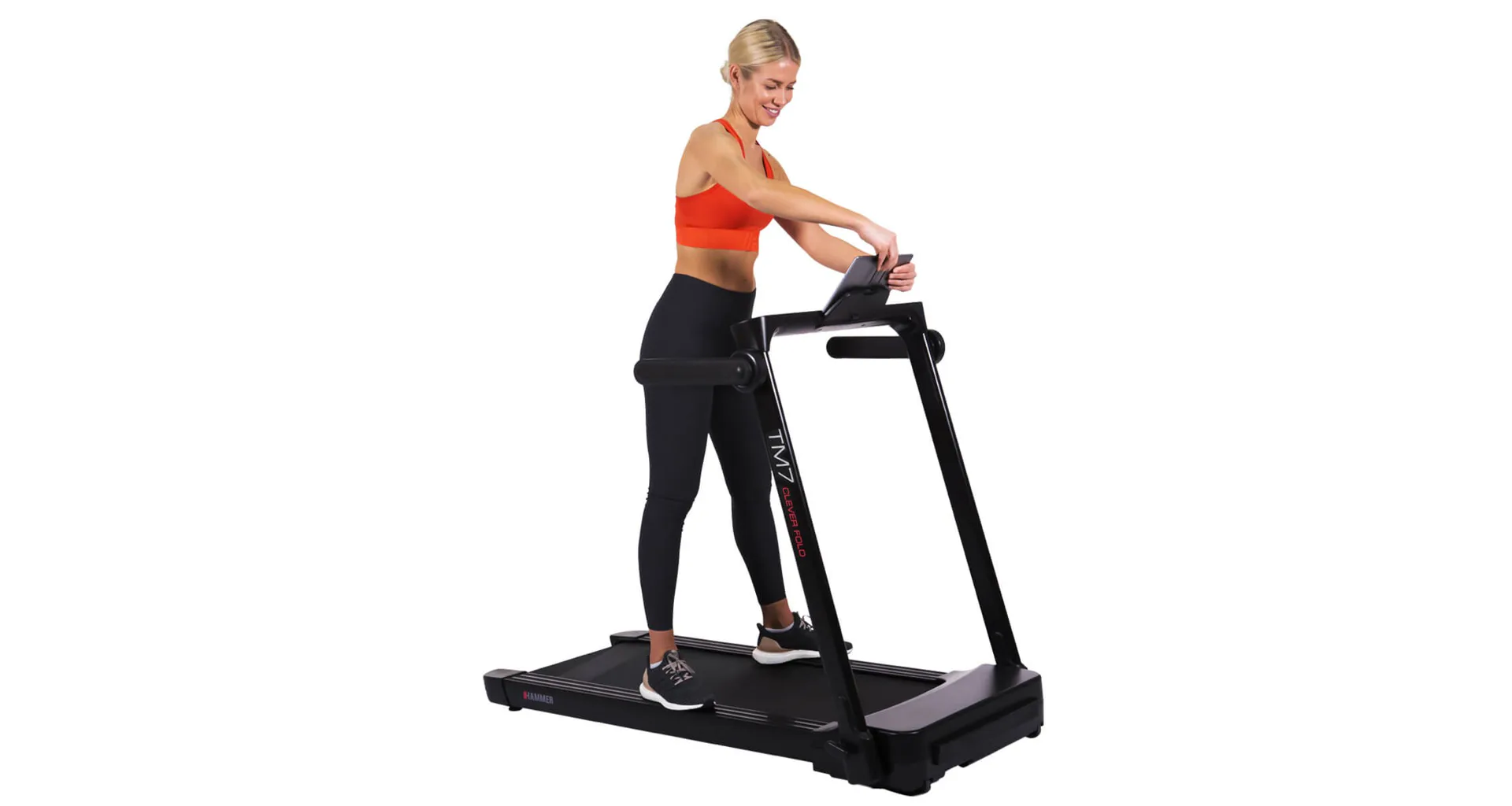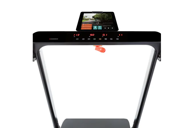Běžecký pás HAMMER CleverFold TM7 disponuje čitelným LCD displejem, držákem na tablet/smartphone a transportními kolečky.