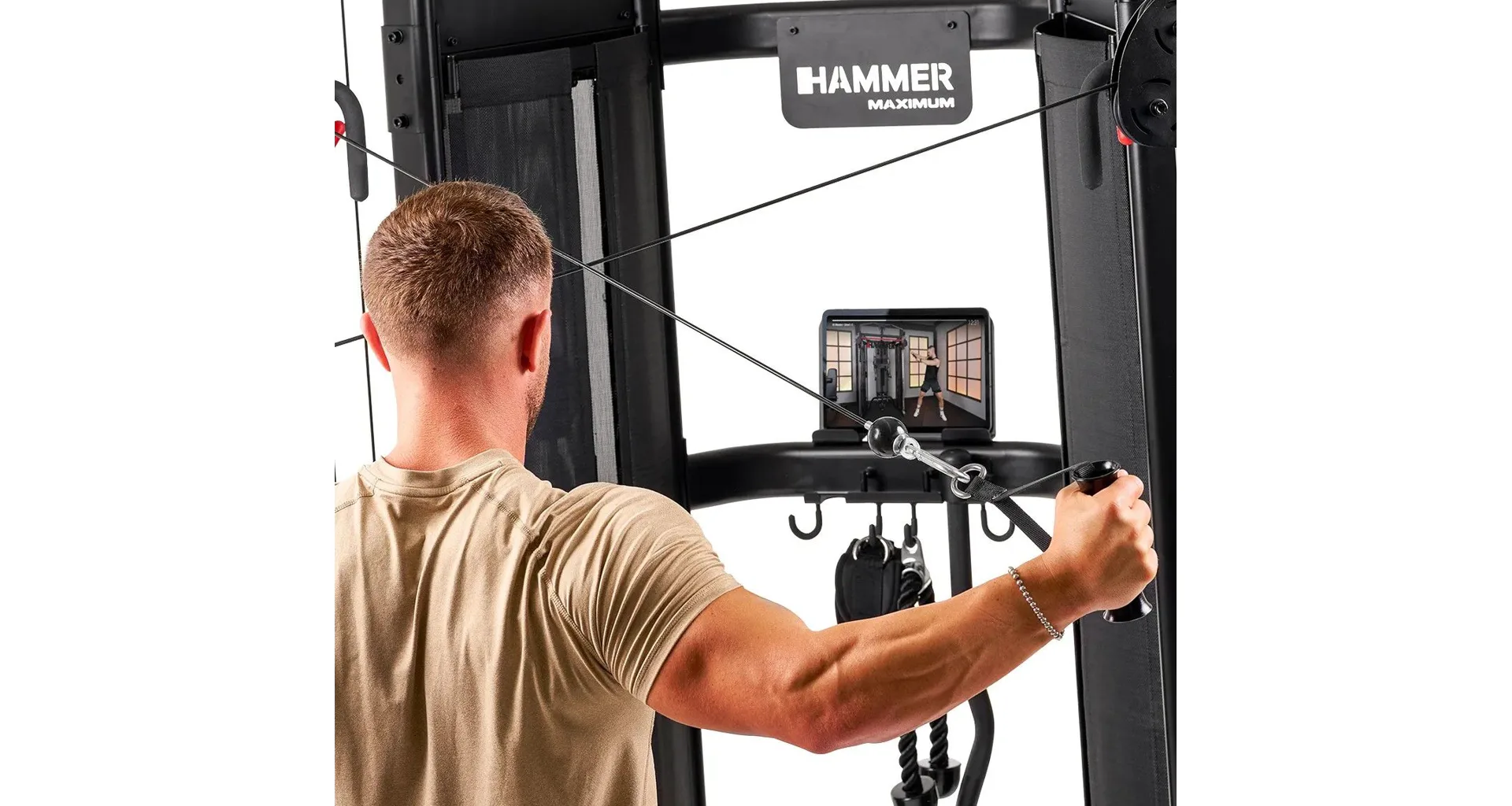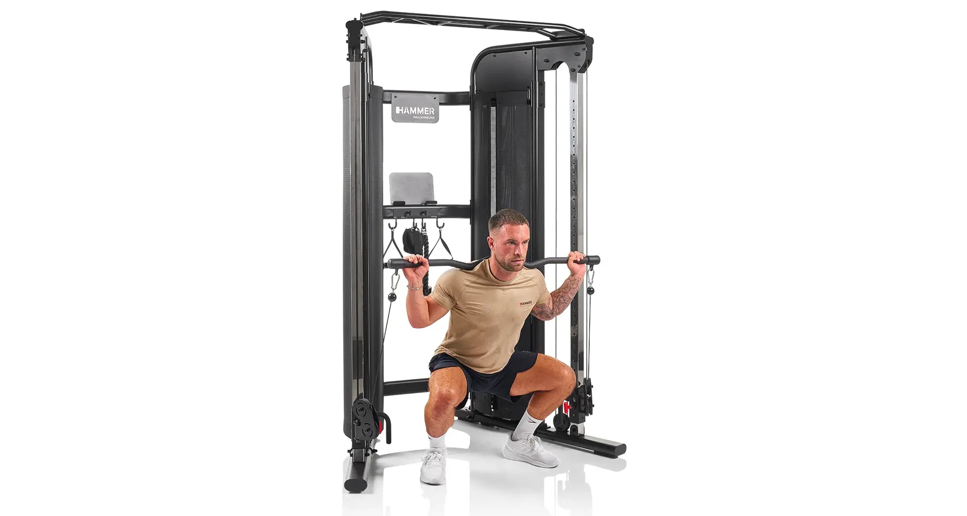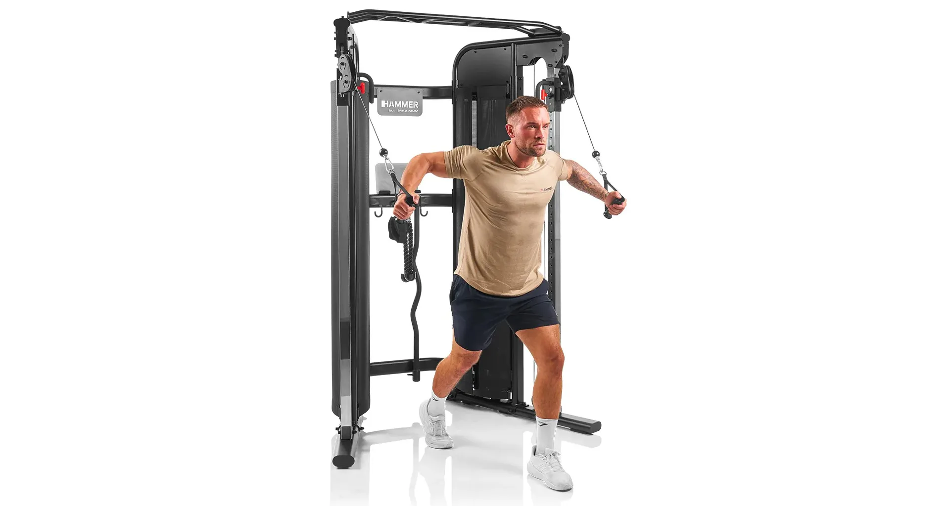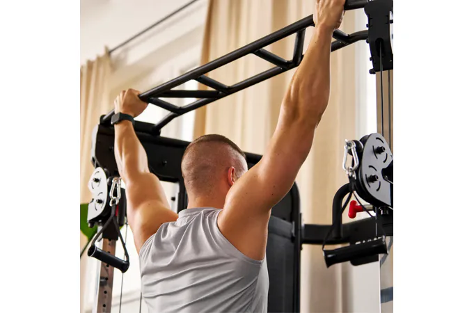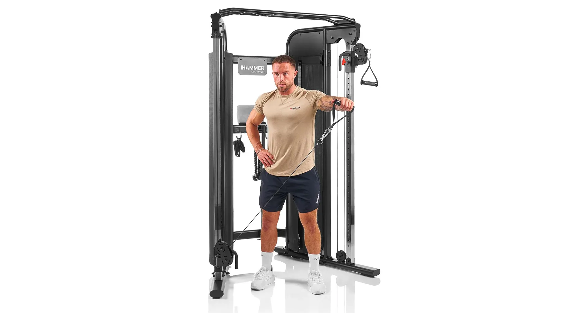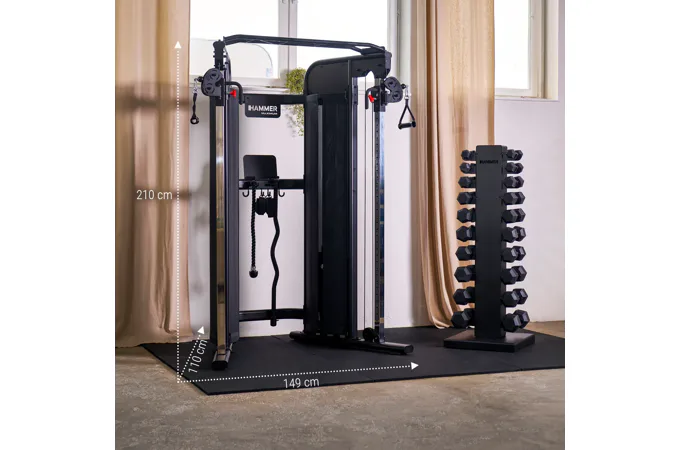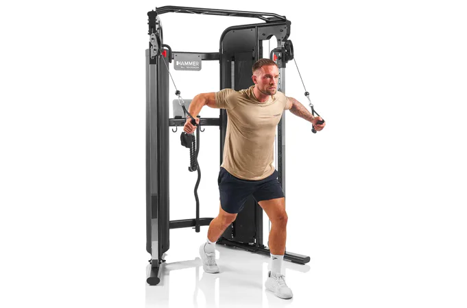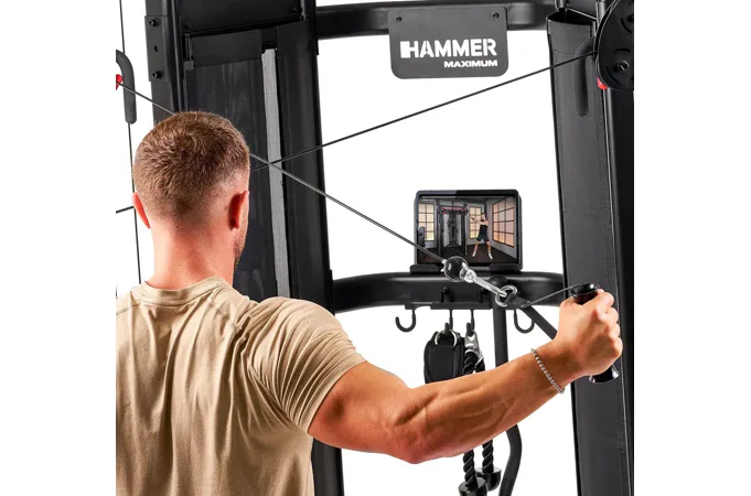 HAMMER Multi-Gym Autark 8.0 je univerzální domácí posilovací věž, která umožňuje komplexní trénink celého těla. Protisměrný kladkový systém na HAMMER Multi-Gym Autark 8.0 má plynulé nastavení výšky a pohyblivá ramena, což zajišťuje přirozený rozsah pohybu při cvičení různých svalových skupin.