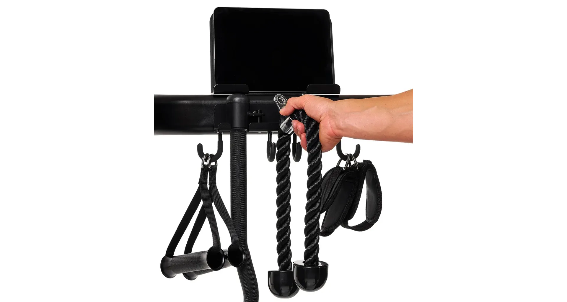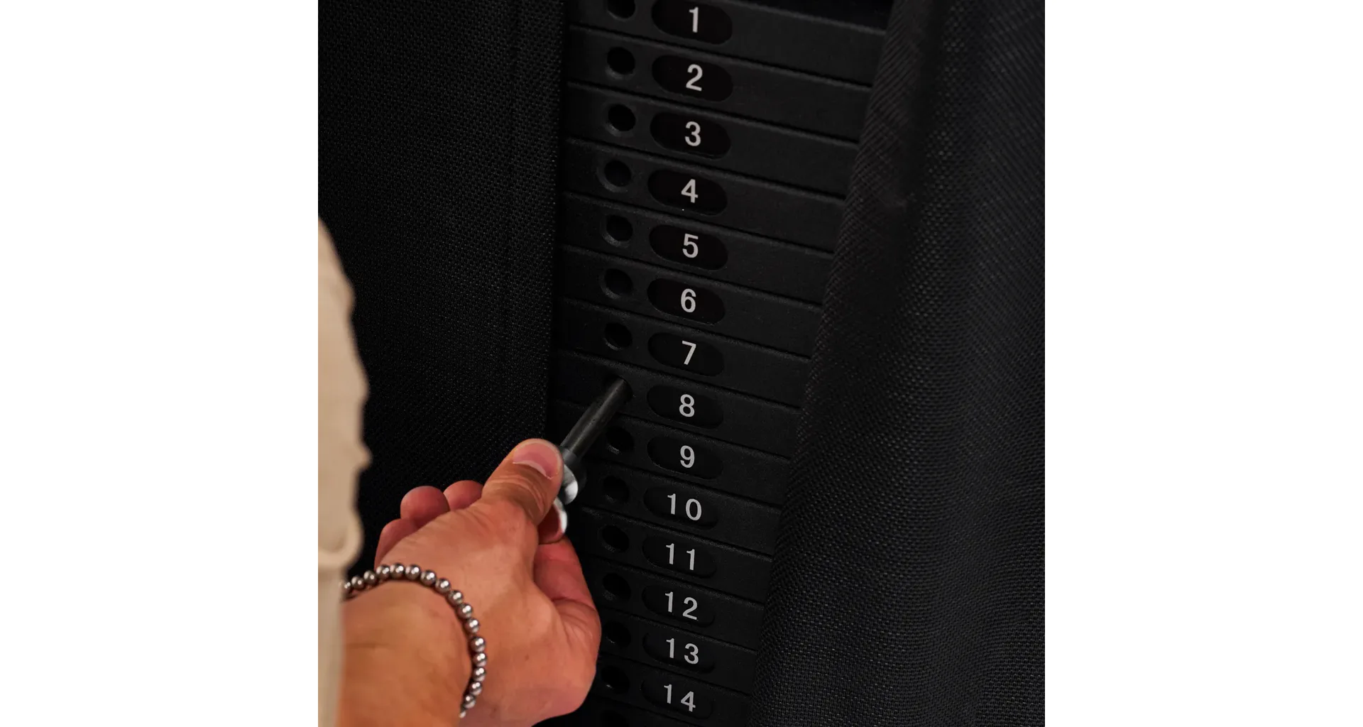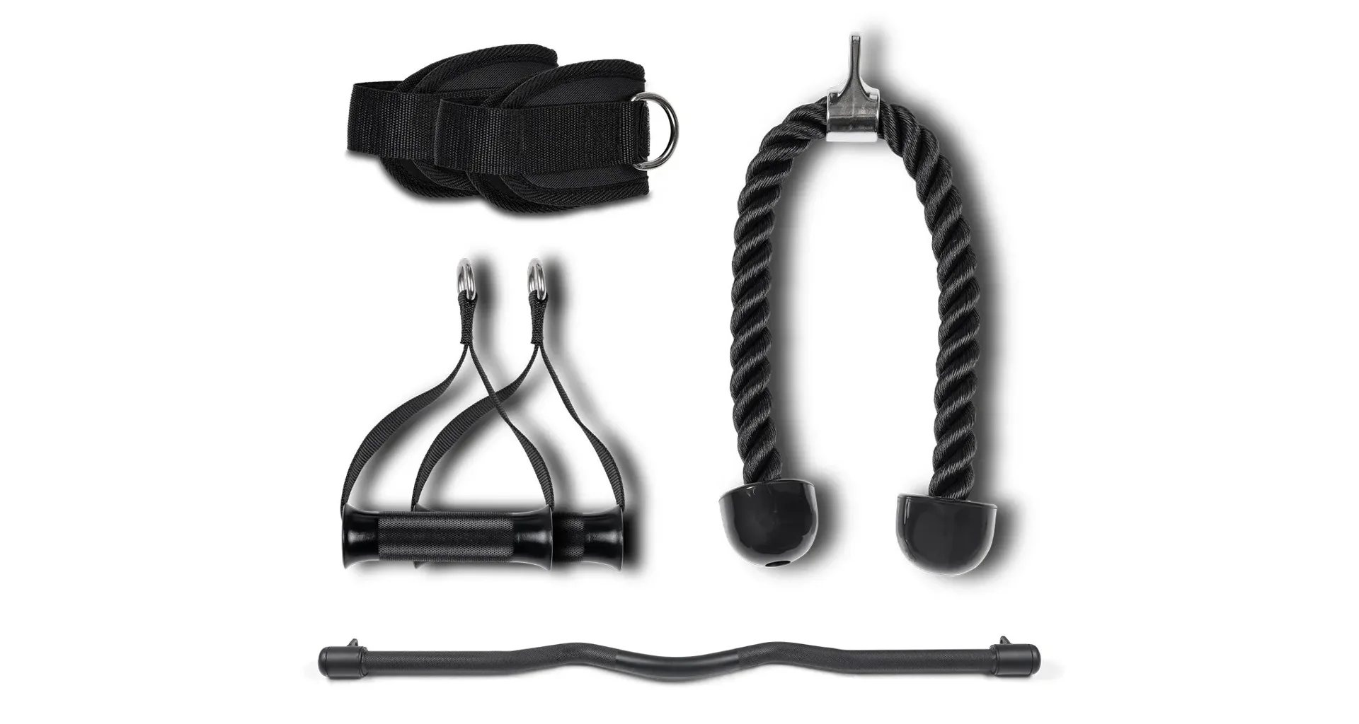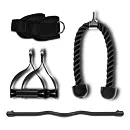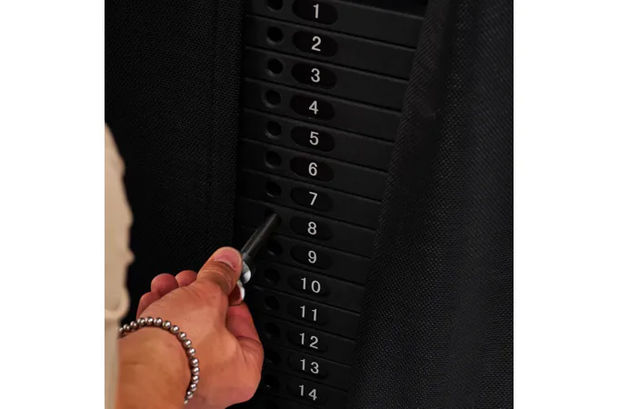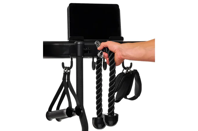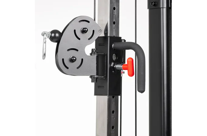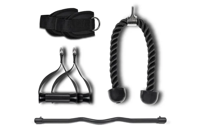 Závaží tvoří dva samostatné bloky po 80 kg. Každý blok je rozdělený po 5kg krocích, což umožňuje přesné nastavení zátěže podle potřeby. Součástí výbavy je lat bar, krátká rovná tyč, tricepsové lano, jednoruční úchopy a kotníkové popruhy – pro variabilní tahové i tlakové cviky.