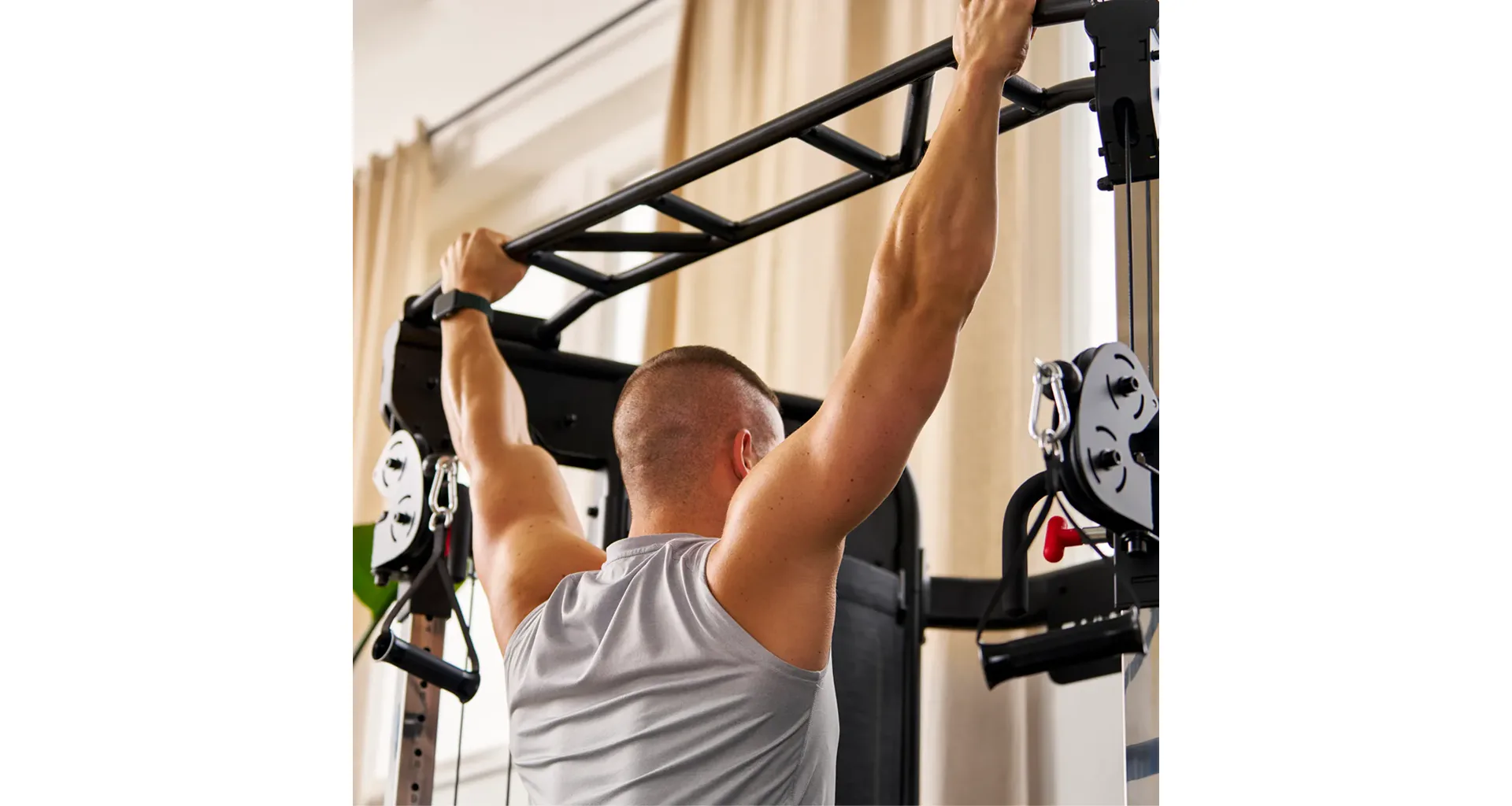 Hrazda s více úchopy je pevnou součástí konstrukce a slouží k posilování zad, paží a trupu. Je vhodná i pro trénink s doplňkovou zátěží.