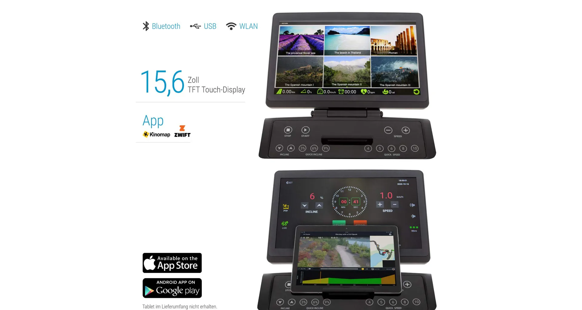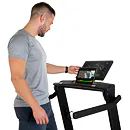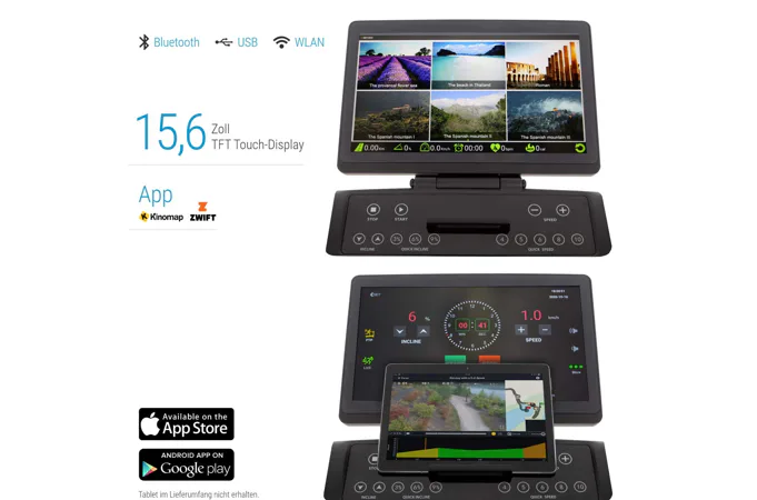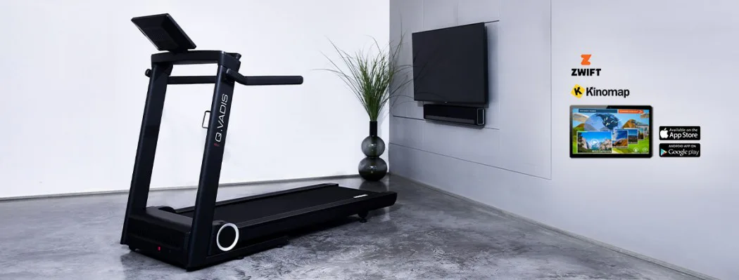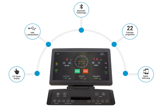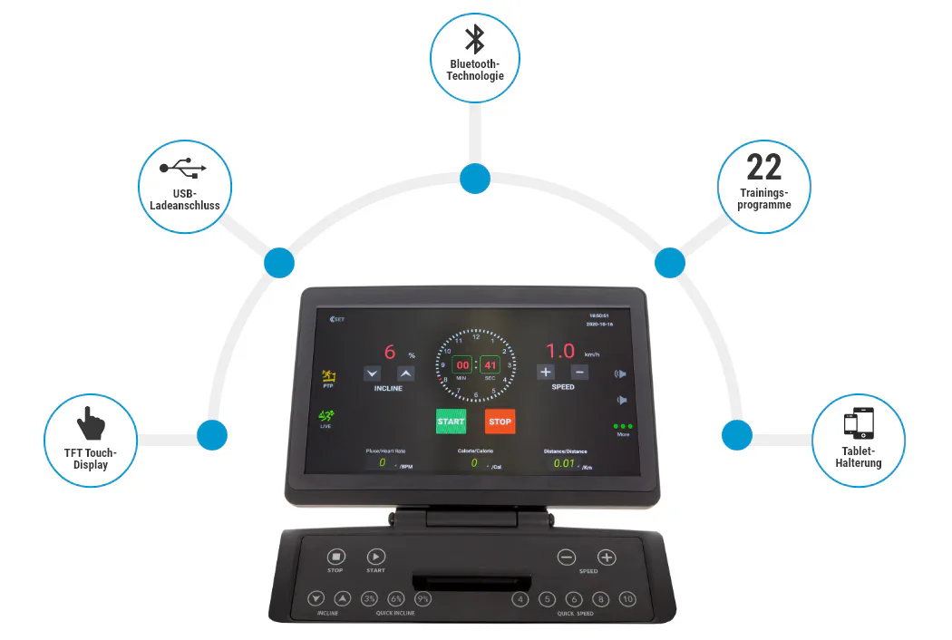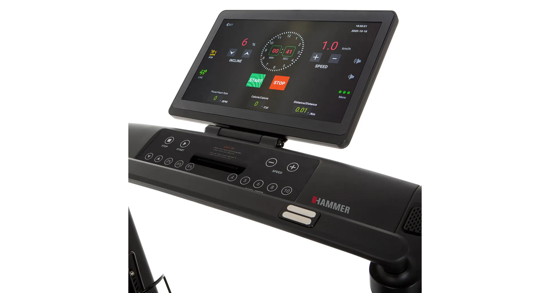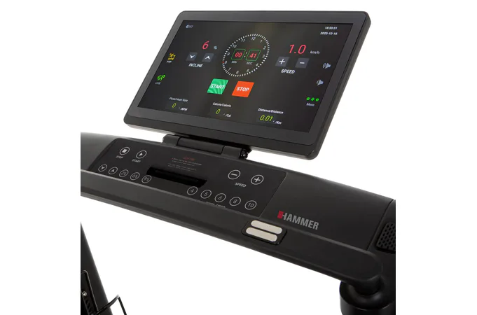 HAMMER Q.Vadis 10.0 je vybavený prehľadným počítačom s 15,6" TFT dotykovým displejom, ktorý ponúka 22 prednastavených programov a HRC programy. Meranie tepovej frekvencie je možné prostredníctvom senzorov na rukovätiach alebo bezdrôtovo 5 kHz hrudným pásom. Pre spestrenie vášho tréningu môžete bežecký pás pripojiť cez Bluetooth k tréningovým aplikáciám Kinomap a Zwift a urobiť tak váš tréning pestrejší a zábavnejší. Aplikácia automaticky prispôsobuje odpor a nastavuje sklon podľa vybranej trate.