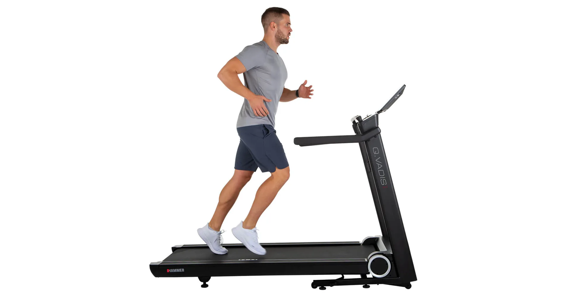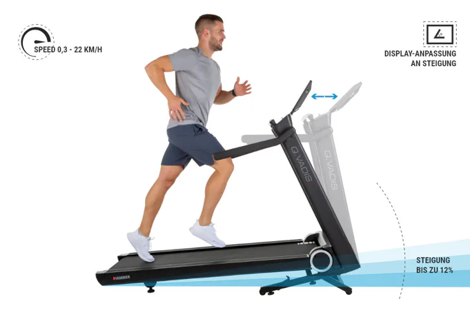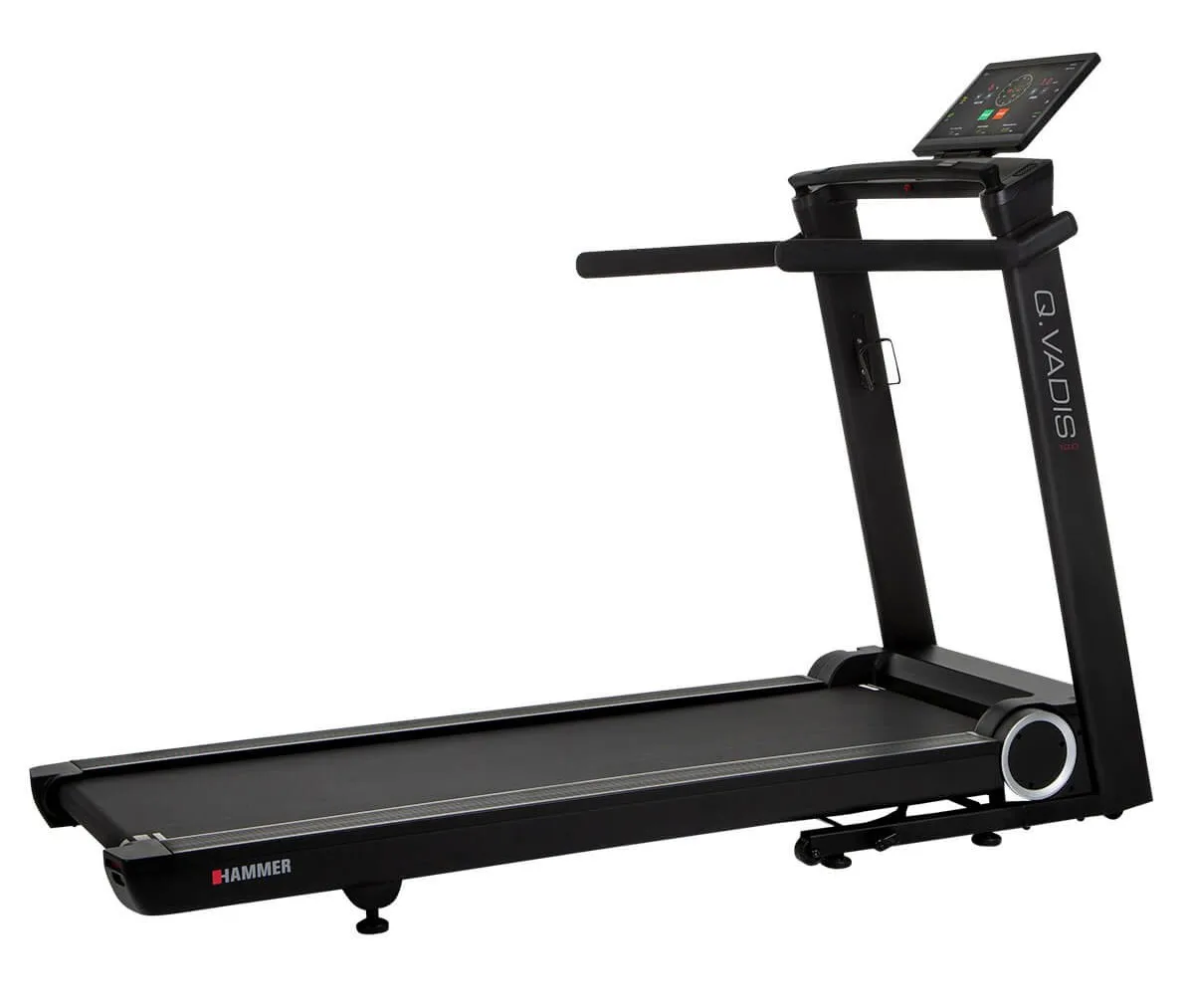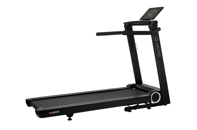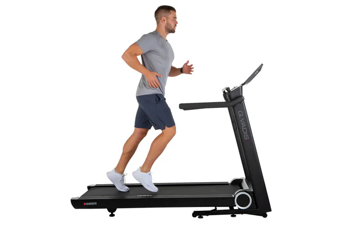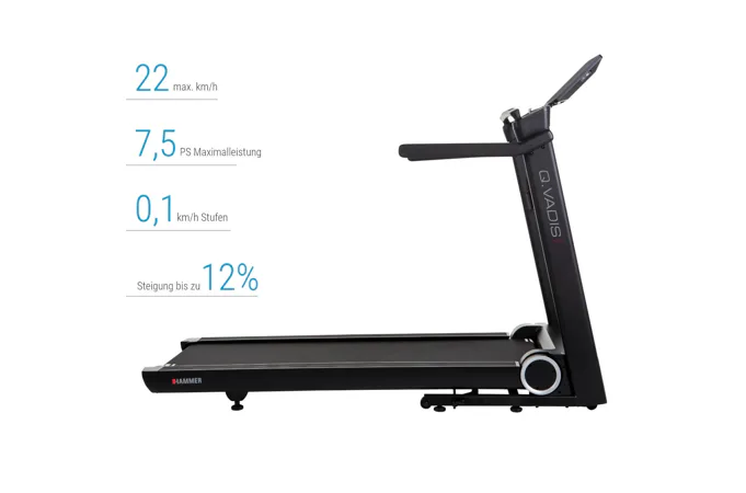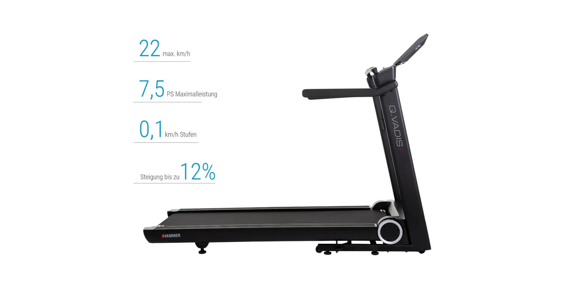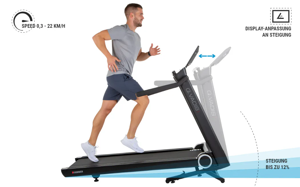 Bežecký pás HAMMER Q.Vadis 10.0 vám ľahko pomôže spáliť tuky a zlepšiť fyzickú kondíciu. Trenažér disponuje priestrannou bežeckou plochou s rozmermi 51 x 152 cm s nosnosťou do 150kg. Kvalitný a odolný motor s trvalým výkonom 3,0 HP (max. výkon 7,5 HP) zaistí tichý chod aj pri maximálnom zaťažení. Rýchlosť je možné regulovať v rozsahu 0,8 - 22 km/h sklon bežeckej plochy je nastaviteľný do 12 %. Pre nastavenie rýchlosti a sklonu sú madlá stroja opatrené "rýchlymi tlačidlami". Vďaka jedinečnej štruktúre Q.Vadis 10 sa celá konštrukcia pri nastavení sklonu pohybuje nahor a displej sa tak automaticky prispôsobí ľubovoľnému požadovanému uhlu sklonu.