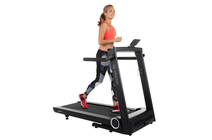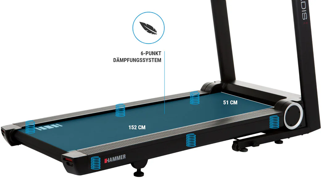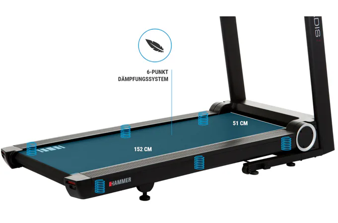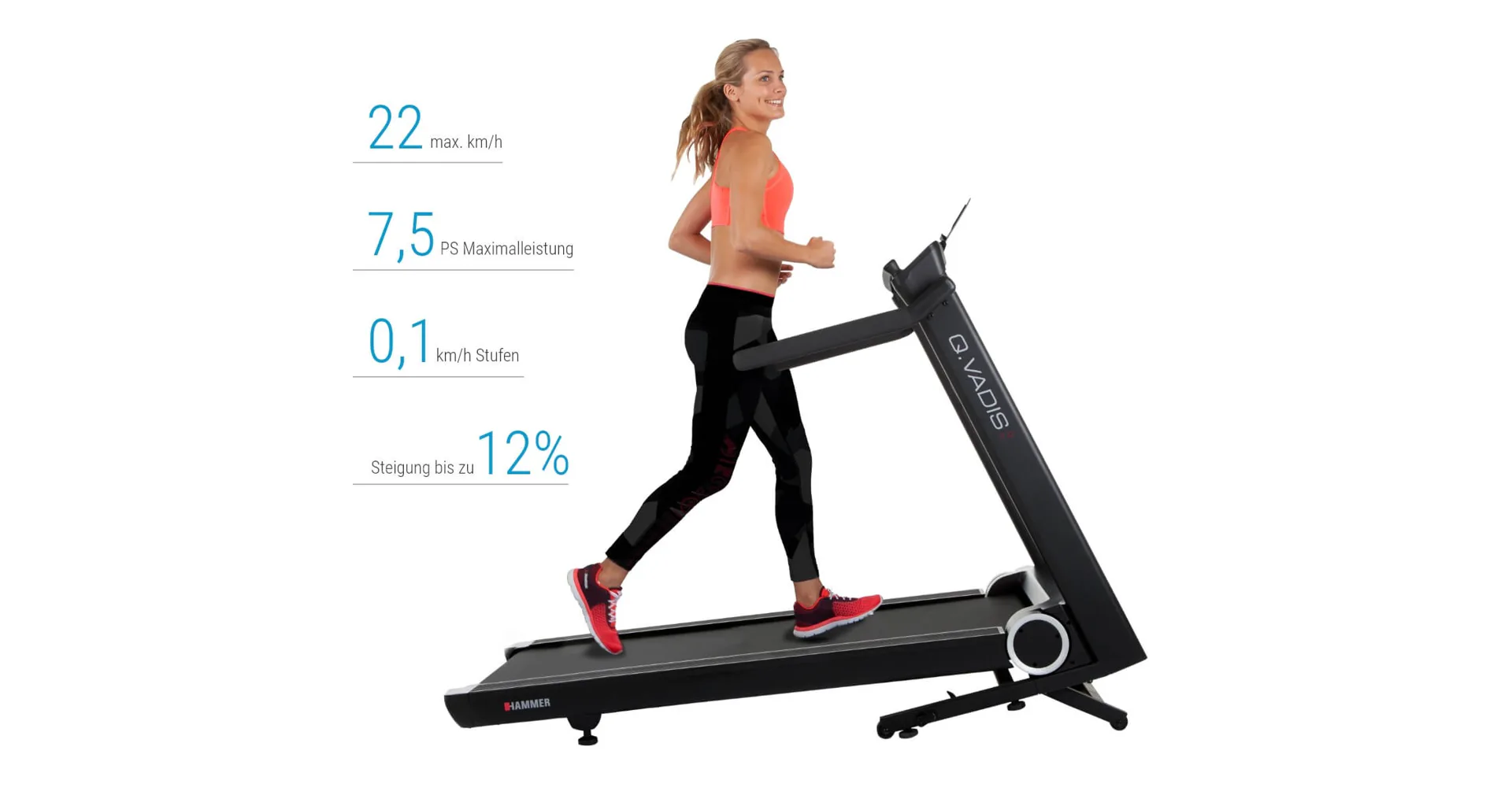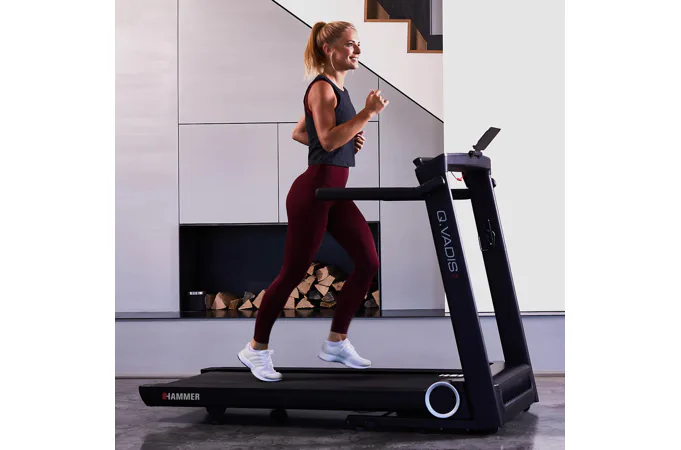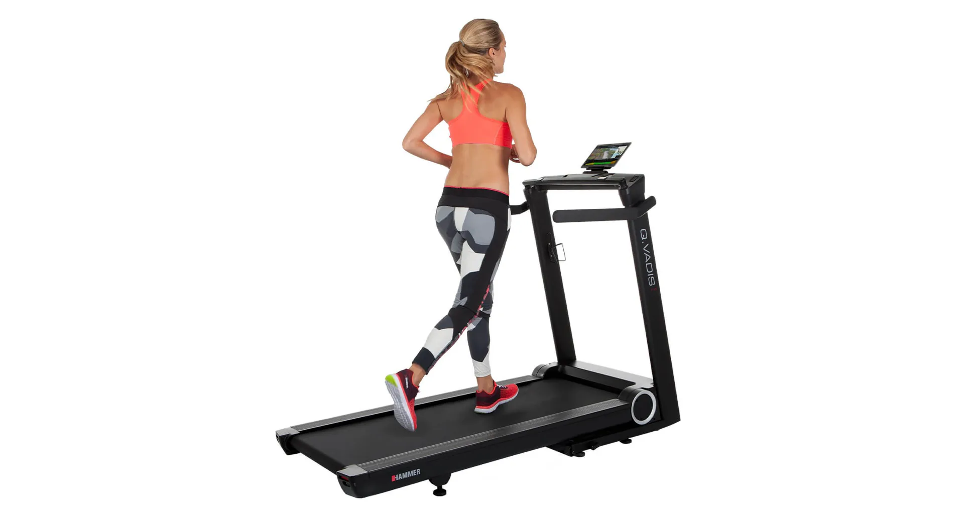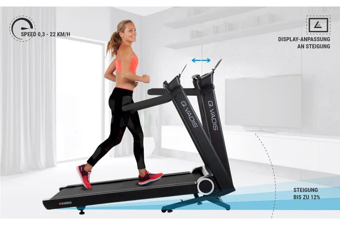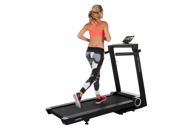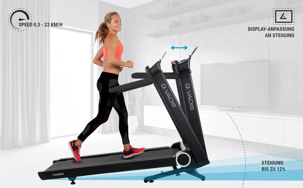Bežecký pás HAMMER Q.Vadis 7.0 vám ľahko pomôže spáliť tuky a zlepšiť fyzickú kondíciu. Trenažér disponuje priestrannou bežeckou plochou s rozmermi 51 x 152 cm s nosnosťou do 150kg. Kvalitný a odolný motor s trvalým výkonom 3,0 HP (max. výkon 7,5 HP) zaistí tichý chod aj pri maximálnom zaťažení. Rýchlosť je možné regulovať v rozsahu 0,8 - 22 km/h sklon bežeckej plochy je nastaviteľný do 12 %. Pre nastavenie rýchlosti a sklonu sú madlá stroja opatrené "rýchlymi tlačidlami". Vďaka jedinečnej štruktúre Q.Vadis 7.0 sa celá konštrukcia pri nastavení sklonu pohybuje nahor a displej sa tak automaticky prispôsobí ľubovoľnému požadovanému uhlu sklonu.