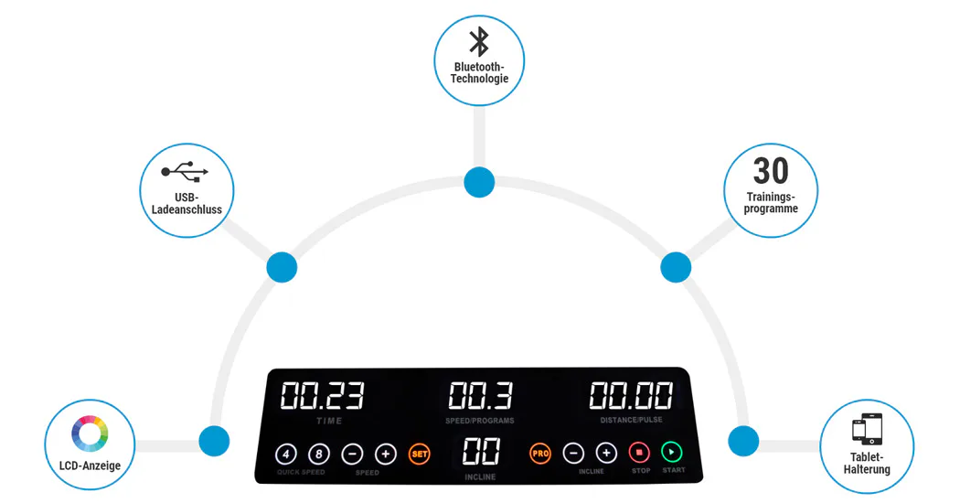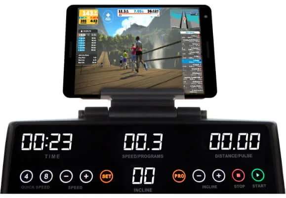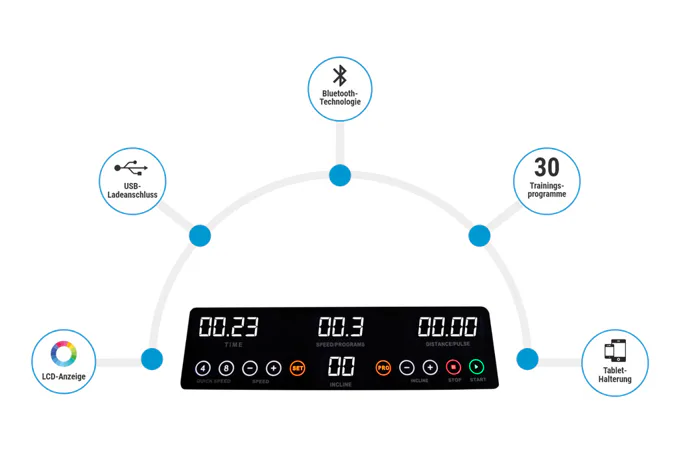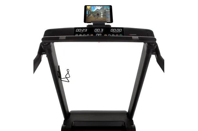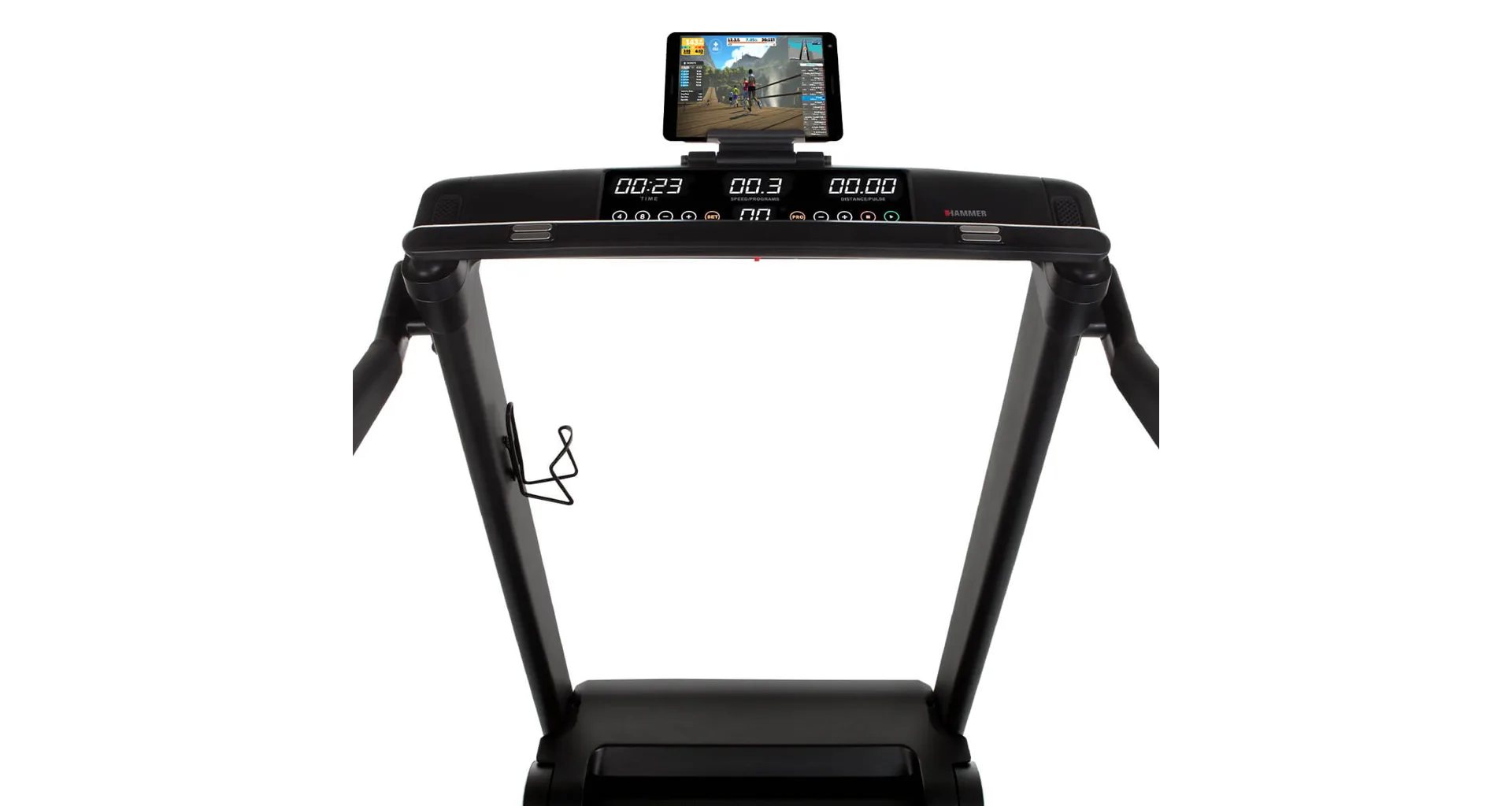HAMMER Q.Vadis 7.0 je vybavený prehľadným počítačom, ktorý ponúka 22 prednastavených programov a HRC programy. Meranie tepovej frekvencie je možné prostredníctvom senzorov na rukovätiach alebo bezdrôtovo 5 kHz hrudným pásom. Pre spestrenie vášho tréningu môžete bežecký pás cez Bluetooth pripojiť k tréningovým aplikáciám Kinomap a Zwift a urobiť tak váš tréning pestrejší a zábavnejší. Aplikácia automaticky prispôsobuje odpor a nastavuje sklon podľa vybranej trate.