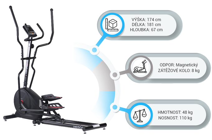 Eliptický trenažér HMS H6504 patrí medzi univerzálne zariadenia určené do domáceho prostredia na celkové zlepšenie zdravia, zníženie telesného tuku a zlepšenie účinnosti organizmu. Model H6504 je vybavený 8-mi kilogramovým zotrvačníkom a manuálne ovládanou, magnetickou brzdou.