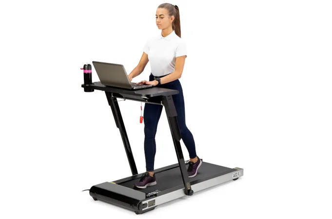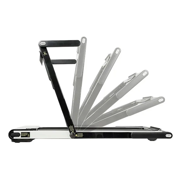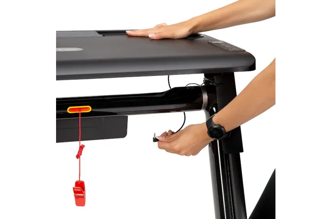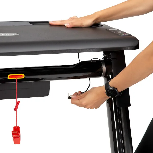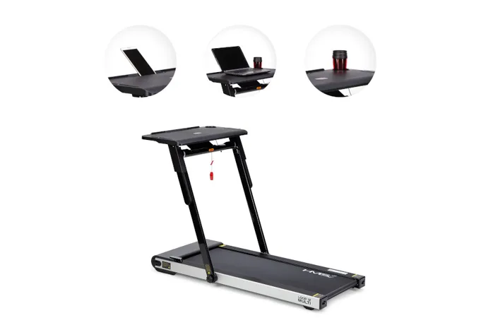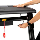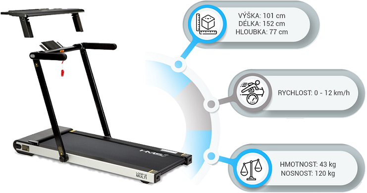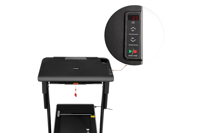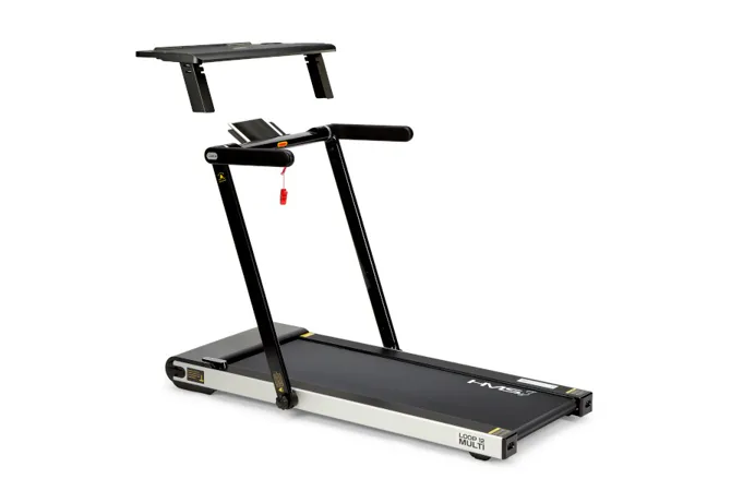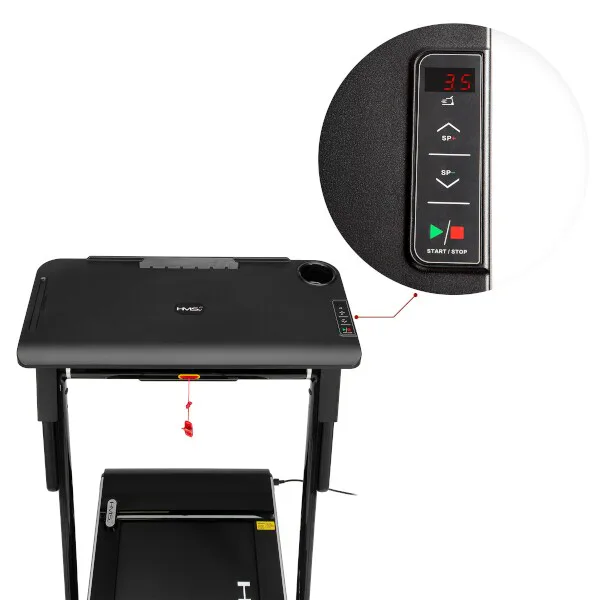 So stolíkom (pracovným pultom) sa náš model HMS LOOP12 od konkurencie odlišuje a vďaka tomu si môžete na ňom odložiť napríklad notebook, knižku, alebo obľúbenú kávu. Po nasadení stola sa rýchlosť bežeckej plochy obmedzí na maximálnu rýchlosť 6 km/h po prepojení pultu s konzolou je možné upravovať rýchlosť priamo z ovládania na pravej strane stola.