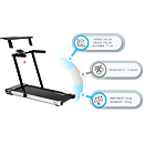 Ovládací panel zobrazuje všetky dôležité údaje počas tréningu (rýchlosť, čas, vzdialenosť, spálené kalórie a počet krokov). Po stranách displeja nájdeme tlačidlá na zastavenie a spustenie pásu, reguláciu rýchlosti a 2 tlačidlá na skokovú zmenu rýchlosti na 3 a 5 km/h. Počítač tiež disponuje rozhraním bluetooth na spojenie s tréningovou aplikáciou FitShow, pomocou ktorej môžeme sledovať vývoj našej kondície a zároveň nám umožňuje nastavenie tréningového programu, podľa ktorého trenažér automaticky mení rýchlosť bežeckej plochy. Tréningové aplikácie sú produktom tretej strany a nenesieme zodpovednosť za ich funkčnosť. Ak by ste mali samozrejme akúkoľvek otázku, radi vám poradíme.