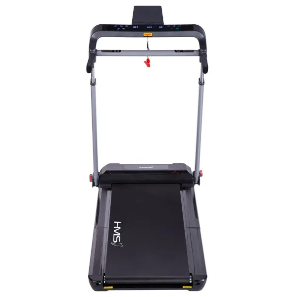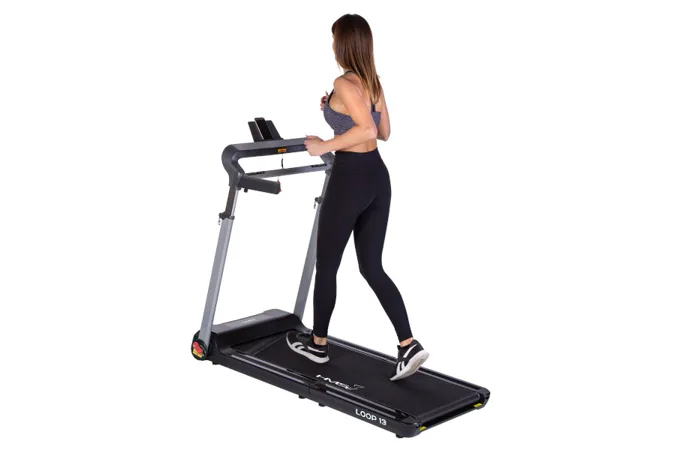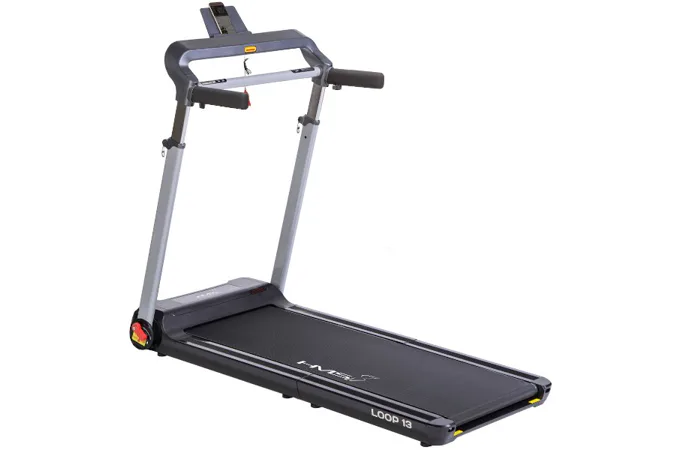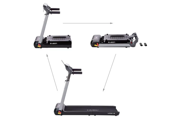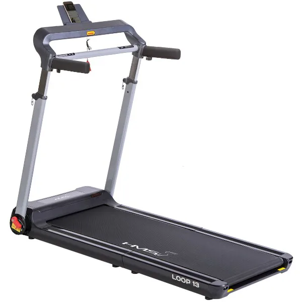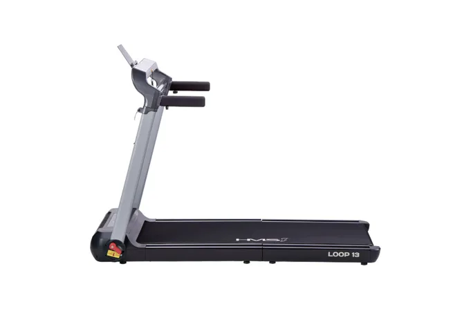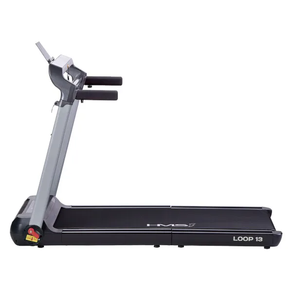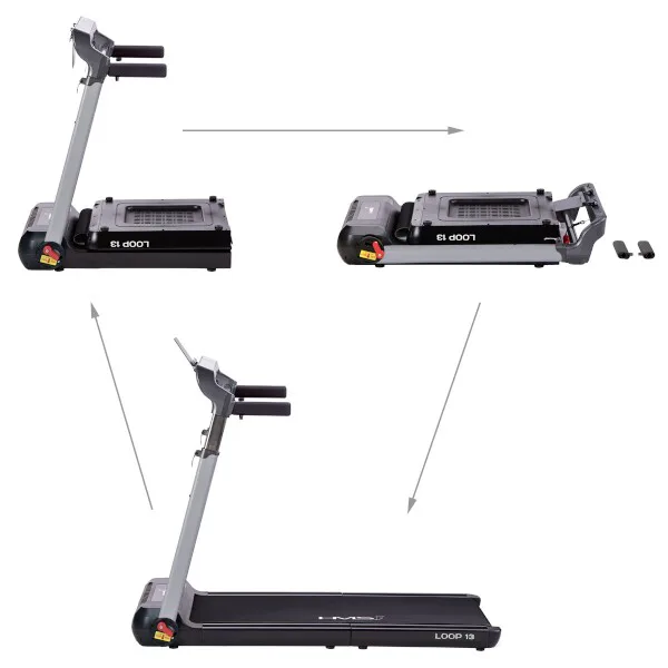 Trenažér HMS LOOP13 je revolučný bežecký pás patriaci do kategórie H, ktorý je vďaka svojim kompaktným rozmerom a možnosti zloženia, ideálnou voľbou pre tréning v domácom prostredí. Pre maximálny komfort je možné sklopiť stĺpiky s konzolou, bežeckú plochu „zlomiť“ a trenažér schovať napríklad pod posteľ, alebo do skrine.