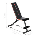 Chrbtová opierka je nastaviteľná do 8-mich polôh vrátane negatívneho uhla. Zarážky nôh sú vhodné napríklad na tréning sed-ľahov. Gumové expandéry nájdu využitie pri tréningu horných končatín. Sedadlo a operadlo boli vyrobené veľmi starostlivo. Pevná doska pokrytá silnou penou zaručuje stabilitu pri cvičení. Čalúnenie je vyrobené v dizajne karbónových vlákien s vyšitým logom značky HMS, je odolné proti potu a zabraňuje skĺzavaniu.