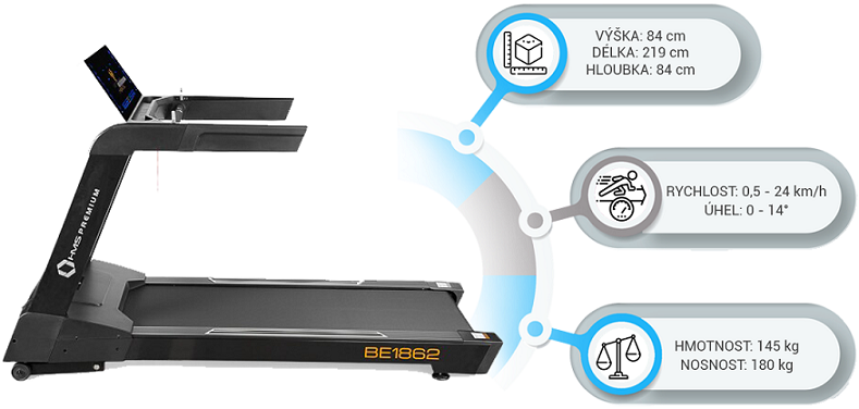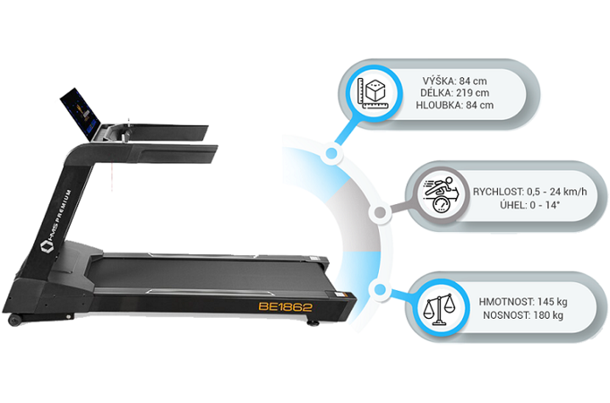 Rýchlosť behúňa je plynule nastaviteľná v rozsahu 0,5 – 24 km/h. Bežecký pás BE1862 je tak vhodný ako pre úplných začiatočníkov, tak aj pre pokročilých bežcov. Pre naozaj náročný tréning je trenažér vybavený elektronickou reguláciou náklonu v rozsahu 0° - 15° a je možné ho plynule nastaviť pomocou tlačidiel na ovládacom paneli.