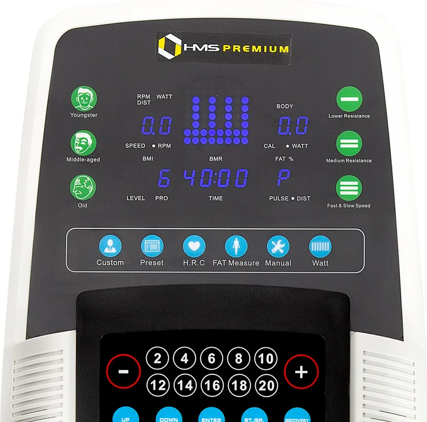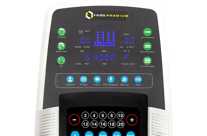 Počítač používa moderný LED displej, ktorý zobrazuje priebeh programu, rýchlosť, vzdialenosť, počet otáčok, spálené kalórie, výkon, tepovú frekvenciu, čas tréningu a pomer tuku v tele. Klávesnica je vybavená všetkými potrebnými tlačidlami pre kompletnú správu tréningu: Naľavo od displeja nájdeme 3 programy, ktoré nastavujú záťaž podľa veku - dorastenec, dospelý, senior. Napravo od displeja sú tlačidlá pre rýchlu zmenu záťaže - malé, stredné, veľké. Pod displejom sú tlačidlá zostávajúcich programov - užívateľský (4), prednastavený (10), HRC, meranie tuku, manuál a Watt. V samostatnom bloku sú tlačidlá "+" a "-" pre plynulú zmenu záťaže, tlačidlá pre skokovú zmenu záťaže a tlačidlá pre nastavenie užívateľských programov a dát o užívateľovi.