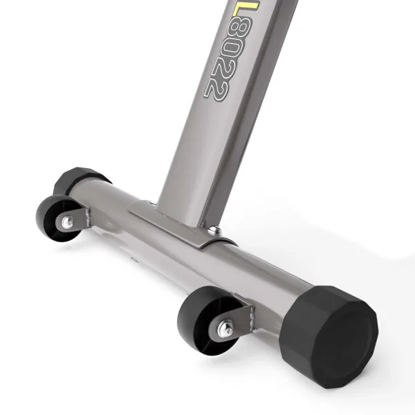 Chrbtová opierka je nastaviteľná do 5 polôh (1 rovná a 4 v negatívnom sklone). Opora vo vodorovnej polohe je ideálna na vykonávanie väčšiny cvikov s činkami, pokiaľ sa opora nastaví do negatívneho uhla, potom získame šikmú lavicu na posilňovanie brucha, na tento účel je L8022 vybavená nastaviteľným, výsuvným rámom so zarážkami, ktorý je výškovo nastaviteľný do 3 polôh a 4 uhlov, zarážka nôh je nastaviteľná do 3 vzdialeností. Rám tak predstavuje hlavnú prednosť lavice a umožňuje precízne nastavenie pre každú postavu, tréning sed-ľahov tak bude bezpečný a pohodlný.