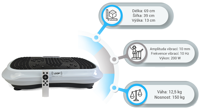 Rozměry vibrační plošiny jsou (dxšxv): 69 x 39 x 13 cm a hmotnost 12,5 kg, takže není problém ji pohodlně uložit pod postel apod., aby nezabírala zbytečný prostor.