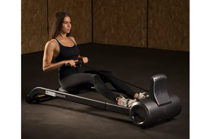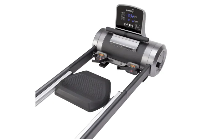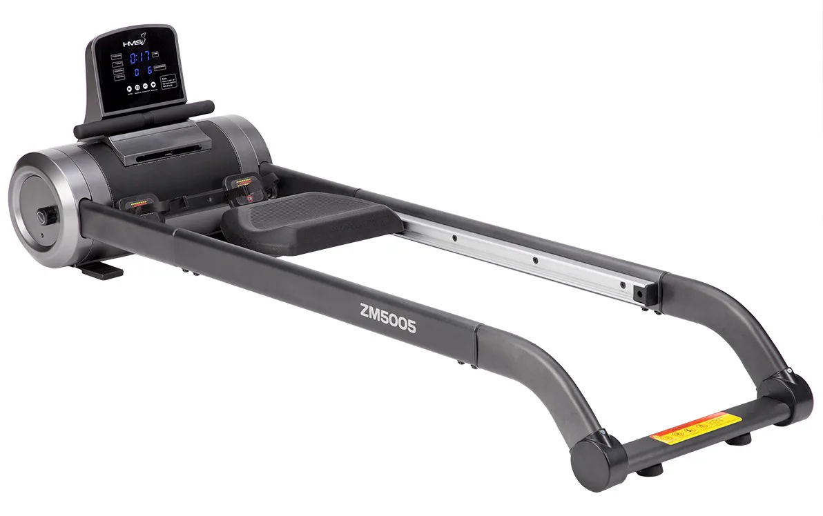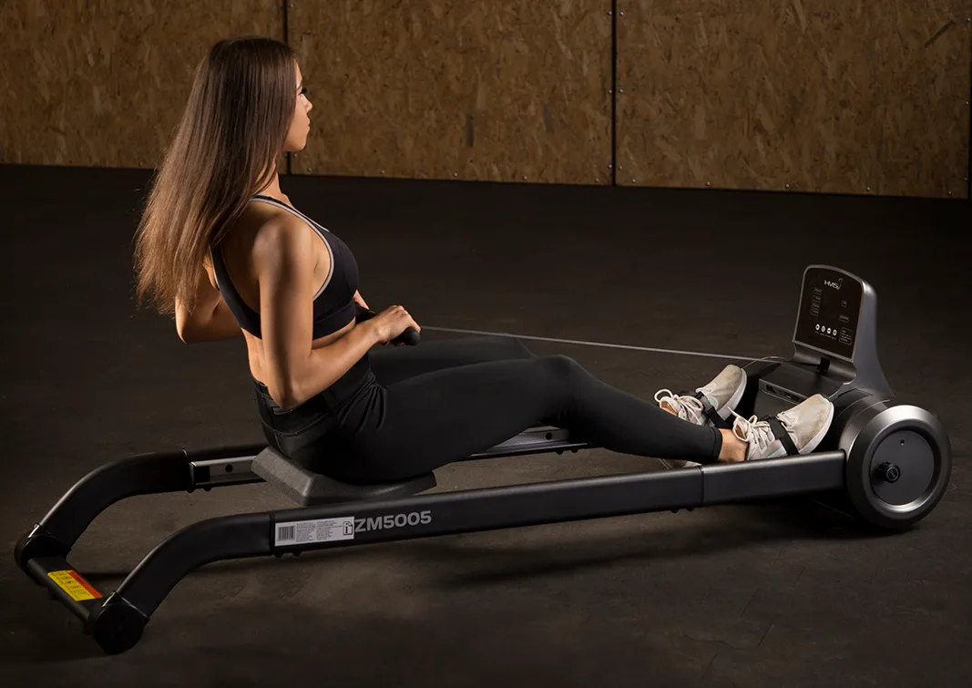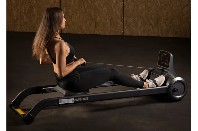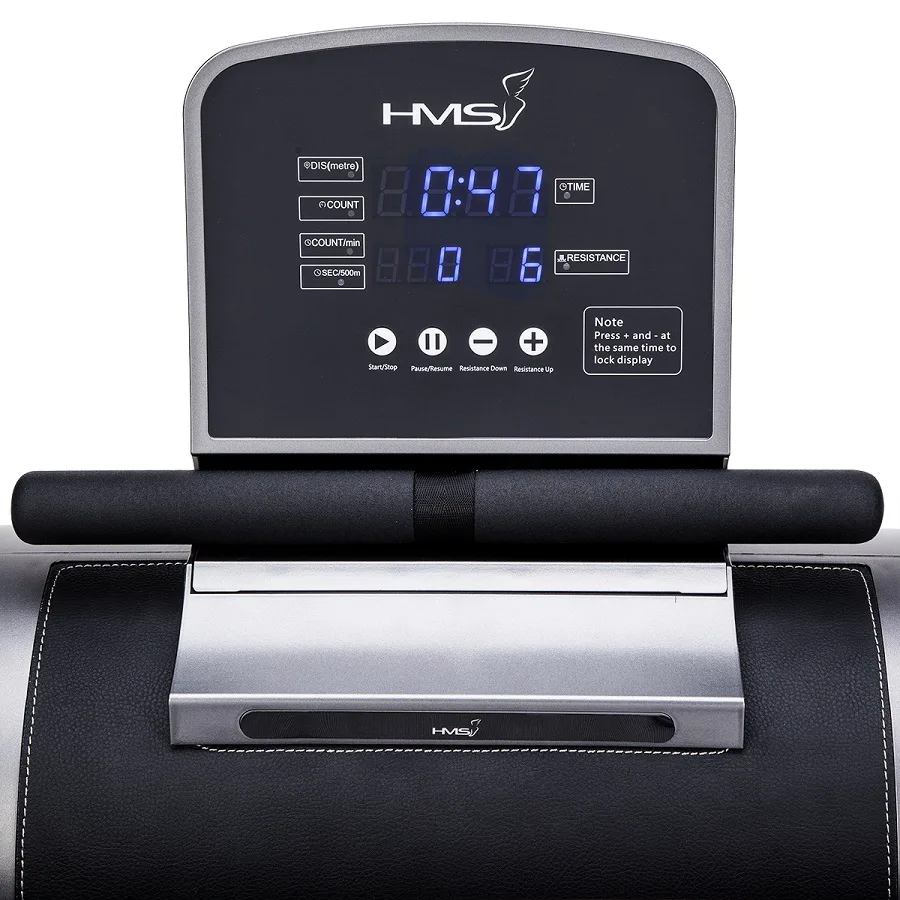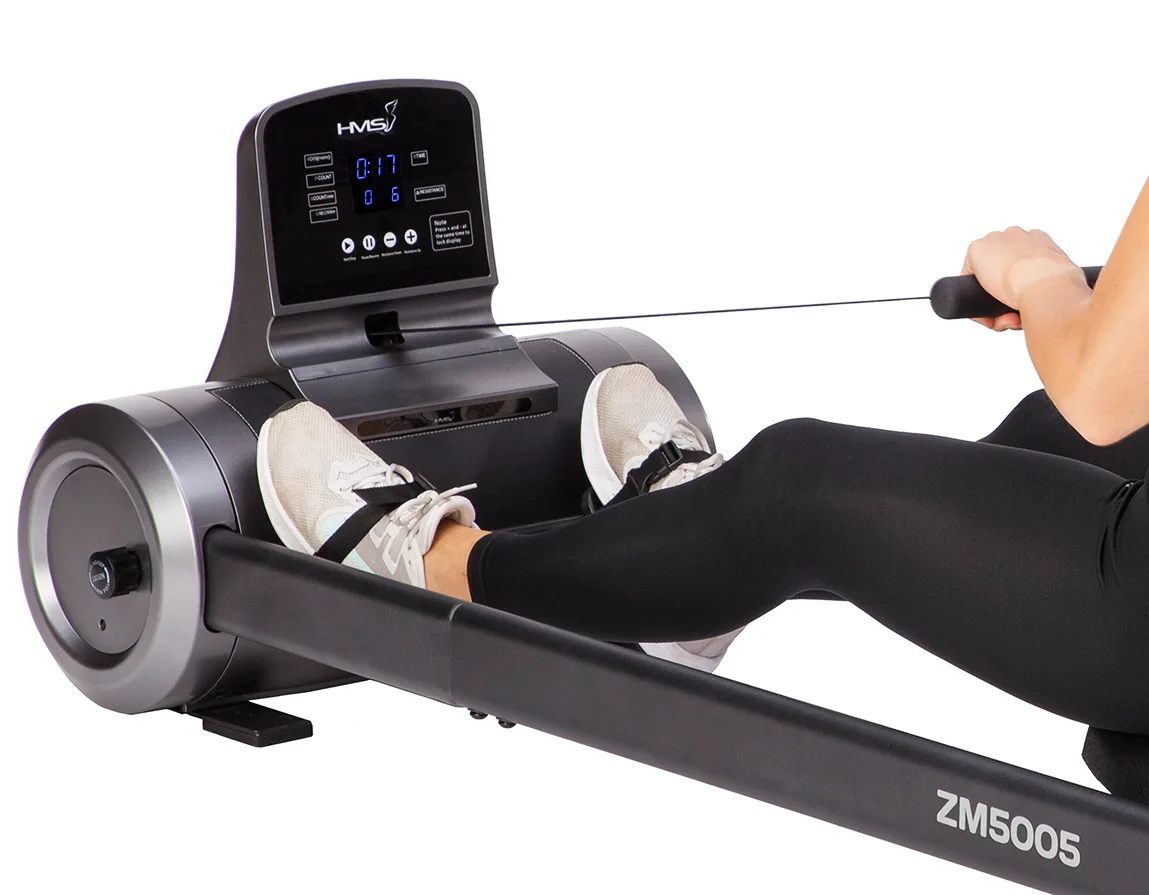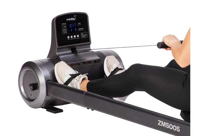 Magnetický veslovací trenažér HMS ZM5005 sa vyznačuje skvelou funkčnosťou, štýlovým dizajnom a možnosťou postavenia do vertikálnej polohy pre úsporu miesta. Systém záťaže tvorí ťažné lano, ktoré sa navíja pomocou pružiny späť do bubna. Pri zatiahnutí za lano sa roztáča 3 kilogramové záťažové koleso, ktorého pohyb je obmedzovaný elektronicky nastaviteľnou magnetickou brzdou. Regulácia záťaže sa ovláda tlačidlami na ovládacom paneli a na výber máte zo 6 úrovní.
