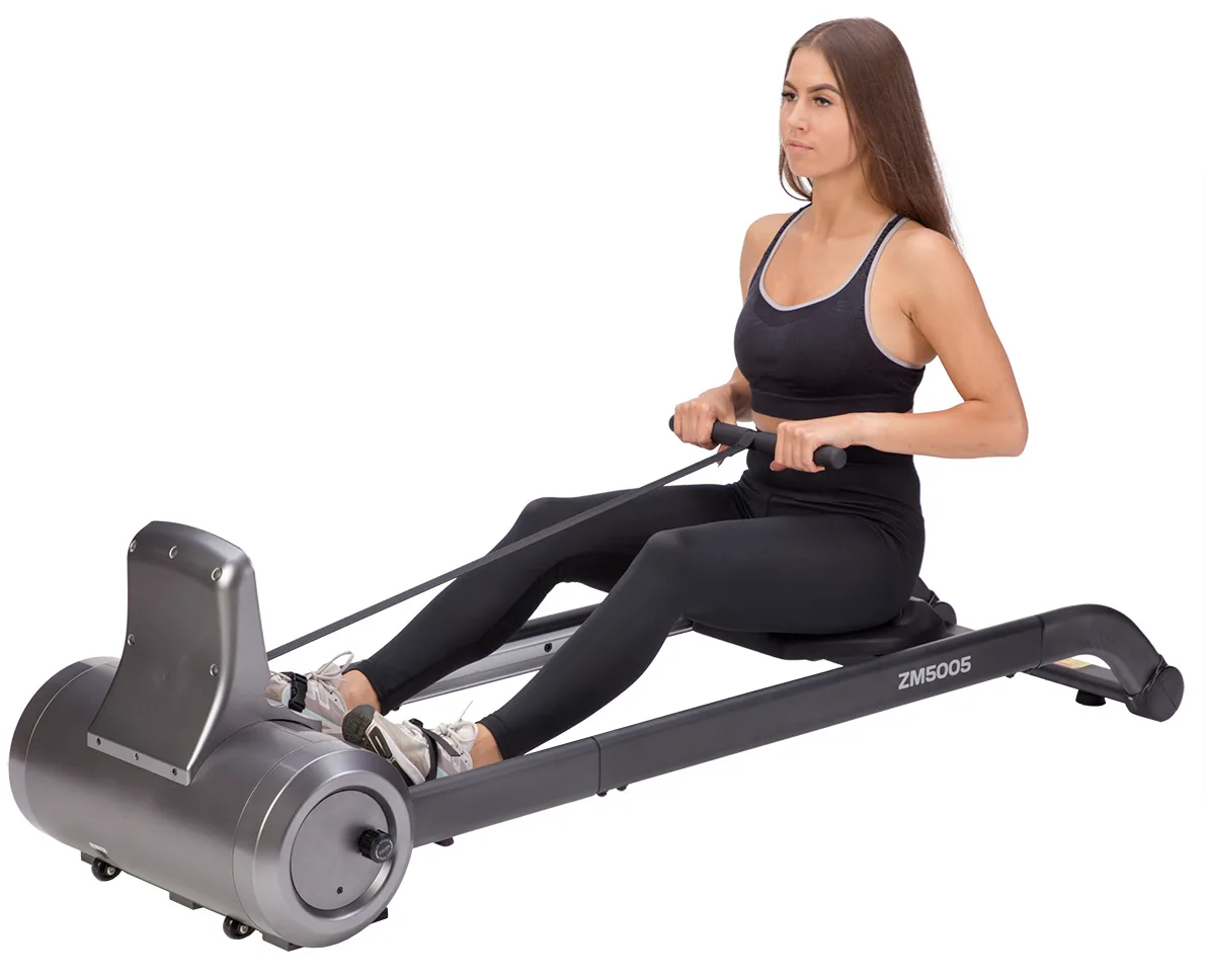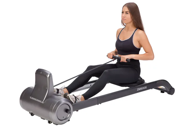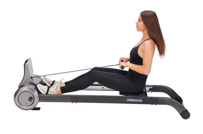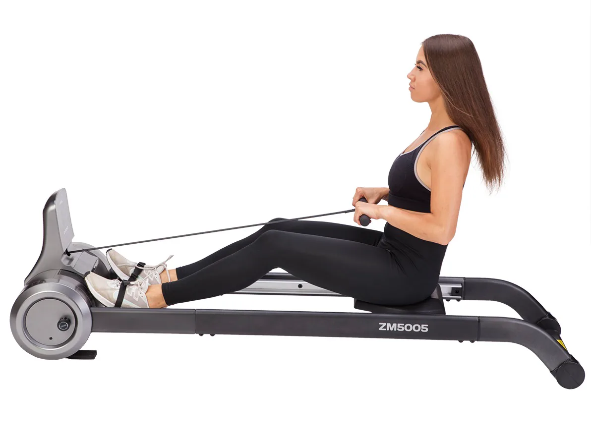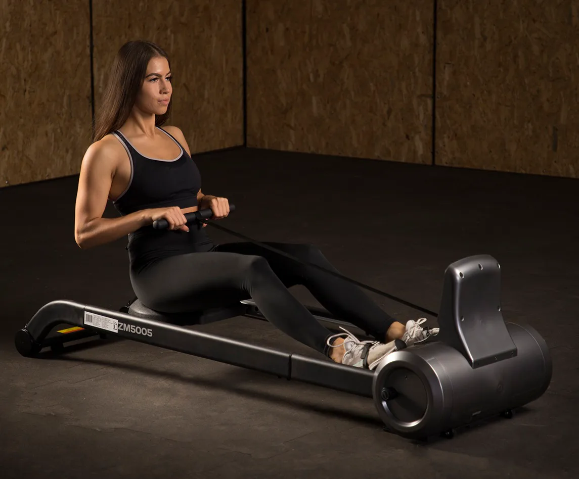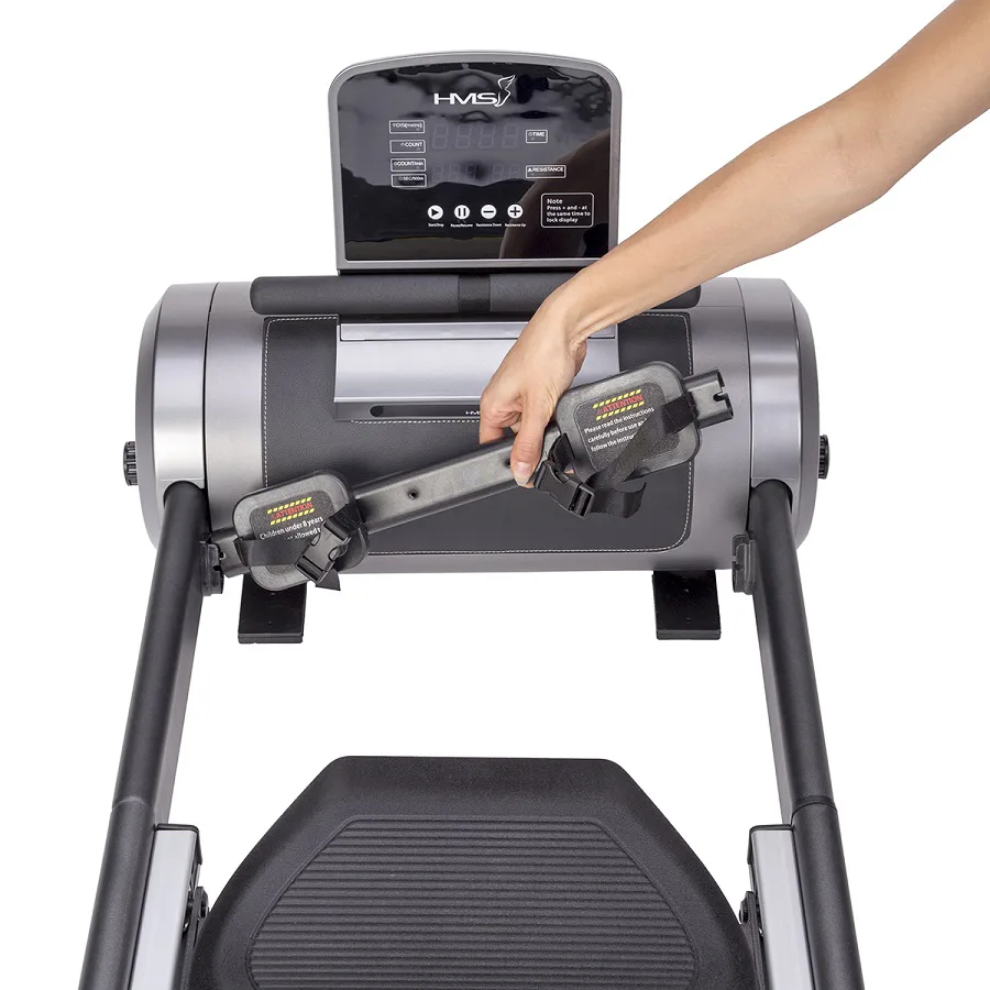 Magnetický veslovací trenažér HMS ZM5005 sa vyznačuje skvelou funkčnosťou, štýlovým dizajnom a možnosťou postavenia do vertikálnej polohy pre úsporu miesta. Systém záťaže tvorí ťažné lano, ktoré sa navíja pomocou pružiny späť do bubna. Pri zatiahnutí za lano sa roztáča 3 kilogramové záťažové koleso, ktorého pohyb je obmedzovaný elektronicky nastaviteľnou magnetickou brzdou. Regulácia záťaže sa ovláda tlačidlami na ovládacom paneli a na výber máte zo 6 úrovní.
