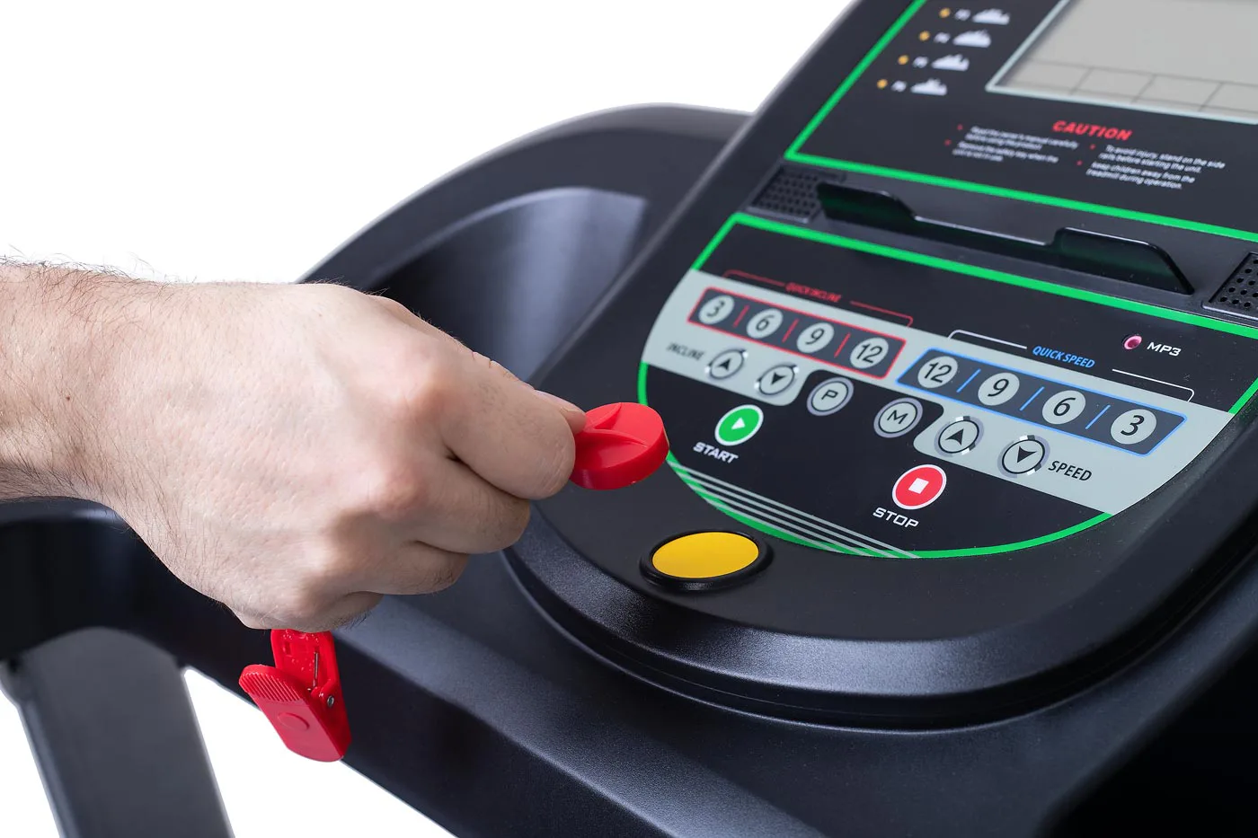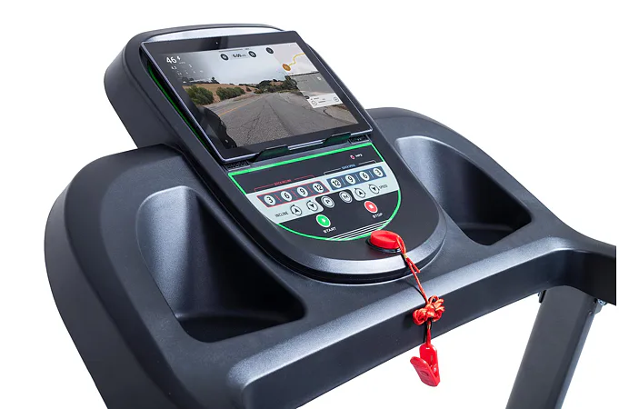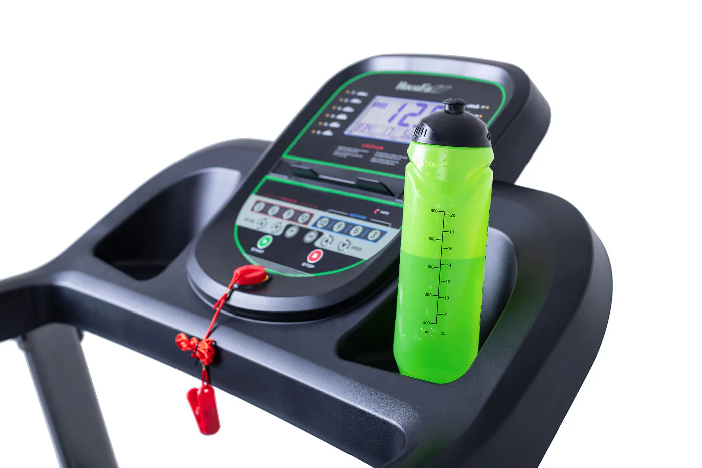 Dále nabízí možnost připojení MP3 pro poslech hudby prostřednictvím vestavěných reproduktorů, 2 držáky na láhev s vodou a bezpečnostní pojistku pro okamžité zastavení pásu.