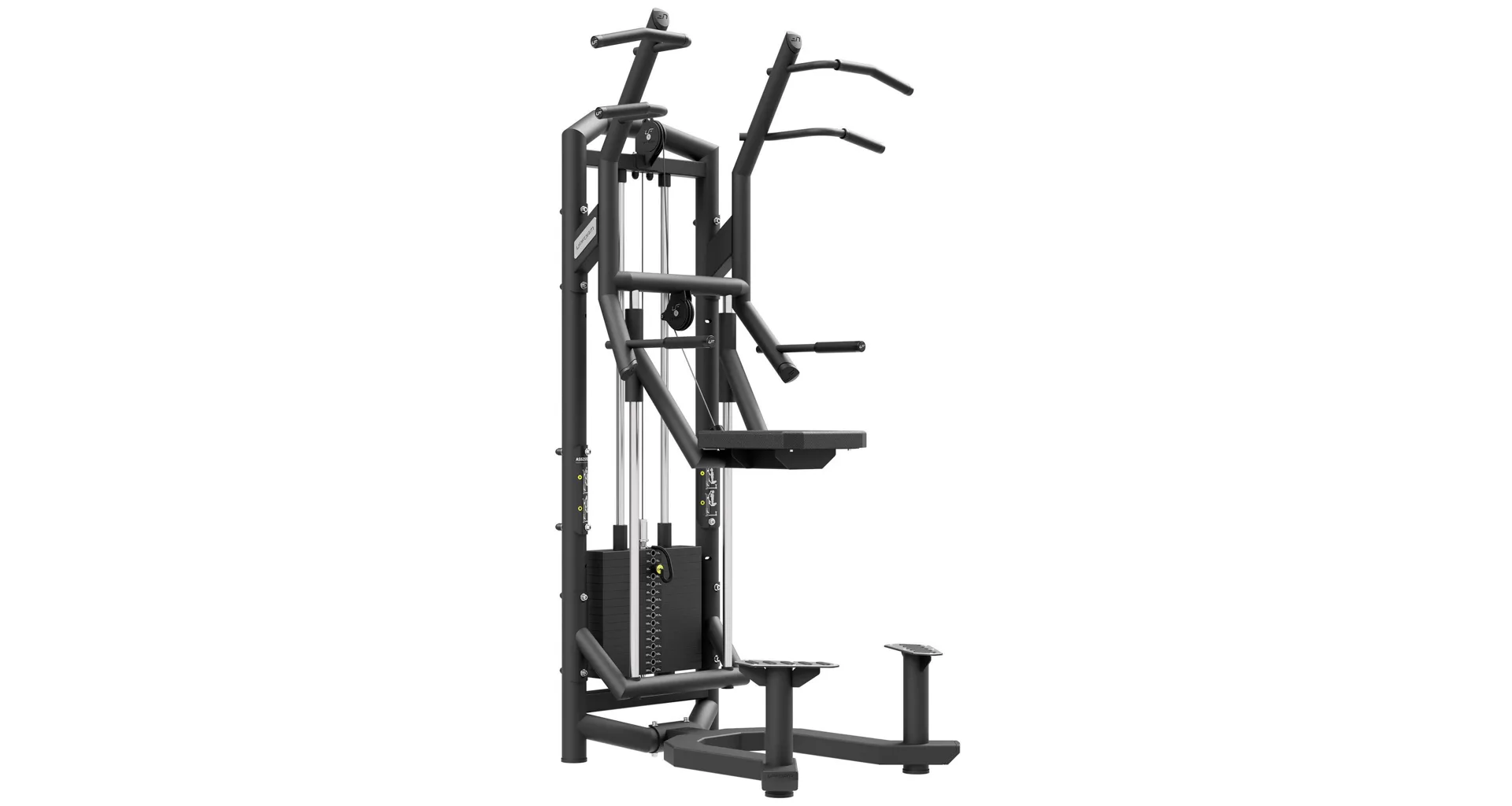 Hrazda s dopomocou UpForm UF-009 je vybavená sadou závažia s 16 tehlami s celkovou hmotnosťou 120 kilogramov odstupňovaných po 7,5 kg. Volič váhy je opatrený nálepkami pre rýchlu voľbu požadovanej záťaže a istiaci čap je pripevnený na lanku, takže nehrozí jeho strata. Dopomoc je pri stanici UF-009 riešená sedákom, ktorý je spojený so závažím a pohybuje sa po 2 nerezových, vodiacich tyčiach. Na sedák bolo použité perforované čalúnenie, ktoré zaisťuje dostatočnú ventiláciu a odvod vlhkosti. Pre ľahké nasadanie je stanovište doplnené o dva robustné, nerezové nášľapy s gumovými plôškami proti pošmyknutiu. Všetky kladky sú schované pod kovovými krytmi s logom UpForm. Oceľové lanko je pokryté čiernym PVC, je zakončené masívnym okom a je odpružené gumovým tlmičom.