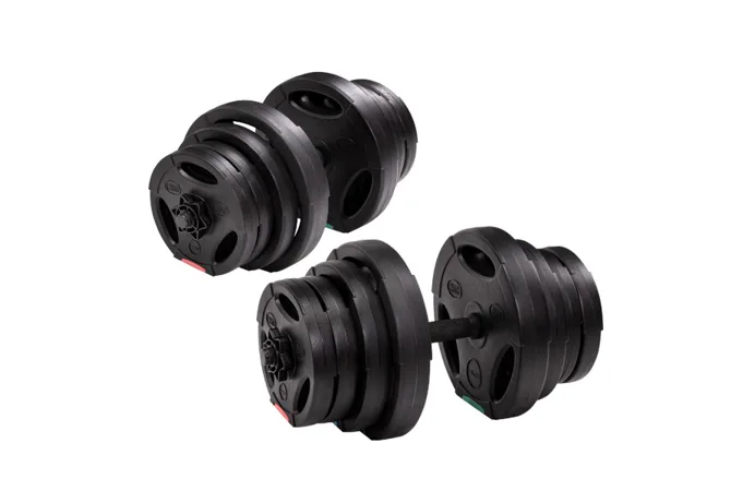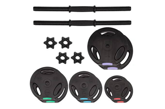 Kotúče sú vyrobené z tvrdého plastu, ktorý je vyplnený cementom. Tŕne jednoručných činiek sú opatrené závitom a závažie je istené hviezdicovými maticami.