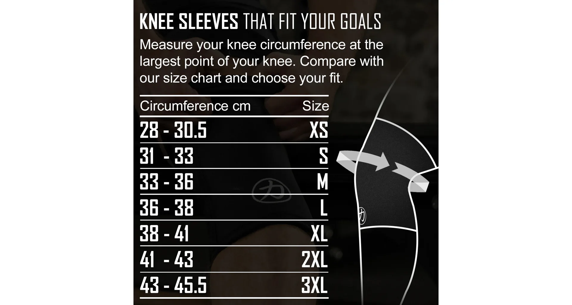 Pre určenie správnej veľkosti zmerajte obvod kolena v najširšom bode a podľa výslednej hodnoty vyberte správnu veľkosť z tabuľky: